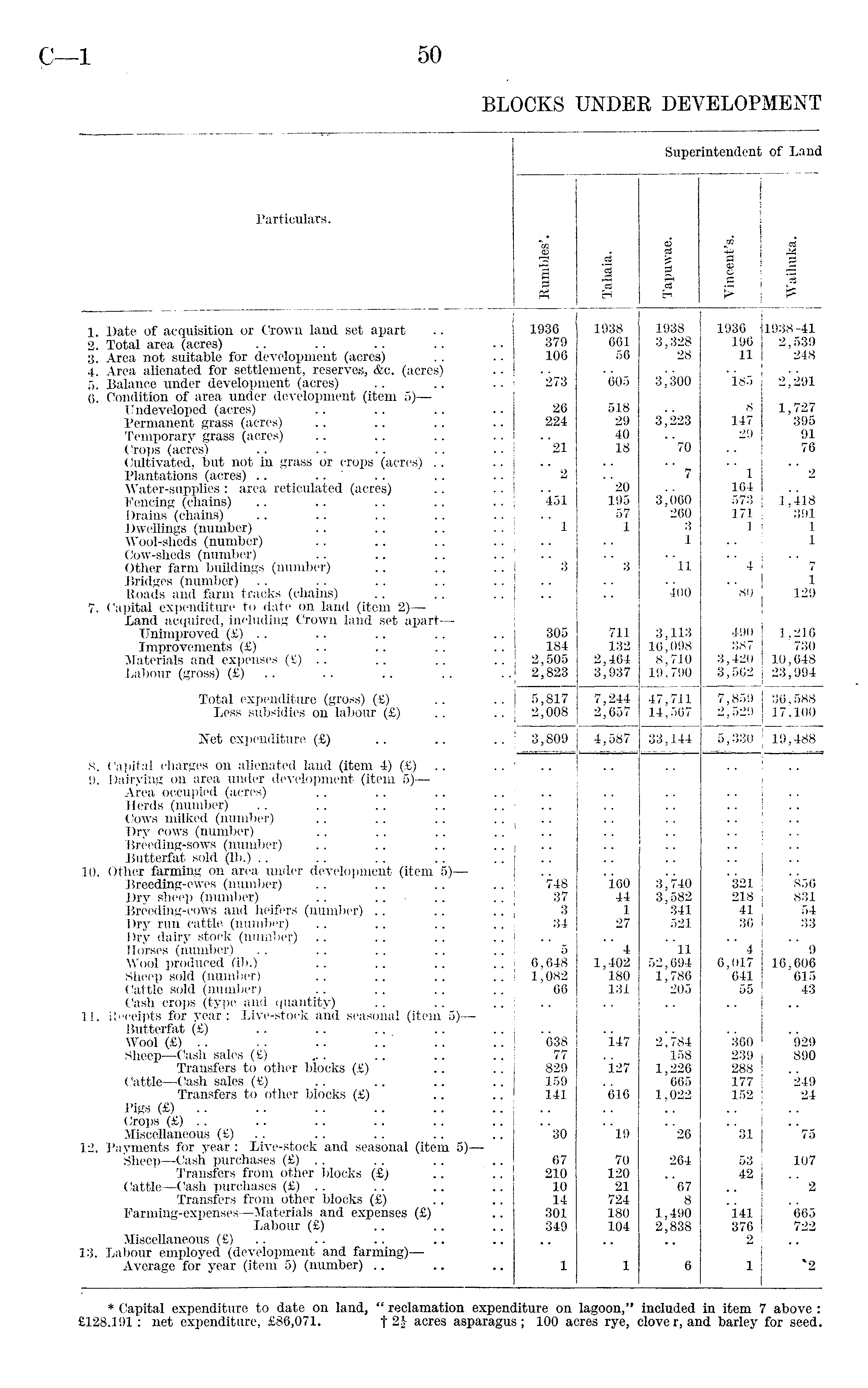 Particulars. Superintendent of Land 3 & P? c3 Jj *3 ai £ 5 61 I i ~a 1 G r* C3 £ "5 1. Date of acquisition or Crown land set apart 2. Total area (acres) 3. Area not suitable for development (acres) 4. Area alienated for settlement, reserves, &c. (acres) 5. Balance under development (acres) 6. Condition of area under development (item 5) — Undeveloped (acres) .. .. :. Permanent grass (acres) Temporary grass (acres) Crops (acres) Cultivated, but not in grass or crops (acres) Plantations (acres) .. Water-supplies : area reticulated (acres) .. Fencing (chains) Drains (chains) Dwellings (number) Wool-sheds (number) Cow-sheds (number) Other farm buildings (number) Bridges (number) Roads and farm tracks (chains) 7. Capital expenditure to date on land (item 2) — Land acquired, including Crown land set apart— Unimproved (£) .. Improvements (£) Materials and expenses (£) .. Labour (gross) (£) Total expenditure (gross) (£) Less subsidies on labour (£) Net expenditure (£) 8. Capital charges on alienated land (item 4) (£) 9. Dairying on area under development (item 5) — Area occupied (acres) Herds (number) Cows milked (number) .. .. Dry cows (number) Breeding-sows (number) Butterfat sold (lb.) 10. Other farming on area under development (item 5) — Breeding-ewes (number) Dry sheep (number) .. Breeding-cows and heifers (number) Dry run cattle (number) .. Dry dairy stock (number) Horses (number) Wool produced (lb.) Sheep sold (number) Cattle sold (number) Cash crops (type and quantity) 11. Receipts for year: Live-stock and seasonal (item 5) — Butterfat (£) Wool (£) .. Sheep—Cash sales (£) Transfers to other blocks (£) Cattle—Cash sales (£) Transfers to other blocks (£) Pigs (£) Crops (£) .. .. .. .. .. Miscellaneous (£) 12. Payments for year: Live-stock and seasonal (item 5) — Sheep—Cash purchases (£) .. .. .. ... Transfers from other blocks (£) .. Cattle —Cash purchases (£) .. Transfers from other blocks (£) Farming-expenses—Materials and expenses (£) Labour -(£) Miscellaneous (£) 13. Labour employed (development and farming)— Average for year (item 5) (number) 1936 379 106 '273 26 224 "21 2 '451 1 " 3 305 184 2,505 2,823 1938 661 56 605 518 29 40 18 "20 195 57 1 3 711 132 2,464 3,937 1938 3,328 28 3," 300 "70 7 260 3 1 ' 11 400 3,113 16,098 8,710 19,790 1936 196 11 185 8 147 29 1 164 573 171 1 "4 ' 80 490 387 3,420 3,562 1938-41 2,539 248 2^291 1,727 395 91 76 2 1 j 418 391 1 1 7 1 129 1,216 730 10,648 23,994 5,817 2,008 7,244 2,657 47,711 14,567 7,859 2,529 36,588 17,100 3,809 4,587 33,144 5,330 19,488 '748 37 3 34 6,648 1,082 66 638 77 829 159 141 "30 67 210 10 14 301 349 1 i60 44 1 27 4 1,402 180 131 "i47 i.27 616 ' 19 70 120 21 724 180 104 1 3,740 3,582 341 521 ' 11 52,694 1,786 205 ■ 158 1,226 665 1,022 "26 264 "67 8 1,490 2,838 6 *321 218 41 36 4 6,017 641 55 360 239 288 177 152 31 53 42 | "i41 376 1 '856 831 54 33 9 16,606 615 43 929 890 *249 24 75 107 2 665 722 *2 * Capital expenditure to date on land, " reclamation expenditure on lagoon," included in item 7 above : £128.191: net expenditure, £86,071. f 2£ acres asparagus; 100 acres rye, clover, and barley for seed.