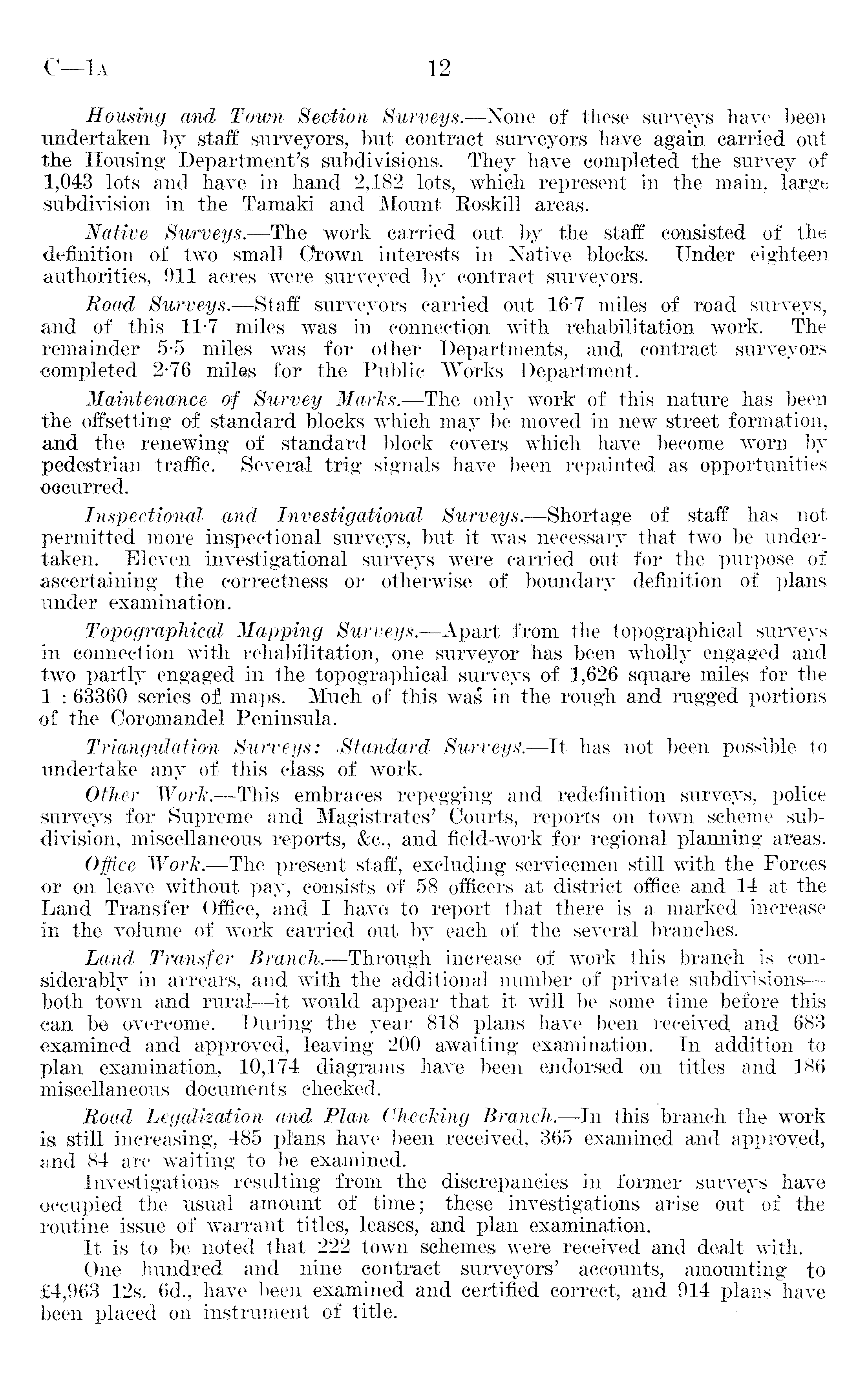 Housing and Town Section Survey's.—None of these surveys have been undertaken by staff surveyors, but contract surveyors have again carried out the Housing Department's subdivisions. They have completed the survey of 1,043 lots and have in hand 2,182 lots, which represent in the main, large subdivision in the Tamaki and Mount Roskill areas. Native Surveys.—The work carried out by the staff consisted of the definition of two small Orown interests in Native blocks. Under eighteen authorities, 911 acres were surveyed by contract surveyors. Road Surveys.—Staff surveyors carried out 16 7 miles of road surveys, and of this 11-7 miles was in connection with rehabilitation work. The remainder 5-5 miles was for other Departments, and contract surveyors completed 2-76 miles for the Public Works Department. Maintenam.ce of Survey Marks.—The only work of this nature has been the offsetting of standard blocks which may be moved in new street formation, and the renewing of standard block covers which have become worn by pedestrian traffic. Several trig signals have been repainted as opportunities occurred. and Investigational Surveys.—Shortage of staff has not permitted more inspectional surveys, but it was necessary that two be undertaken. Eleven investigational surveys were carried out for the purpose of ascertaining the correctness or otherwise of boundary definition of plans under examination. Topographical Mapping Surveys.—Apart from the topographical surveys in connection with rehabilitation, one surveyor has been wholly engaged and two partly engaged in the topographical surveys of 1,626 square miles for the 1 : 63360 series of, maps. Much of this was in the rough and rugged portions of the Coromandel Peninsula. Triangulatkm Surveys: ■Standard Surveys.—lt has not been possible to undertake any of this class of work. Other Work.—This embraces repegging and redefinition surveys, police surveys for Supreme and Magistrates' Courts, reports on town scheme subdivision, miscellaneous reports, &c., and field-work for regional planning areas. Office Work.—The present staff, excluding servicemen still with the Forces or on leave without pay, consists of 58 officers at district office and 14 at the Land Transfer Office, and I have to report that there is a marked increase in the volume of work carried out by each of the several branches. Land Transfer Branch.—Through increase of work this branch is considerably in arrears, and with the additional number of private subdivisions — both town and rural—it would appear that it will be some time before this can be overcome. During the year 818 plans have been received, and 683 examined and approved, leaving 200 awaiting examination. In addition to plan examination, 10,174 diagrams have been endorsed on titles and 186 miscellaneous documents checked. Road Legalization and Plan Checking Branch.—ln this branch the work is still increasing, 485 plans have been received, 365 examined and approved, and 84 are Waiting to be examined. Investigations resulting from the discrepancies in former surveys have occupied the usual amount of time; these investigations arise out of the routine issue of warrant titles, leases, and plan examination. It is to be noted that 222 town schemes were received and dealt with. One hundred and nine contract surveyors' accounts, amounting to £4,963 12s. 6d., have been examined and certified correct, and 914 plans have been placed on instrument of title.