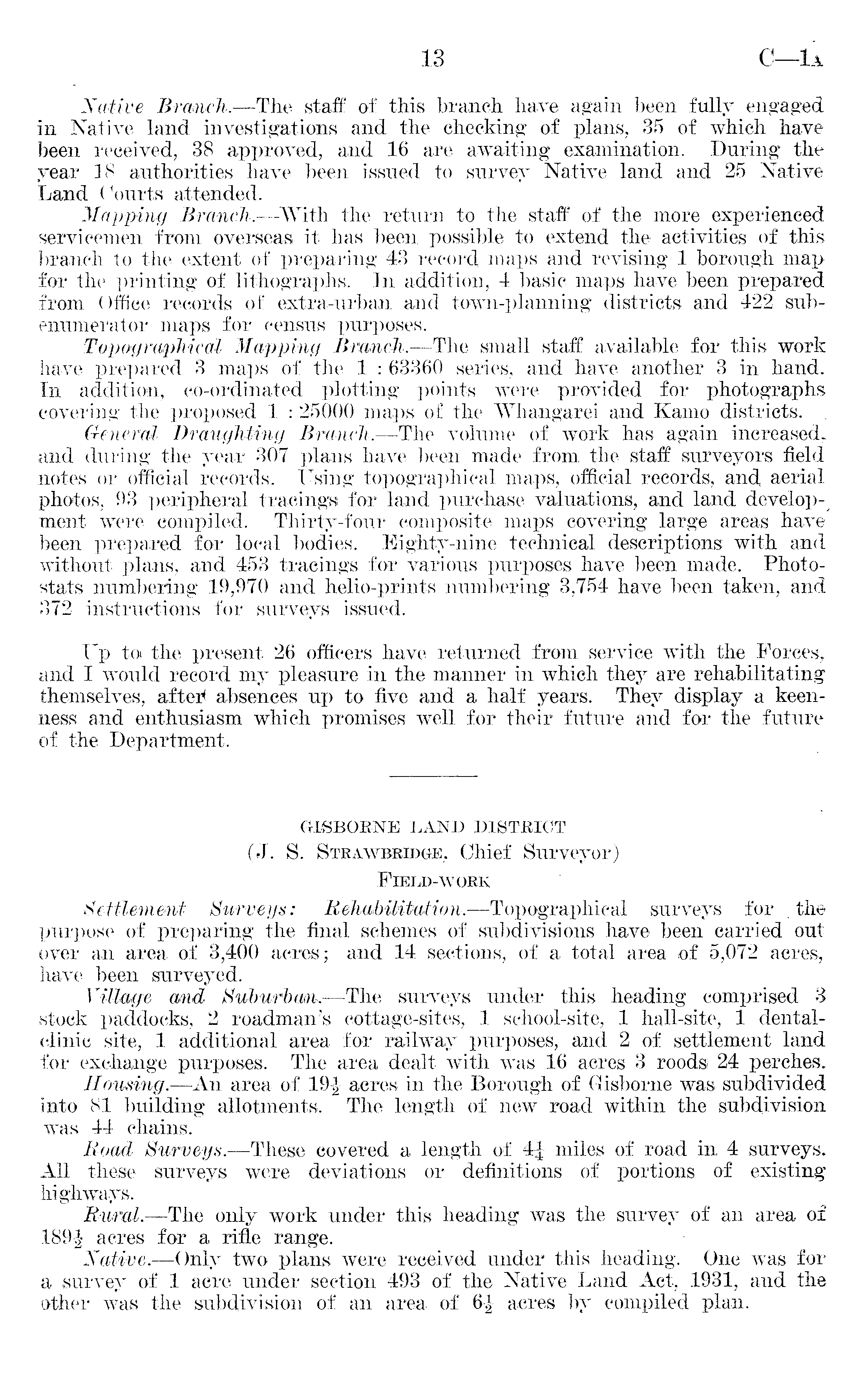 Native Branch. —The staff of this branch have again been fully engaged in Native land investigations and the checking of plans, 35 of which have been received, 38 approved, and 16 are awaiting examination. During the year 18 authorities have been issued to survey Native land and 25 Native Land Courts attended. Mapping Branch.—With the return to the staff of the more experienced servicemen from overseas it has been possible to extend the activities of this branch to the extent of preparing 43 record, maps and revising 1 borough map for the printing of lithographs. In addition, 4 basic maps have been prepared from Office records of extra-urban and town-planning districts and 422 subenumerator maps for census purposes. Topographical Mapping Branch. —The small staff available for this work have prepared 3 maps of the 1 : 63360 series, and have another 3 in hand. In addition, co-ordinated plotting points were provided for photographs covering the proposed 1 : 25000 maps of the Whangarei and Kamo districts. . General Draughting Branch. —The volume of work has again increased, and during the year 307 plans have been made from the staff surveyors field notes or official records. Using topographical maps, official records, and, aerial photos, 93 peripheral tracings! for land purchase valuations, and land development were compiled. Thirty-four composite maps covering large areas have been prepared for local bodies. Eighty-nine technical descriptions with and without plans, and 453 tracings for various purposes have been made. Photostats numbering 19,970 and helio-prints numbering 3,754 have been taken, and 372 instructions for surveys issued. Up to the present 26 officers have returned from service with the Forces, and I would record my pleasure in the manner in which they are rehabilitating themselves, after* absences up to five and a half years. They display a keenness and enthusiasm which promises well for their future and for the future of the Department.
