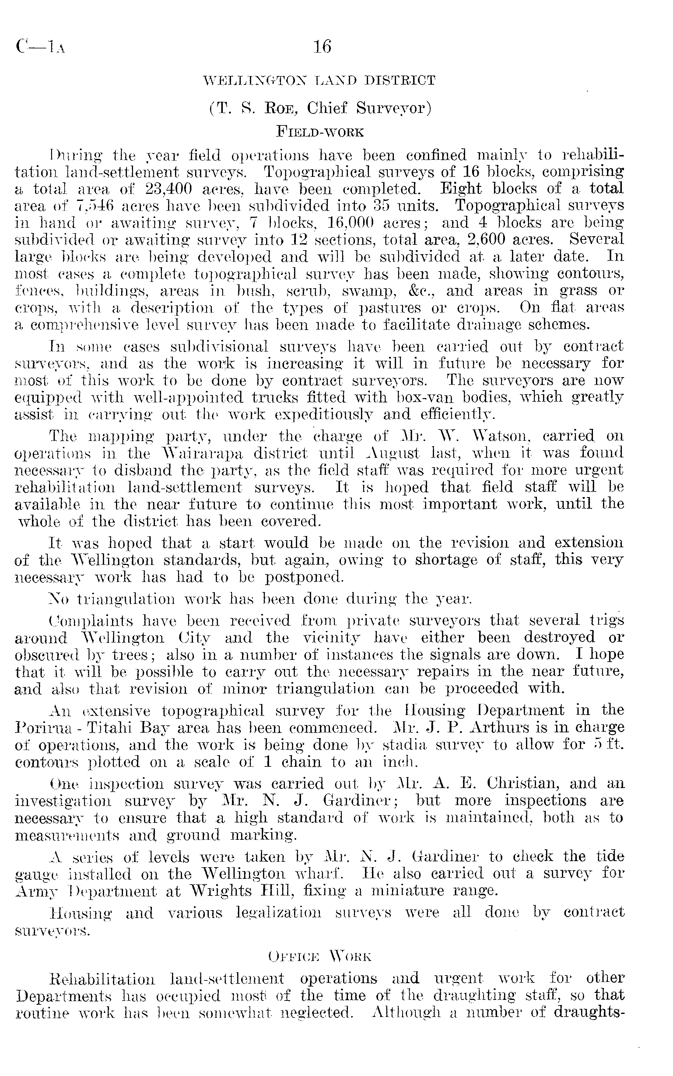 WELLINGTON LAND DISTRICT (T. S. Roe, Chief Surveyor) Field-work During the year field operations have been confined mainly to rehabilitation land-settlement surveys. Topographical surveys of 16 blocks, comprising a total area of 23,400 acres, have been completed. Eight blocks of a total area of 7,546 acres have been subdivided into 35 units. Topographical surveys in hand or awaiting survey, 7 blocks, 16,000 acres ; and 4 blocks are being subdivided or awaiting survey into 12 sections, total area, 2,600 acres. Several large blocks are being developed and will be subdivided at a later date. In most cases a complete topographical survey has been made, showing contours, fences, buildings, areas in bush, scrub, swamp, &c., and areas in grass or crops, with a description of the types of pastures or crops. On flat areas a comprehensive level survey has been made to facilitate drainage schemes. In some cases subdivisional surveys have been carried out by contract surveyors, and as the wor|k is increasing it will in future be necessary for most of this work to be done by contract surveyors. The surveyors are now equipped with well-appointed trucks fitted with box-van bodies, which greatly assist in carrying out the work expeditiously and efficiently: The mapping party, under the charge of Mr. W. Watson, carried, on operations in the Wairarapa district until August last, when it was found necessary to disband the party, as the field staff was required for more urgent rehabilitation land-settlement surveys. It is hoped that field staff will be available in the near future to continue this most important work, until the whole of the district has been covered. It was hoped that a start would be made on the revision and extension of the "Wellington standards, but again, owing to shortage of staff, this very necessary work has had to be postponed. No triangulation work has been done during the year. Complaints have been received from private surveyors that several trigs around Wellington City and the vicinity have either been destroyed or obscured by trees; also in a number of instances the signals are down. I hope that it will be possible to carry out the necessary repairs in the near future, and also that revision of minor triangulation can be proceeded with. An extensive topographical survey for the Housing Department in the Poriraa - Titahi Bay area has been commenced. Mr. J. P. Arthurs is in charge of operations, and the work is being done by stadia survey to allow for 5 ft. contours plotted on a scale of 1 chain to an inch. One inspection survey was carried out by Mr. A. E. Christian, and an investigation survey by Mr. N. J. Gardiner; but more inspections are necessary to ensure that a high standard of work is maintained, both as to measurements and, ground marking. A series of levels were taken by Mr. N. J. Gardiner to check the tide gauge installed on the Wellington wharf. He also carried out a survey for Army Department at Wrights Hill, fixing a miniature range. Housing and various legalization surveys were all done by contract surveyors. Office Work Rehabilitation land-settlement operations and urgent work for other Departments has occupied mosti of the time of the draughting staff, so that routine work has been somewhat neglected. Although a number of draughts-