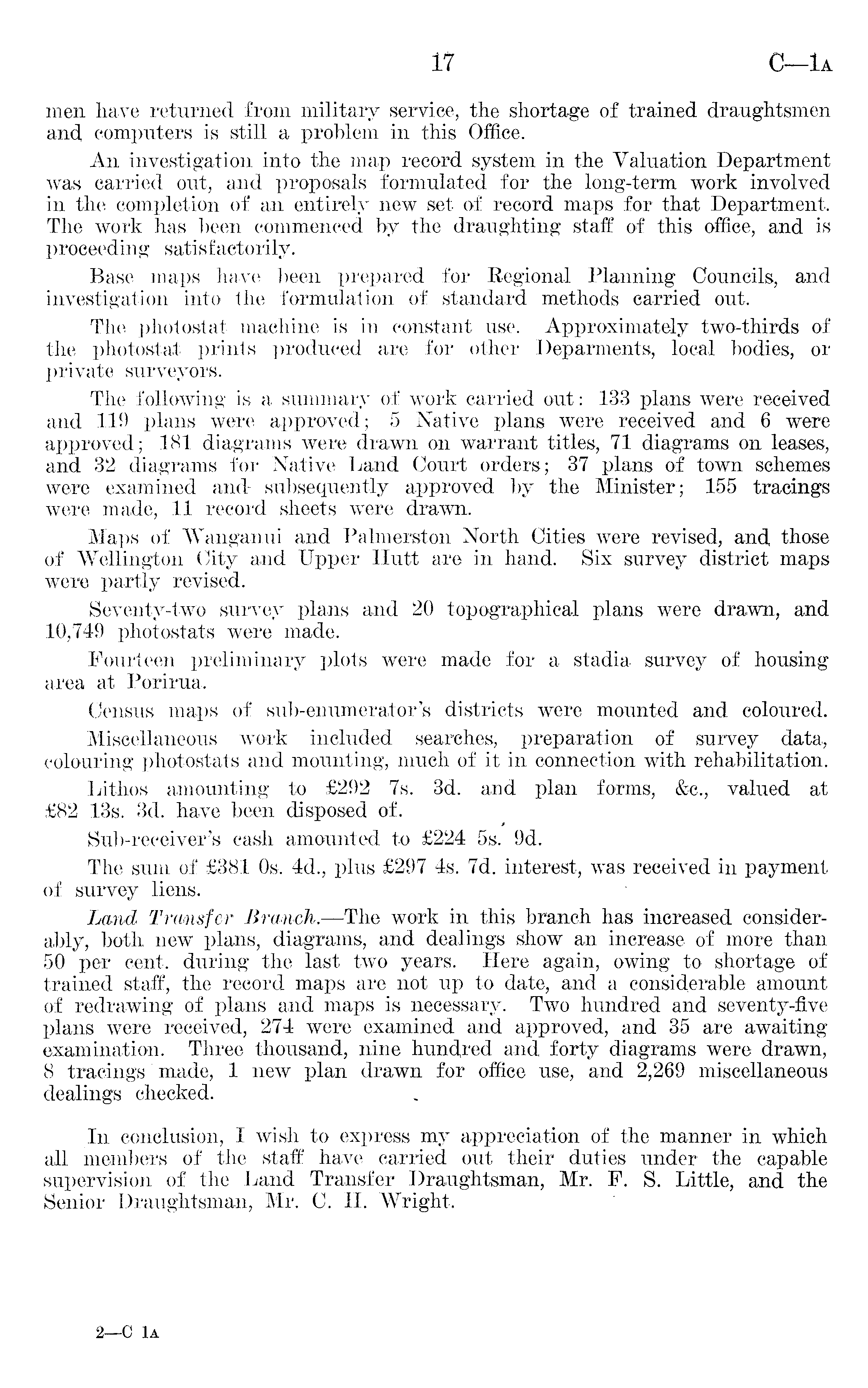 men have returned from military service, the shortage of trained draughtsmen and, computers is still a problem in this Office. An investigation into the map record system in the Valuation Department was carried out, and proposals formulated for the long-term work involved in the completion of an entirely new set of record maps for that Department. The work has been commenced by the draughting staff of this office, and is proceeding satisfactorily. Base maps have been prepared for Regional Planning Councils, and investigation into the formulation of standard methods carried out. The photostat machine is in constant use. Approximately two-thirds of the photostat prints produced are for other Deparments, local bodies, or private surveyors. The following is a summary of work carried out: 133 plans were received and 119 plans were approved; 5 Native plans were received and 6 were approved; 181 diagrams were drawn on warrant titles, 71 diagrams on leases, and 32 diagrams for Native Land Court orders; 37 plans of town schemes were examined and- subsequently approved by the Minister; 155 tracings were made, 11 record sheets were drawn. Maps of Wanganui and Palmerston North Cities were revised, and those of Wellington City and Upper Hutt are in hand. Six survey district maps were partly revised. Seventy-two survey plans and 20 topographical plans were drawn, and 10,749 photostats were made. Fourteen preliminary plots were made for a stadia survey of housing area at Porirua. Census maps of sub-enumerator's districts were mounted and coloured. Miscellaneous work included searches, preparation of survey data, colouring photostats and mounting, much of it in connection with rehabilitation. Lithos amounting to £292 7s. 3d. and plan forms, &c., valued at £B2 13s. 3d. have been disposed of. Sub-receiver's cash amounted to £224 ss. 9d. The sum of £3Bl os. 4d., plus £297 4s. 7d. interest, was received in payment of survey liens. Land Transfer Branch.—The work in this branch has increased considerably, both new plans, diagrams, and dealings show an increase of more than 50 per cent, during the last two years. Here again, owing to shortage of trained staff, the record maps are not up to date, and a considerable amount of redrawing of plans and maps is necessary. Two hundred and seventy-five plans were received, 274 were examined and approved, and 35 are awaiting examination. Three thousand, nine hundred and forty diagrams were drawn, 8 tracings made, 1 new plan drawn for office use, and 2,269 miscellaneous dealings checked. In conclusion, I wish to express my appreciation of the manner in which all members of the staff have carried out their duties under the capable supervision of the Land Transfer Draughtsman, Mr. F. S. Little, and the Senior Draughtsman, Mr. C. H. Wright.