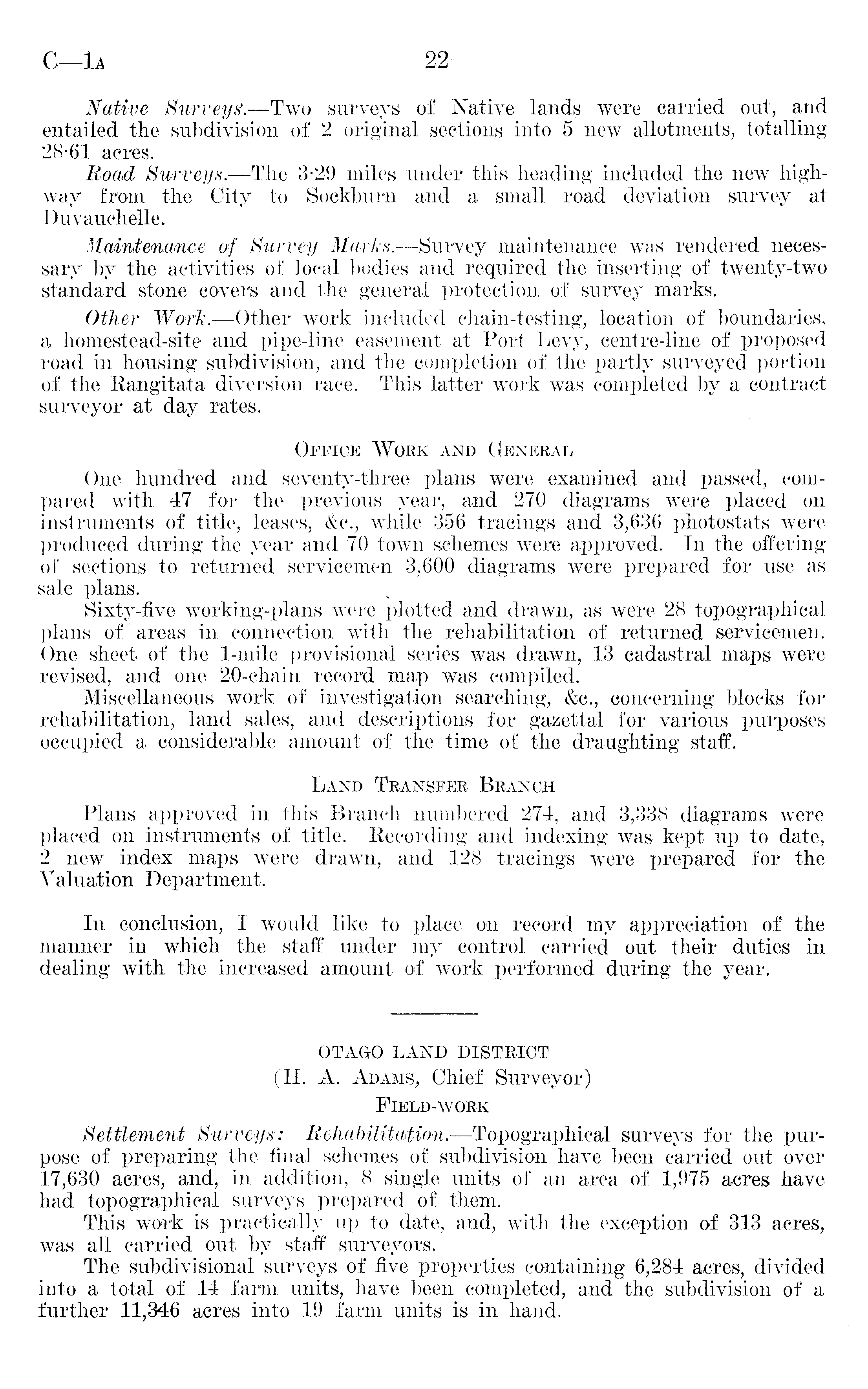 Native Surveys'.—Two surveys of Native lands were carried out, and entailed the subdivision of 2 original sections into 5 new allotments, totalling 28-61 acres. Road Surveys.—The 3-29 miles under this heading included the new highway from the City to Sockburn and a small road deviation survey at Duvauchelle. Maintenance of Survey Marks.—Survey maintenance was rendered necessary by the activities of local bodies and required the inserting of twenty-two standard stone covers and the general protection of survey marks. Other Work.—Other work included chain-testing, location of boundaries, a homestead-site and pipe-line easement at Port. Levy, centre-line of proposed road in housing subdivision, and the completion of the partly surveyed portion of the Rangitata diversion race. This latter work was completed by a contract surveyor at day rates. Office Work and General One hundred and seventy-three plans were examined and passed, compared with 47 for the previous year, and 270 diagrams were placed on instruments of title, leases, &c., while 356 tracings and 3,636 photostats were produced during the year and 70 town schemes were approved. In the offering of sections to returned, servicemen 3,600 diagrams were prepared for use as sale plans. Sixty-five working-plans were plotted and drawn, as were 28 topographical plans of areas in connection with the rehabilitation of returned servicemen. One sheet of the 1-mile provisional series was drawn, 13 cadastral maps were revised, and one 20-chain record map was compiled. Miscellaneous work of investigation searching, &c., concerning blocks for rehabilitation, land sales, and descriptions for gazettal for various purposes occupied a considerable amount of the time of the draughting staff. Land Transfer Branch Plans approved in this Branch numbered 274, and 3,338 diagrams were placed on instruments of title. Recording and indexing was kept up to date, 2 new index maps were drawn, and 128 tracings were prepared for the Valuation Department. In conclusion, I would like to place on record my appreciation of the manner in which the staff under my control carried out their duties in dealing with the increased amount of work performed during the year.