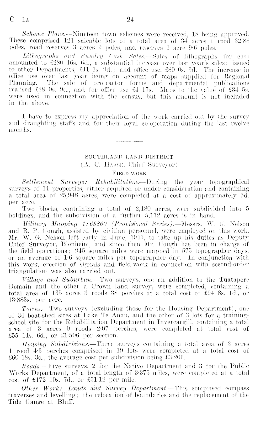 SOUTHLAND LAND DISTRICT (A. C. Haase, Chief Surveyor) Field-work Settlement Surveys: Rehabilitation. —During the year topographical surveys of 14 properties, either acquired or under consideration and containing a total area of 25,948 acres, were completed at a cost of approximately sd. per acre. Two blocks, containing a total of 2,180 acres, were subdivided into 5 holdings, and the subdivision of a further 5,172 acres is in hand. Military Mapping 1:63360 (Provisional Series). —Messrs. W. G. Nelson and R, P. (lough, assisted by civilian personnel, were employed on this work. Mr. W. G. Nelson left early in June, 1945, to take up his duties as Deputy Chief Surveyor, Blenheim, and since then Mr. Gough has been in charge of the field operations; 945 square miles were mapped in 575 topographer days, or an average of 1-6 square miles per topographer day. In conjunction with this work, erection of signals and field-work in connection with second-order triangulation was also carried out. Village and Suburban.—Two surveys, one an addition to the Tuatapere Domain and the other a Crown land survey, were completed, containing a total area of 135 acres 3 roods 38 perches at a total cost of £94 Bs. Id., or 13-883s. per acre. Towns. —Two surveys (excluding those for the Housing Department), one of 34 boat-shed sites at Lake Te Anau, and the other of 3 lots for a trainingschool site for the Rehabilitation Department in Invereargill, containing a total area of 3 acres 0 roods 2-07 perches, were completed at total cost of £55 14s. 6d., or £l-506 per section. Housing Subdivisions. —Three surveys containing a total area of 3 acres 1 rood 4-3 perches comprised in 19 lots were completed at a total cost of £6O 18s. 3d., the average cost per subdivision being £3-206. Roads. —Five surveys, 2 for the Native Department and 3 for the Public Works Department, of a total length of 3-375 miles, were completed at a total cost of £172 10s. 7d., or £5l-12 per mile. Other Work: Lands akd Survey Department.—This comprised compass traverses and levelling; the relocation of boundaries and the replacement of the Tide Gauge at Bluff.