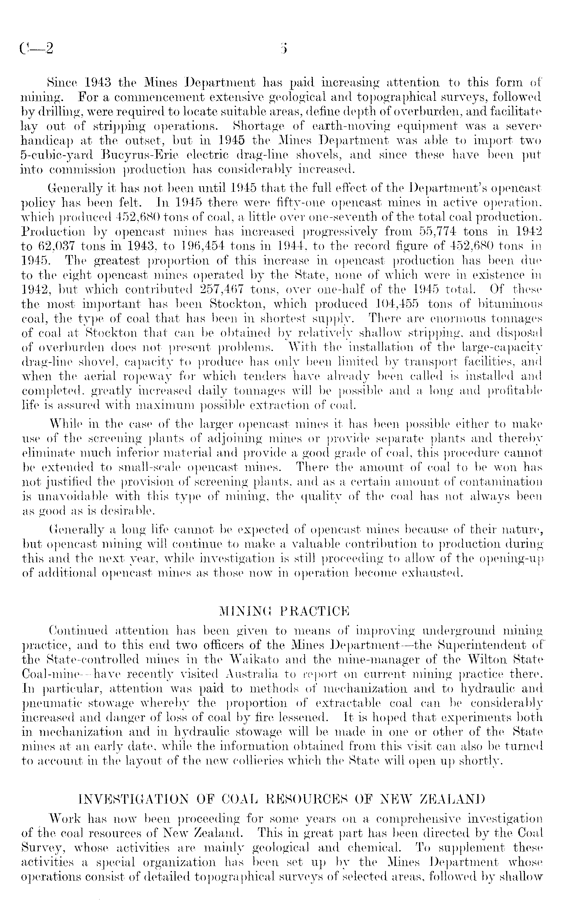 Since 1943 the Mines Department has paid increasing attention to this form of mining. For a commencement extensive geological and topographical surveys, followed by drilling, were required to locate suitable areas, define depth of overburden, and facilitate lay out of stripping operations. Shortage of earth-moving equipment was a severe handicap at the outset, but in 1945 the Mines Department was able to import two 5-cubic-yard Bucyrus-Erie electric drag-line shovels, and since these have been put into commission production has considerably increased. Generally it has not been until 1945 that the full effect of the Department's opencast policy has been felt. In 1945 there were fifty-one opencast mines in active operation r which produced 452,680 tons of coal, a little over one-seventh of the total coal production. Production by opencast mines has increased progressively from 55,774 tons in 1942' to 62,037 tons in 1943, to 196,454 tons in 1944, to the record figure of 452,680 tons in 1945. The greatest proportion of this increase in opencast production has been due to the eight opencast mines operated by the State, none of which were in existence in 1942, but which contributed 257,467 tons, over one-half of the 1945 total. Of these the most important has been Stockton, which produced 104,455 tons of bituminous coal, the type of coal that has been in shortest supply. There are enormous tonnages of coal at Stockton that can be obtained by relatively shallow stripping, and disposal of overburden does not present problems. With the installation of the large-capacity drag-line shovel, capacity to produce has only been limited by transport facilities, and when the aerial ropeway for which tenders have already been called is installed and completed, greatly increased daily tonnages will be possible and a long and profitable life is assured with maximum possible extraction of coal. While in the case of the larger opencast mines it has been possible either to make use of the screening plants of adjoining mines or provide separate plants and thereby eliminate much inferior material and provide a good grade of coal, this procedure cannot be extended to small-scale opencast mines. There the amount of coal to be won has not justified the provision of screening plants, and as a certain amount of contamination is unavoidable with this type of mining, the quality of the coal has not always been as good as is desirable. Generally a long life cannot be expected of opencast mines because of their nature,, but opencast mining will continue to make a valuable contribution to production during this and the next year, while investigation is still proceeding to allow of the opening-up of additional opencast mines as those now in operation become exhausted. MINING PRACTICE Continued attention has been given to means of improving underground mining practice, and to this end two officers of the Mines Department—the Superintendent of the State-controlled mines in the Waikato and the mine-manager of the Wilton State Coal-mine —have recently visited Australia to report on current mining practice there. In particular, attention was paid to methods of mechanization and to hydraulic and pneumatic stowage whereby the proportion of extractable coal can be considerably increased and danger of loss of coal by fire lessened. It is hoped that experiments both in mechanization and in hydraulic stowage will be made in one or other of the State mines at an early date, while the information obtained from this visit can also be turned to account in the layout of the new collieries which the State will open up shortly. INVESTIGATION OF COAL RESOURCES OF NEW ZEALAND Work has now been proceeding for some years on a comprehensive investigation of the coal resources of New Zealand. This in great part has been directed by the Coal Survey, whose activities are mainly geological and chemical. To supplement these activities a special organization has been set up by the Mines Department whose operations consist of detailed topographical surveys of selected areas, followed by shallow