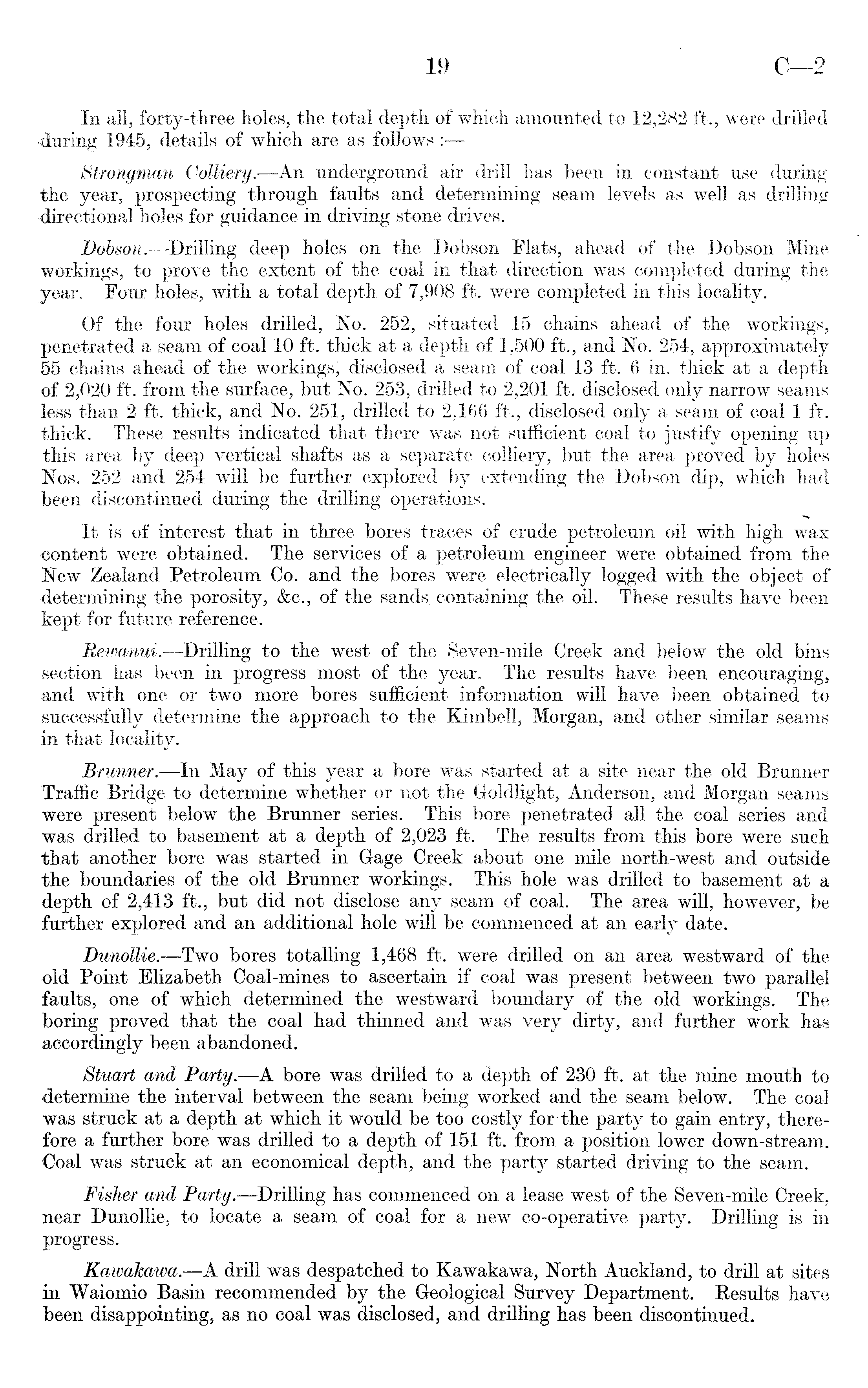 In all, forty-three holes, the total depth of which amounted to 12,282 ft., were drilled -during 1945, details of which are as follows : Strongman Colliery. —An underground air drill has been in constant use during the year, prospecting through faults and determining seam levels as well as drilling directional holes for guidance in driving stone drives. Dobson. —Drilling deep holes on the Dobson Flats, ahead of the Dobson Mine workings, to prove the extent of the coal in that direction was completed during the year. Four holes, with a total depth of 7,908 ft. were completed in this locality. Of the four holes drilled, No. 252, situated 15 chains ahead of the workings, penetrated a seam of coal 10 ft. thick at a depth of 1,500 ft., and No. 254, approximately 55 chains ahead of the workings, disclosed a seam of coal 13 ft. 6 in. thick at a depth of 2,020 ft. from the surface, but No. 253, drilled to 2,201 ft. disclosed only narrow seams less than 2 ft. thick, and No. 251, drilled to 2,166 ft., disclosed only a seam of coal 1 ft. thick. These results indicated that there was not sufficient coal to justify opening up this area by deep vertical shafts as a separate colliery, but the area proved by holes Nos. 252 and 254 will be further explored by extending the Dobson dip, which had been discontinued during the drilling operations. It is of interest that in three bores traces of crude petroleum oil with high wax content were obtained. The services of a petroleum engineer were obtained from the New Zealand Petroleum Co. and the bores were electrically logged with the object of determining the porosity, &c., of the sands, containing the oil. These results have been kept for future reference. Rewanui. —Drilling to the west of the Seven-mile Creek and below the old bins section has been in progress most of the year. The results have been encouraging, a,nd with one or two more bores sufficient information will have been obtained to successfully determine the approach to the Kimbell, Morgan, and other similar seams in that locality. Brunner. —In May of this year a bore was started at a site near the old Brunner Traffic Bridge to determine whether or not the Goldlight, Anderson, and Morgan seams were present below the Brunner series. This bore penetrated all the coal series and was drilled to basement at a depth of 2,023 ft. The results from this bore were such that another bore was started in Gage Creek about one mile north-west and outside the boundaries of the old Brunner workings. This hole was drilled to basement at a depth of 2,413 ft., but did not disclose any seam of coal. The area will, however, be further explored and an additional hole will be commenced at an early date. Dunollie. —Two bores totalling 1,468 ft. were drilled on an area westward of the old Point Elizabeth Coal-mines to ascertain if coal was present between two parallel faults, one of which determined the westward boundary of the old workings. The boring proved that the coal had thinned and was very dirty, and further work has accordingly been abandoned. Stuart and Party.—A bore was drilled to a depth of 230 ft. at the mine mouth to determine the interval between the seam being worked and the seam below. The coal was struck at a depth at which it would be too costly for the party to gain entry, therefore a further bore was drilled to a depth of 151 ft. from a position lower down-stream. Coal was struck at an economical depth, and the party started driving to the seam. Fisher and Party.—Drilling has commenced on a lease west of the Seven-mile Creek, near Dunollie, to locate a seam of coal for a new co-operative party. Drilling is in progress. Kawakawa.—A drill was despatched to Kawakawa, North Auckland, to drill at sites in Waiomio Basin recommended by the Geological Survey Department. Results have been disappointing, as no coal was disclosed, and drilling has been discontinued.