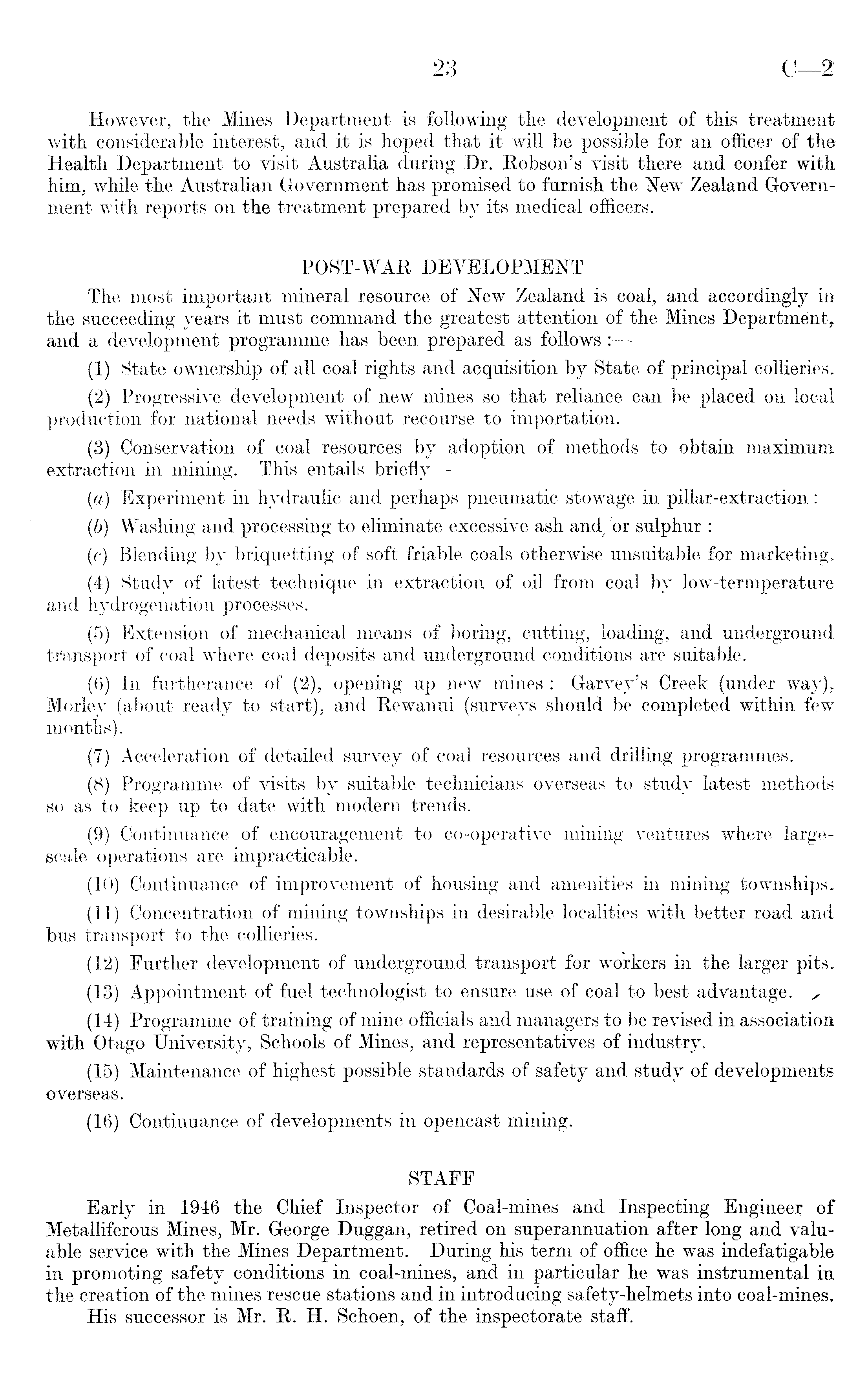 However, the Mines Department is following the development of this treatment with considerable interest, and it is hoped that it will be possible for an officer of the Health Department to visit Australia during Dr. Robson's visit there and confer with him, while the Australian Government has promised to furnish the New Zealand Government with reports on the treatment prepared by its medical officers. POST-WAR DEVELOPMENT The most important mineral resource of New Zealand is coal, and accordingly in the succeeding years it must command the greatest attention of the Mines Department, and a development programme has been prepared as follows: — (1) State ownership of all coal rights and acquisition by State of principal collieries. (2) Progressive development of new mines so that reliance can be placed on local production for national needs without recourse to importation. (3) Conservation of coal resources by adoption of methods to obtain maximum extraction in mining. This entails briefly—(a) Experiment in hydraulic and perhaps pneumatic stowage in pillar-extraction: (b) Washing and processing to eliminate excessive ash and/or sulphur : (c) Blending by briquetting of soft friable coals otherwise unsuitable for marketing. (4) Study of latest technique in extraction of oil from coal by low-termperature and hydrogenation processes. (5) Extension of mechanical means of boring, cutting, loading, and underground transport of coal where coal deposits and underground conditions are suitable. (6) In furtherance of (2), opening up new mines : Garvey's Creek (under way), Morley (about ready to start), and Rewanui (surveys should be completed within few months). (7) Acceleration of detailed survey of coal resources and drilling programmes. (8) Programme of visits by suitable technicians overseas to study latest methods so as to keep up to date with modern trends. (9) Continuance of encouragement to co-operative mining ventures where largescale operations are impracticable. (10) Continuance of improvement of housing and amenities in mining townships. (11) Concentration of mining townships in desirable localities with better road and bus transport to the collieries. (12) Further development of underground transport for workers in the larger pits. (13) Appointment of fuel technologist to ensure use of coal to best advantage. (14) Programme of training of mine officials and managers to be revised in association with Otago University, Schools of Mines, and representatives of industry. (15) Maintenance of highest possible standards of safety and study of developments overseas. (16) Continuance of developments in opencast mining. STAFF Early in 1946 the Chief Inspector of Coal-mines and Inspecting Engineer of Metalliferous Mines, Mr. George Duggan, retired on superannuation after long and valuable service with the Mines Department. During his term of office he was indefatigable in promoting safety conditions in coal-mines, and in particular he was instrumental in the creation of the mines rescue stations and in introducing safety-helmets into coal-mines. His successor is Mr. R. H. Schoen, of the inspectorate staff.