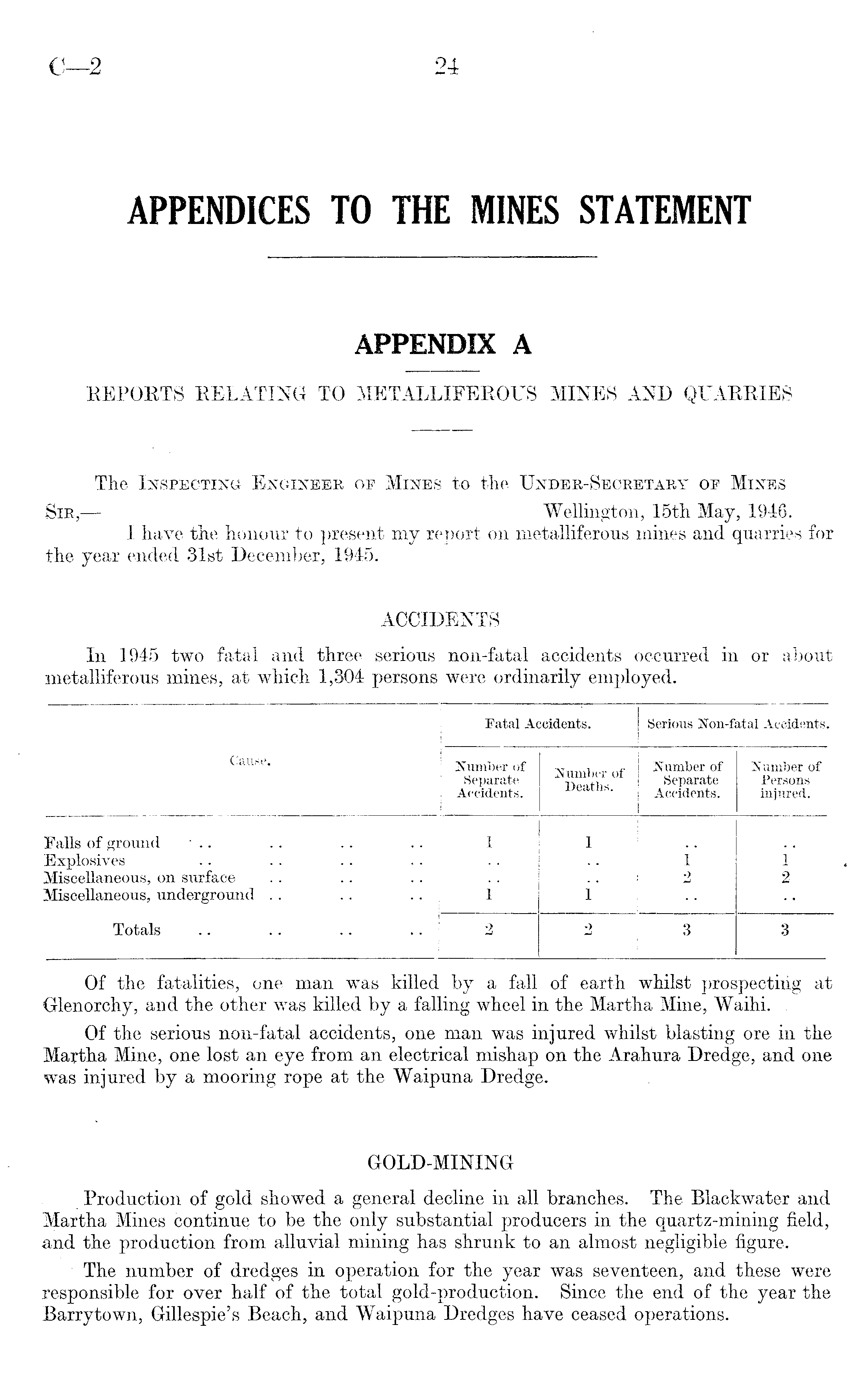The Inspecting Engineer of Mines to the Under-Secretary of Mines Sir, — Wellington, 15th May, 1946. I have the honour to present my report on metalliferous mines and quarries for the year ended 31st December, 1945.