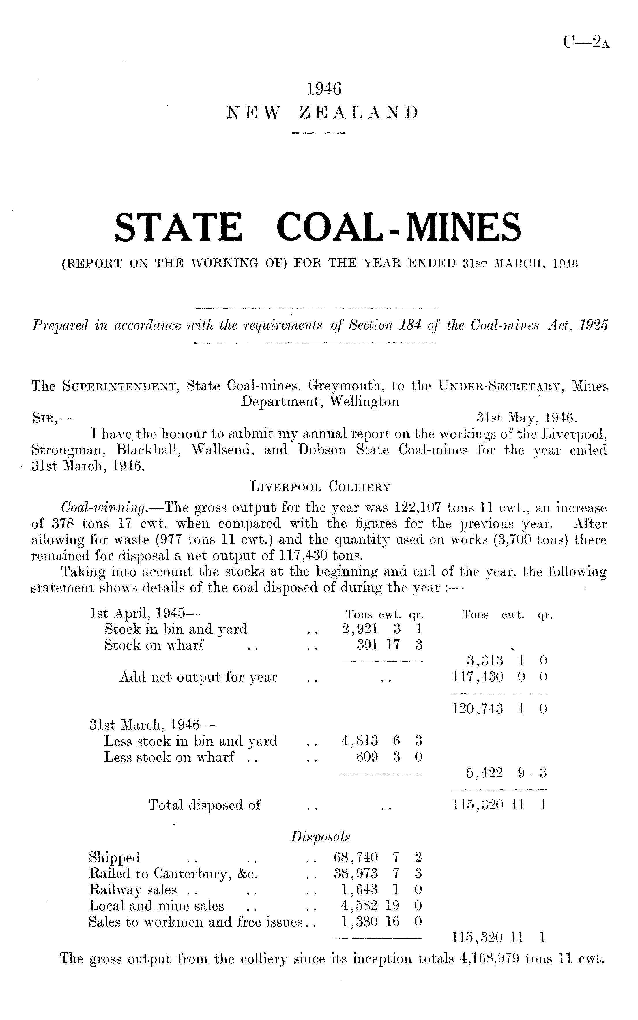 The Superintendent, State Coal-mines, Greymouth, to the Under-Secretary, Mines Department, Wellington Sir, — 31st May, 1946. I have the honour to submit my annual report on the workings of the Liverpool, Strongman, Blackball, Wallsend, and Dobson State Coal-mines for the year ended 31st March, 1946. Liverpool Colliery Coal-winning. —The gross output for the year was 122,107 tons 11 cwt., an increase of 378 tons 17 cwt. when compared with the figures for the previous year. After allowing for waste (977 tons 11 cwt.) and the quantity used on works (3,700 tons) there remained for disposal a net output of 117,430 tons. Taking into account the stocks at the beginning and end of the year, the following statement shows details of the coal disposed of during the year : Ist April, 1945 —- Tons cwt. qr. Tons cwt. qr. Stock in bin and yard . . 2,921 3 1 Stock on wharf .. .. 391 17 3 3,313 1 0 Add net output for year .. .. 117,430 0 0 120,743 1 0 31st March, 1946 — Less stock in bin and yard .. 4,813 6 3 Less stock on wharf .. .. 609 3 0 5,422 9 3 Total disposed of .. .. 115,320 11 1 Disposals Shipped .. .. .. 68,740 7 2 Railed to Canterbury, &c. .. 38,973 7 3 Railway sales .. .. .. 1,643 1 0 Local and mine sales .. .. 4,582 19 0 Sales to workmen and free issues.. 1,380 16 0 115,320 11 1 The gross output from the colliery since its inception totals 4,168,979 tons 11 cwt.
