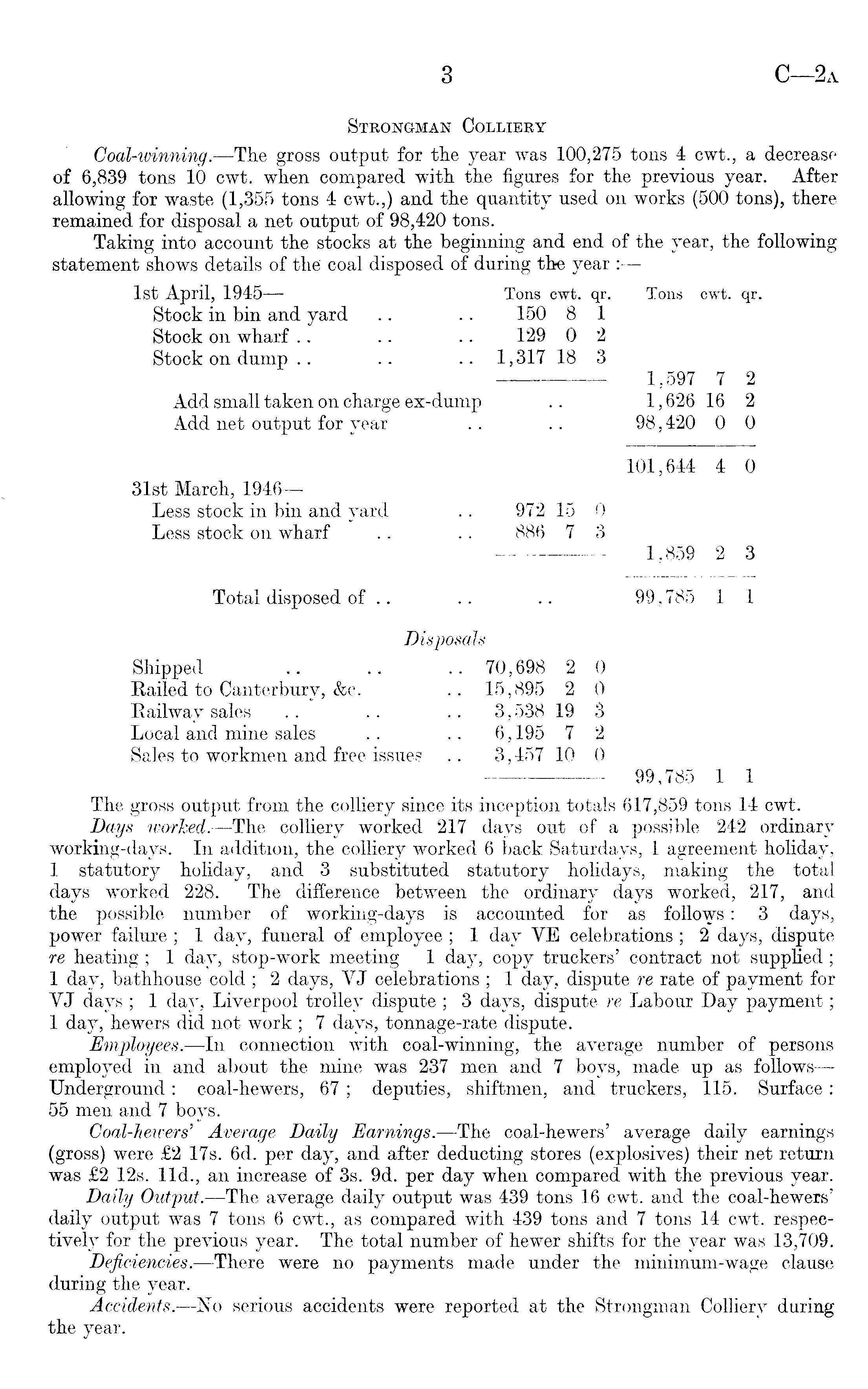 Strongman Colliery Coal-winning.—The gross output for the year was 100,275 tons 4 cwt., a decrease of 6,839 tons 10 cwt. when compared with the figures for the previous year. After allowing for waste (1,355 tons 4 cwt.,) and the quantity used on works (500 tons), there remained for disposal a net output of 98,420 tons. Taking into account the stocks at the beginning and end of the year, the following statement shows details of the coal disposed of during the year ■ Ist April, 1945 — Tons cwt. qr. Tons cwt. qr. Stock in bin and yard .. .. 150 8 1 Stock on wharf .. .. .. 129 0 2 Stock on dump .. .. 1,317 18 3 1,597 7 2 Add small taken on charge ex-dump .. 1,626 16 2 Add net output for year .. .. 98,420 0 0 101,644 4 0 31st March, 1946 Less stock in bin and yard .. 972 15 0 Less stock on wharf .. .. 886 7 3 1,859 2 3 Total disposed of .. .. .. 99,785 1 1 Disposals Shipped .. .. .. 70,698 2 0 Railed to Canterbury, &c. .. 15,895 2 0 Railway sales .. .. .. 3,538 19 3 Local and mine sales .. .. 6,195 7 2 Sales to workmen and free issues .. 3,457 10 0 99,785 1 1 The gross output from the colliery since its inception totals 617,859 tons 14 cwt. Days worked.—The colliery worked 217 days out of a possible 242 ordinary working-days. In addition, the colliery worked 6 back Saturdays, 1 agreement holiday, 1 statutory holiday, and 3 substituted statutory holidays, making the total days worked 228. The difference between the ordinary days worked, 217, and the possible number of working-days is accounted for as follows : 3 days, power failure ; 1 day, funeral of employee ; 1 day YE celebrations ; 2 days, dispute re heating ; 1 day, stop-work meeting 1 day, copy truckers' contract not supplied ; 1 day, bathhouse cold ; 2 days, YJ celebrations ; 1 day, dispute re rate of payment for YJ days ; 1 day, Liverpool trolley dispute ; 3 days, dispute re Labour Day payment; 1 day, hewers did not work ; 7 days, tonnage-rate dispute. Employees. —-In connection with coal-winning, the average number of persons employed in and about the mine was 237 men and 7 boys, made up as follows—Underground: coal-hewers, 67; deputies, shiftmen, and truckers, 115. Surface: 55 men and 7 boys. Coal-hewers' Average Daily Earnings.—The coal-hewers' average daily earnings (gross) were £2 17s. 6d. per day, and after deducting stores (explosives) their net return was £2 12s. lid., an increase of 3s. 9d. per day when compared with the previous year. Daily Output.—The average daily output was 439 tons 16 cwt. and the coal-hewers' daily output was 7 tons 6 cwt., as compared with 439 tons and 7 tons 14 cwt. respectively for the previous year. The total number of hewer shifts for the year was 13,709. Deficiencies. —There were no payments made under the minimum-wage clause during the year. Accidents.—No serious accidents were reported at the Strongman Colliery daring the year.