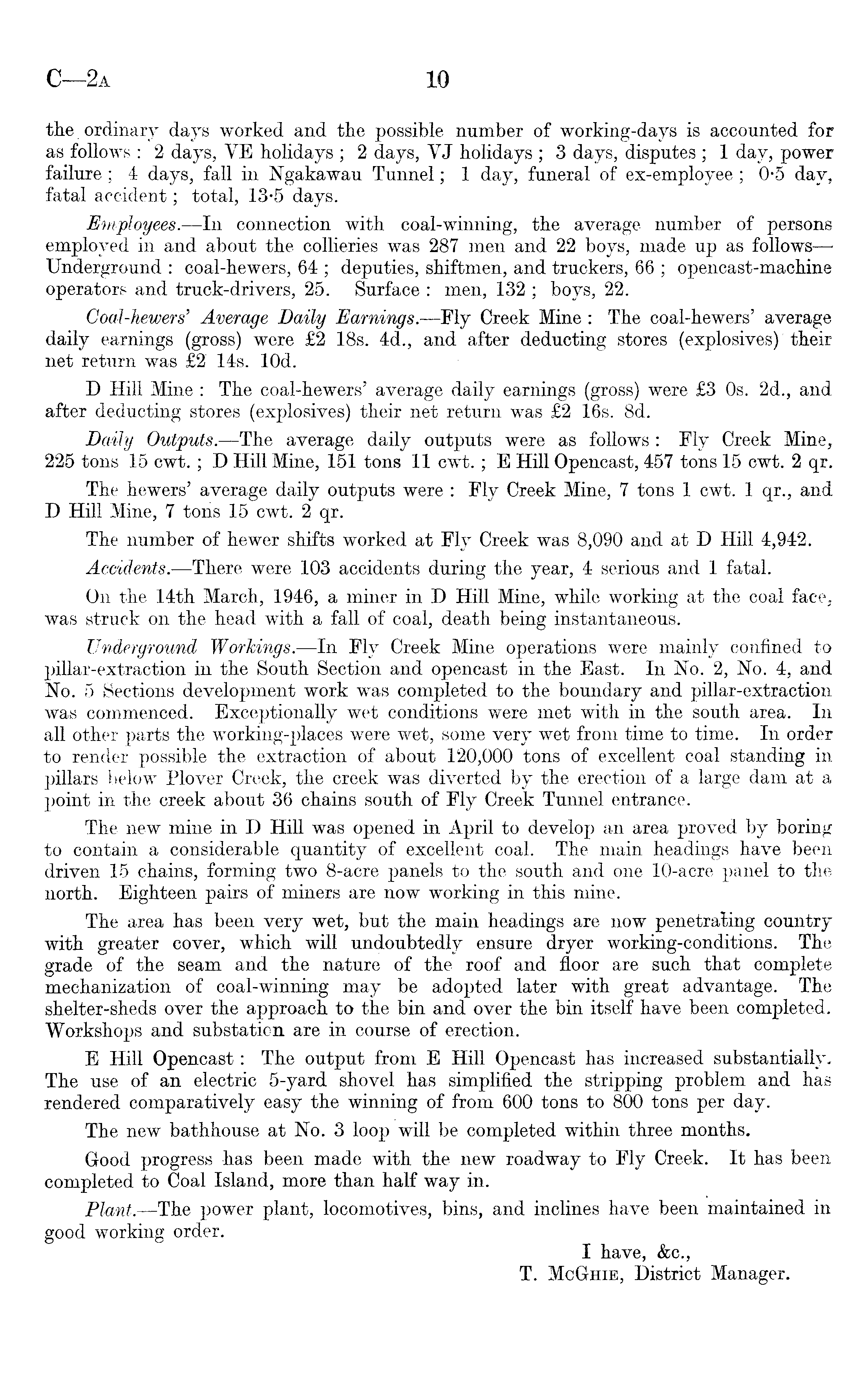 the ordinary days worked and the possible number of working-days is accounted for as follows : 2 days, VE holidays ; 2 days, YJ holidays ; 3 days, disputes ; 1 day, power failure; 4 days, fall in Ngakawau Tunnel; 1 day, funeral of ex-employee ; 0-5 day, fatal accident; total, 13-5 days. Employees. —In connection with coal-winning, the average number of persons employed in and about the collieries was 287 men and 22 boys, made up as follows — Underground : coal-hewers, 64 ; deputies, shiftmen, and truckers, 66 ; opencast-machine operators and truck-drivers, 25. Surface : men, 132 ; boys, 22. Goal-hewers' Average Daily Earnings.—Fly Creek Mine : The coal-hewers' average daily earnings (gross) were £2 18s. 4d., and after deducting stores (explosives)' their net return was £2 14s. lOd. D Hill Mine : The coal-hewers' average daily earnings (gross) were £3 os. 2d., and after deducting stores (explosives) their net return was £2 16s. Bd. Daily Outputs.—The average daily outputs were as follows : Fly Creek Mine, 225 tons 15 cwt. ; D Hill Mine, 151 tons 11 cwt.; E Hill Opencast, 457 tons 15 cwt. 2 qr. The hewers' average daily outputs were : Fly Creek Mine, 7 tons 1 cwt. 1 qr., and D Hill Mine, 7 tons 15 cwt. 2 qr. The number of hewer shifts worked at Fly Creek was 8,090 and at D Hill 4,942. Accidents. —There were 103 accidents during the year, 4 serious and 1 fatal. On the 14th March, 1946, a miner in D Hill Mine, while working at the coal face, was struck on the head with a fall of coal, death being instantaneous. Underground Workings.—ln Fly Creek Mine operations were mainly confined to pillar-extraction in the South Section and opencast in the East. In No. 2, No. 4, and No. 5 Sections development work was completed to the boundary and pillar-extraction was commenced. Exceptionally wet conditions were met with in the south area. In all other parts the working-places were wet, some very wet from time to time. In order to render possible the extraction of about 120,000 tons of excellent coal standing in pillars below Plover Creek, the creek was diverted by the erection of a large dam at a point in the creek about 36 chains south of Fly Creek Tunnel entrance. The new mine in D Hill was opened in April to develop an area proved by boring to contain a considerable quantity of excellent coal. The main headings have been driven 15 chains, forming two 8-acre panels to the south and one 10-acre panel to the north. Eighteen pairs of miners are now working in this mine. The area has been very wet, but the main headings are now penetrating country with greater cover, which will undoubtedly ensure dryer working-conditions. The grade of the seam and the nature of the roof and floor are such that complete mechanization of coal-winning may be adopted later with great advantage. The shelter-sheds over the approach to the bin and over the bin itself have been completed. Workshops and substation are in course of erection. E Hill Opencast: The output from E Hill Opencast has increased substantially. The use of an electric 5-yard shovel has simplified the stripping problem and has rendered comparatively easy the winning of from 600 tons to 800 tons per day. The new bathhouse at No. 3 loop will be completed within three months. Good progress has been made with the new roadway to Fly Creek. It has been completed to Coal Island, more than half way in. Plant.—The power plant, locomotives, bins, and inclines have been maintained in good working order. I have, &c., T. McGhie, District Manager.