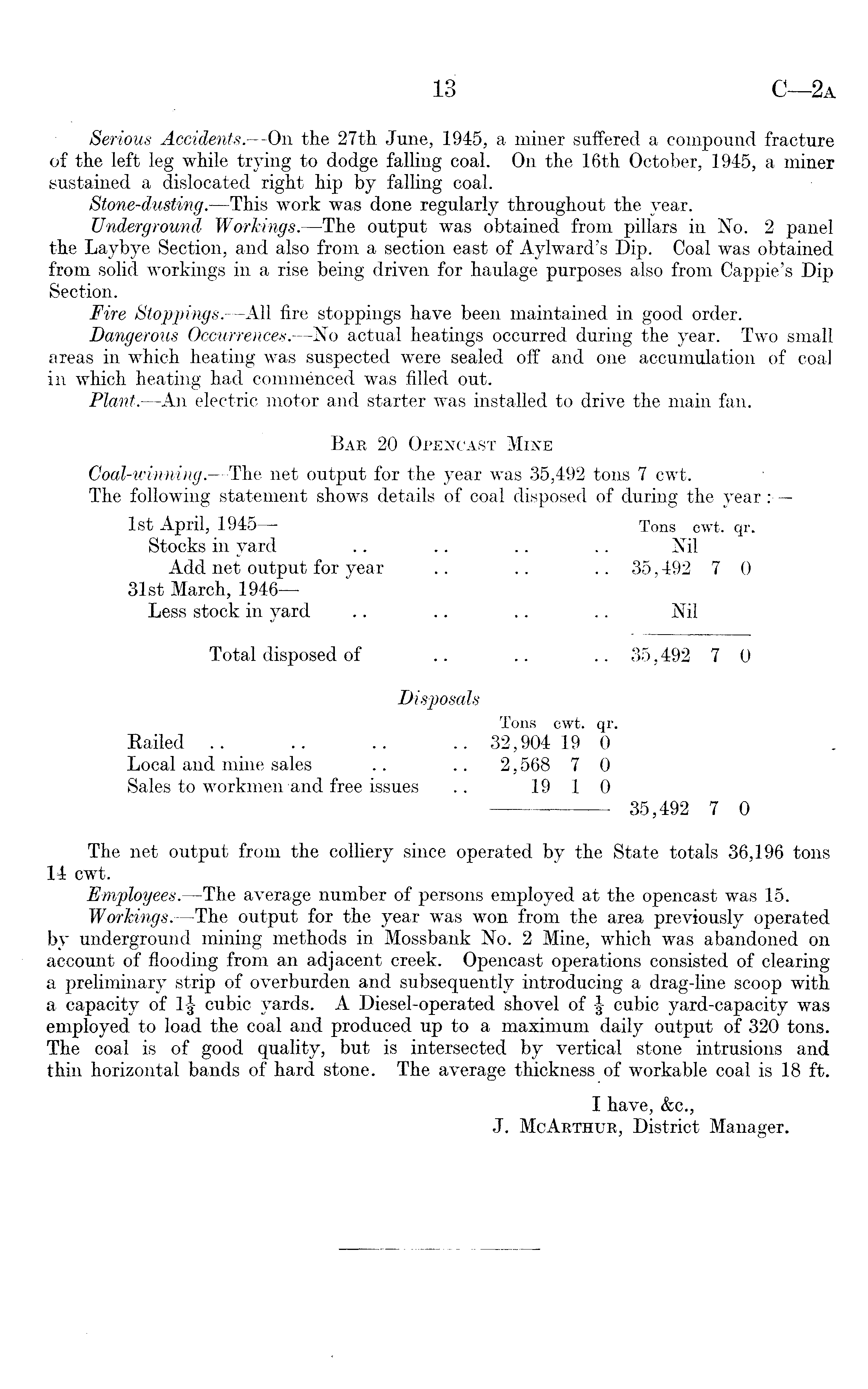Serious Accidents. —On the 27th June, 1945, a miner suffered a compound fracture of the left leg while trying to dodge falling coal. On the 16th October, 1945, a miner sustained a dislocated right hip by falling coal. Stone-dusting. —This work was done regularly throughout the year. Underground Workings.—The output was obtained from pillars in No. 2 panel the Laybye Section, and also from a section east of Aylward's Dip. Coal was obtained from solid workings in a rise being driven for haulage purposes also from Cappie's Dip Section. Fire Stoppings.—All fire stoppings have been maintained in good order. Dangerous Occurrences. —No actual heatings occurred during the year. Two small areas in which heating was suspected were sealed off and one accumulation of coal in which heating had commenced was filled out. Plant. —An electric motor and starter was installed to drive the main fan. Bar 20 Opencast Mine Coal-winning. —The net output for the year was 35,492 tons 7 cwt. The following statement shows details of coal disposed of during the year : —• Ist April, 1945 Tons cwt. qr. Stocks in yard .. .. .. .. Nil Add net output for year .. .. .. 35,492 7 0 31st March, 1946 Less stock in yard .. .. ~ .. Nil Total disposed of .. .. .. 35,492 7 0 Disposals Tons cwt. qr. Railed .. .. .. .. 32,904 19 0 Local and mine sales .. .. 2,568 7 0 Sales to workmen and free issues .. 19 1 0 — 35,492 7 0 The net output from the colliery since operated by the State totals 36,196 tons 14 cwt. Employees.—The average number of persons employed at the opencast was 15. Workings.—The output for the year was won from the area previously operated by underground mining methods in Mossbank No. 2 Mine, which was abandoned on account of flooding from an adjacent creek. Opencast operations consisted of clearing a preliminary strip of overburden and subsequently introducing a drag-line scoop with a capacity of lj cubic yards. A Diesel-operated shovel of cubic yard-capacity was employed to load the coal and produced up to a maximum daily output of 320 tons. The coal is of good quality, but is intersected by vertical stone intrusions and thin horizontal bands of hard stone. The average thickness of workable coal is 18 ft. I have, &c., J. McArthur, District Manager.