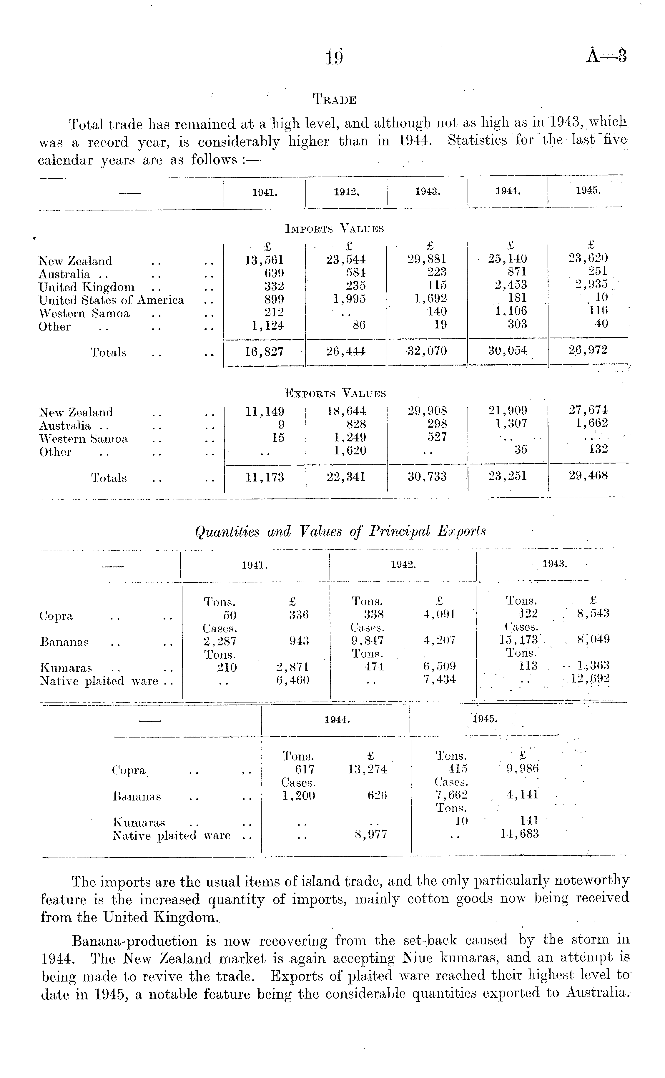 The imports are the usual items of island trade, and the only particularly noteworthy feature is the increased quantity of imports, mainly cotton goods now being received from the United Kingdom. Banana-production is now recovering from the set-back caused by the storm in 1944. The New Zealand market is again accepting Niue kumaras, and an attempt is being made to revive the trade. Exports of plaited ware reached their highest level todate in 1945, a notable feature being the considerable quantities exported to Australia.