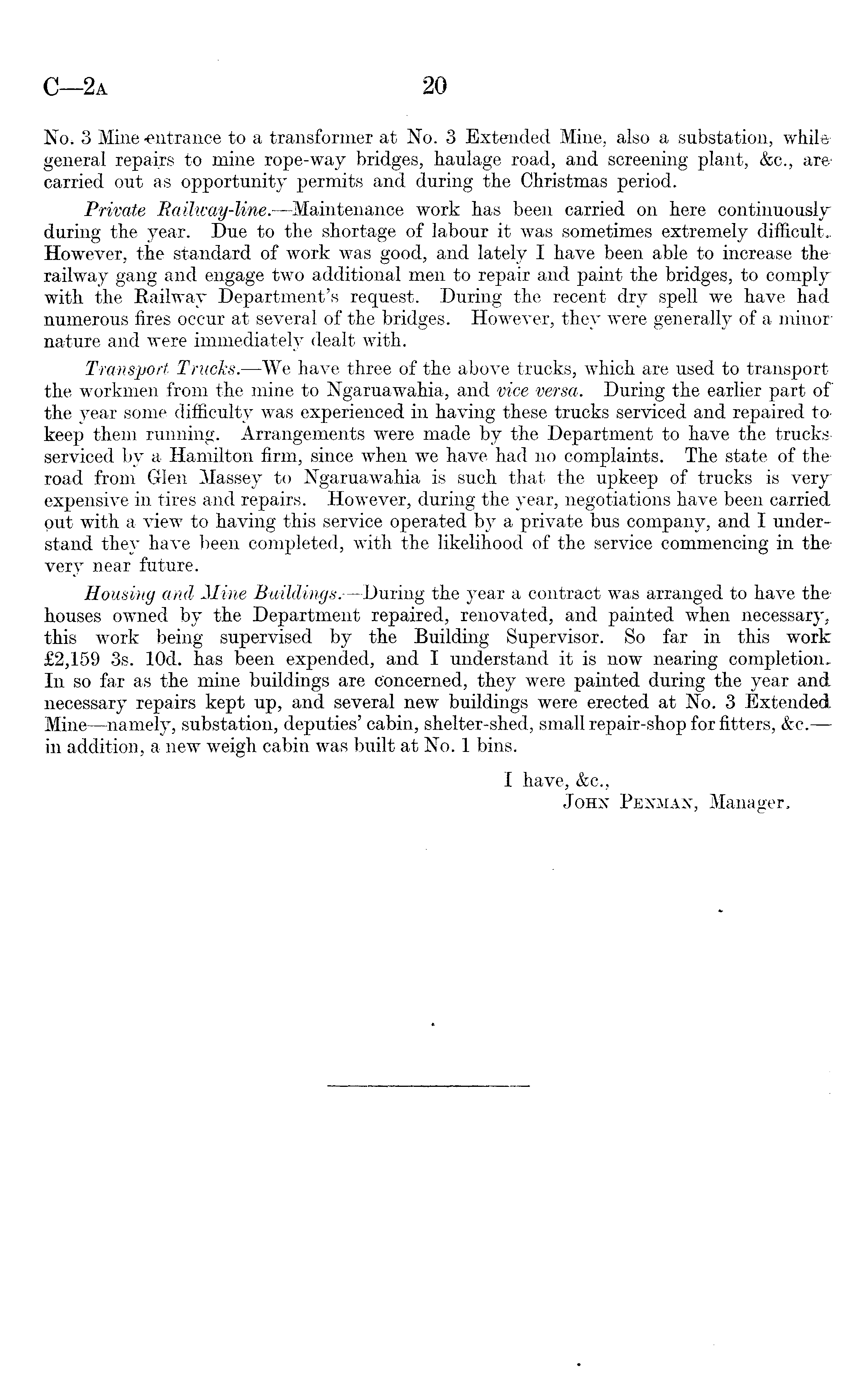 Noi 3 Mine to a transformer at No. 3 Extended Mine, also a substation, whilegeneral repairs to mine rope-way bridges, haulage road, and screening plant, &c., are carried out as opportunity permits and during the Christmas period. Private Railway-line.—Maintenance work has been carried on here continuously during the year. Due to the shortage of labour it was sometimes extremely difficult. However, the standard of work was good, and lately I have been able to increase the railway gang and engage two additional men to repair and paint the bridges, to comply with the Railway Department's request. During the recent dry spell we have had numerous fires occur at several of the bridges. However, they were generally of a minor nature and were immediately dealt with. Transport Trucks.—We have three of the above trucks, which are used to transport the workmen from the mine to Ngaruawahia, and vice versa. During the earlier part of the year some difficulty was experienced in having these trucks serviced and repaired to keep them running. Arrangements were made by the Department to have the trucksserviced by a Hamilton firm, since when we have had no complaints. The state of the road from Glen Massey to Ngaruawahia is such that the upkeep of trucks is very expensive in tires and repairs. However, during the year, negotiations have been carried put with a view to having this service operated by a private bus company, and I understand they have been completed, with the likelihood of the service commencing in the very near future. Housing and Mine Buildings. —During the year a contract was arranged to have the houses owned by the Department repaired, renovated, and painted when necessary,, this work being supervised by the Building Supervisor. So far in this work £2,159 3s. lOd. has been expended, and I understand it is now nearing completion. In so far as the mine buildings are concerned, they were painted during the year and necessary repairs kept up, and several new buildings were erected at No. 3 Extended Mine —namely, substation, deputies' cabin, shelter-shed, small repair-shop for fitters, &c. — in addition, a new weigh cabin was built at No. 1 bins. I have, &c., John Penman, Manager,