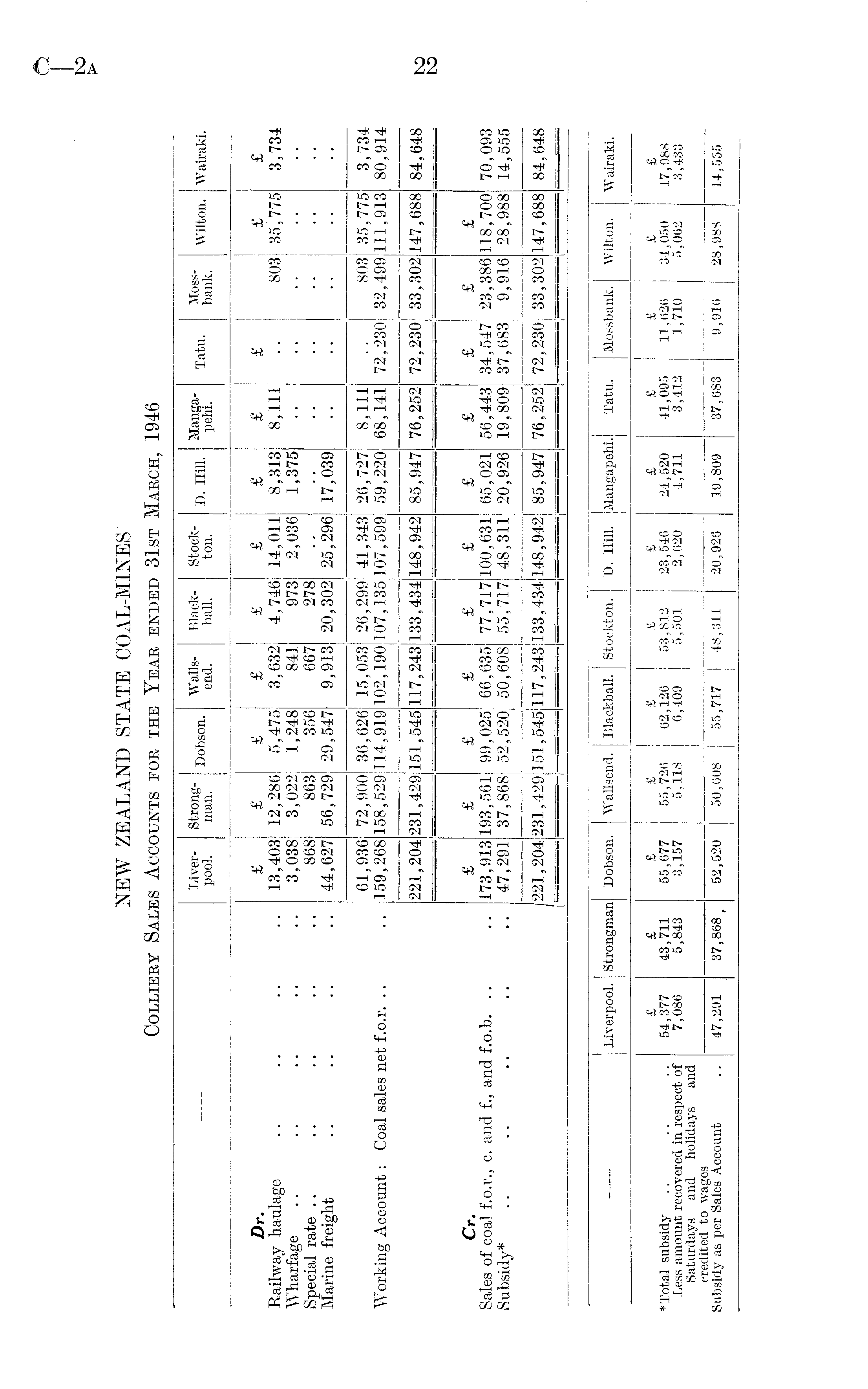 — Liverpool. Strongman. Dobson. Wallsend. Blackball. Stockton. I). Hill. Mangapehi. Tatu. Mossbank. Wilton. Wairaki. Dr. Railway haulage Wharfage Special rate Marine freight Working Account: Coal sales net f.o.r. Cr. Sales of coal f.o.r., c. and f., and f.o.b. Subsidy* £ 13,403 3,038 868 44,627 £ 12,286 3,022 863 56,729 £ 5,475 1,248 356 29,547 £ 3,632 841 667 9,913 £ 4,746 973 278 20,302 £ 14,011 2,036 25 j296 £ 8,313 1,375 17^039 £ 8,111 £ 803 £ 35,775 £ 3,734 61,936 159,268 72,900 158,529 36,626 114,919 15,053 102,190 26,299 107,135 41,343 107,599 26,727 59,220 8,111 68,141 72,230 803 32,499 35,775 111,913 31,734 80,914 221,204 231,429 151,545 117,243 133,434 148,942 85,947 76,252 72,230 33,302 147,688 84,648 £ 173,913 47,291 £ 193,561 37,868 £ 99,025 52,520 £ 66,635 50,608 £ 77,717 55,717 £ 100,631 48,311 £ 65,021 20,926 £ 56,443 19,809 £ 34,547 37,683 £ 23,386 9,916 £ 118,700 28,988 70,093 14,555 221,204 231,429 151,545 117,243 133,434 148,942 85,947 76,252 72,230 33,302 147,688 84,648 i Liverpool. Strongman l Dobson. Wallsend. Blackball. Stockton. D. Hill. Mangapehi. Tatu. Mossbank. Wilton. Wairaki. ♦Total subsidy Less amount recovered in respect of Saturdays and holidays and credited to wages Subsidy as per Sales Account £ 54,377 7,086 £ 43,711 5,843 £ 55,677 3,157 £ 55,726 5,118 £ 62,126 6,409 £ 53,812 5,501 £ 23,546 2,620 £ 24,520 4,711 £ 41,095 3,412 £ 11,626 1,710 £ 34,050 5,062 £ 17,988 3,433 47,291 37,868 f 52,520 50,608 55,717 48,311 20,926 19,809 37,683 9,916 28,988 14,555