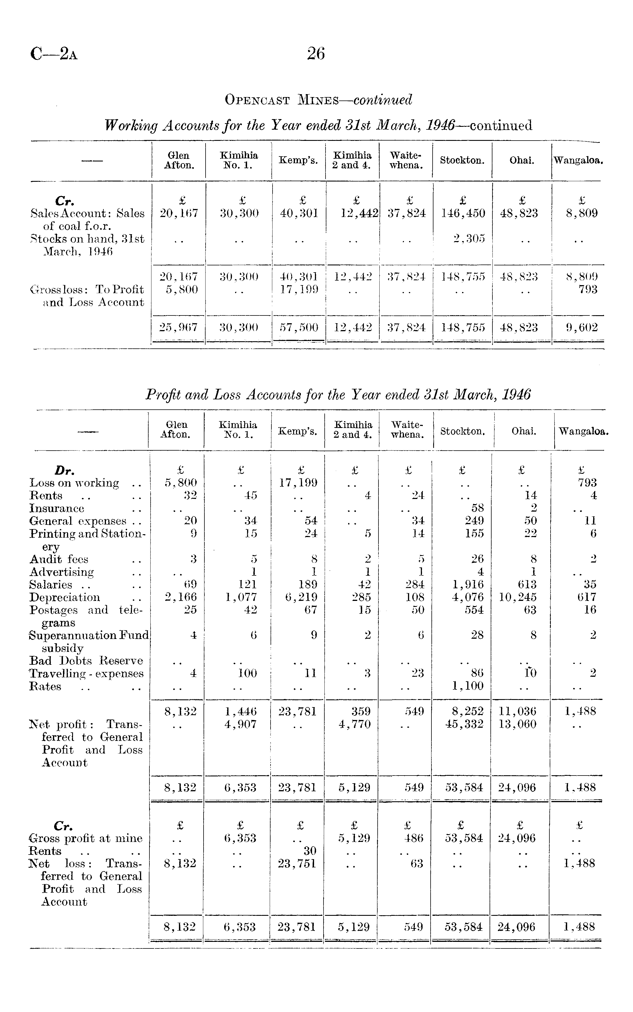 — Glen Afton. Kimihia No. 1. Kemp's. Kimihia 2 and 4. Waitewhena. Stockton. Ohai. Wangaloa. Cr. Sales Account: Sales of coal f.o.r. Stocks on hand, 31st March, 1946 £ 20,167 £ 30,300 £ 40,301 £ 12,442 £ 37,824 £ 146,450 2,305 £ 48,823 £ 8,809 Gross loss: To Profit and Loss Account 20,167 5,800 30,300 40,301 17,199 12,442 37,824 148,755 48,823 8,809 793 25,967 30,300 57,500 12,442 37,824 148,755 48,823 9,602