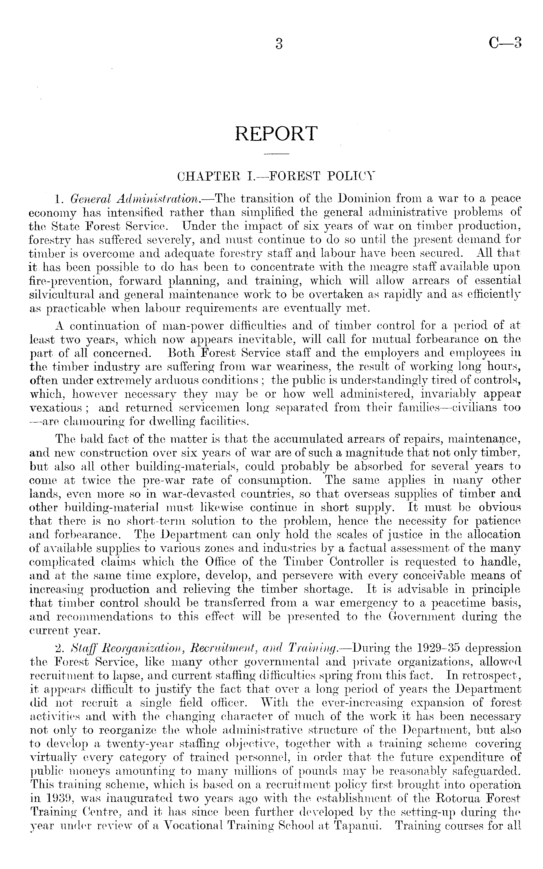 CHAPTER I.—FOREST POLICY 1. General Administration. —The transition of the Dominion from a war to a peace economy has intensified rather than simplified the general administrative problems of the State Forest Service. Under the impact of six years of war on timber production, forestry has suffered severely, and must continue to do so until the present demand for timber is overcome and adequate forestry staff and labour have been secured. All that it . has been possible to do has been to concentrate with the meagre staff available upon fire-prevention, forward planning, and training, which will allow arrears of essential silvicultural and general maintenance work to be overtaken as rapidly and as efficiently as practicable when labour requirements are eventually met. A continuation of man-power difficulties and of timber control for a period of at least two years, which now appears inevitable, will call for mutual forbearance on the part of all concerned. Both Forest Service staff and the employers and employees in the timber industry are suffering from war weariness, the result of working long hours, often under extremely arduous conditions ; the public is understandingly tired of controls, which, however necessary they may be or how well administered, invariably appear vexatious; and returned servicemen long separated from their families —civilians too : —are clamouring for dwelling facilities. The bald fact of the matter is that the accumulated arrears of repairs, maintenance, and new construction over six years of war are of such a magnitude that not only timber, but also all other building-materials, could probably be absorbed for several years to come at twice the pre-war rate of consumption. The same applies in many other lands, even more so in war-devasted countries, so that overseas supplies of timber and other building-material must likewise continue in short supply. It must be obvious that there is no short-term solution to the problem, hence the necessity for patience and forbearance. The Department can only hold the scales of justice in the allocation of available supplies to various zones and industries by a factual assessment of the many complicated claims which the Office of the Timber Controller is requested to handle, and at the same time explore, develop, and persevere with every conceivable means of increasing production and relieving the timber shortage. It is advisable in principle that timber control should be transferred from a war emergency to a peacetime basis, and recommendations to this effect will be presented to the Government during the current year. 2. Staff Reorganization, Recruitment, and Training.—During the 1929-35 depression the Forest Service, like many other governmental and private organizations, allowed recruitment to lapse, and current staffing difficulties spring from this fact. In retrospect, it appears difficult to justify the fact that over a long period of years the Department did not recruit a single field officer. With the ever-increasing expansion of forest activities and with the changing character of much of the work it has been necessary not only to reorganize the whole administrative structure of the Department, but also to develop a twenty-year staffing objective, together with a training scheme covering virtually every category of trained personnel, in order that the future expenditure of public moneys amounting to many millions of pounds may be reasonably safeguarded. This training scheme, which is based on a recruitment policy first brought into operation in 1939, was inaugurated two years ago with the establishment of the Rotorua Forest Training Centre, and it has since been further developed by the setting-up during the year under review of a Vocational Training School at Tapanui. Training courses for all