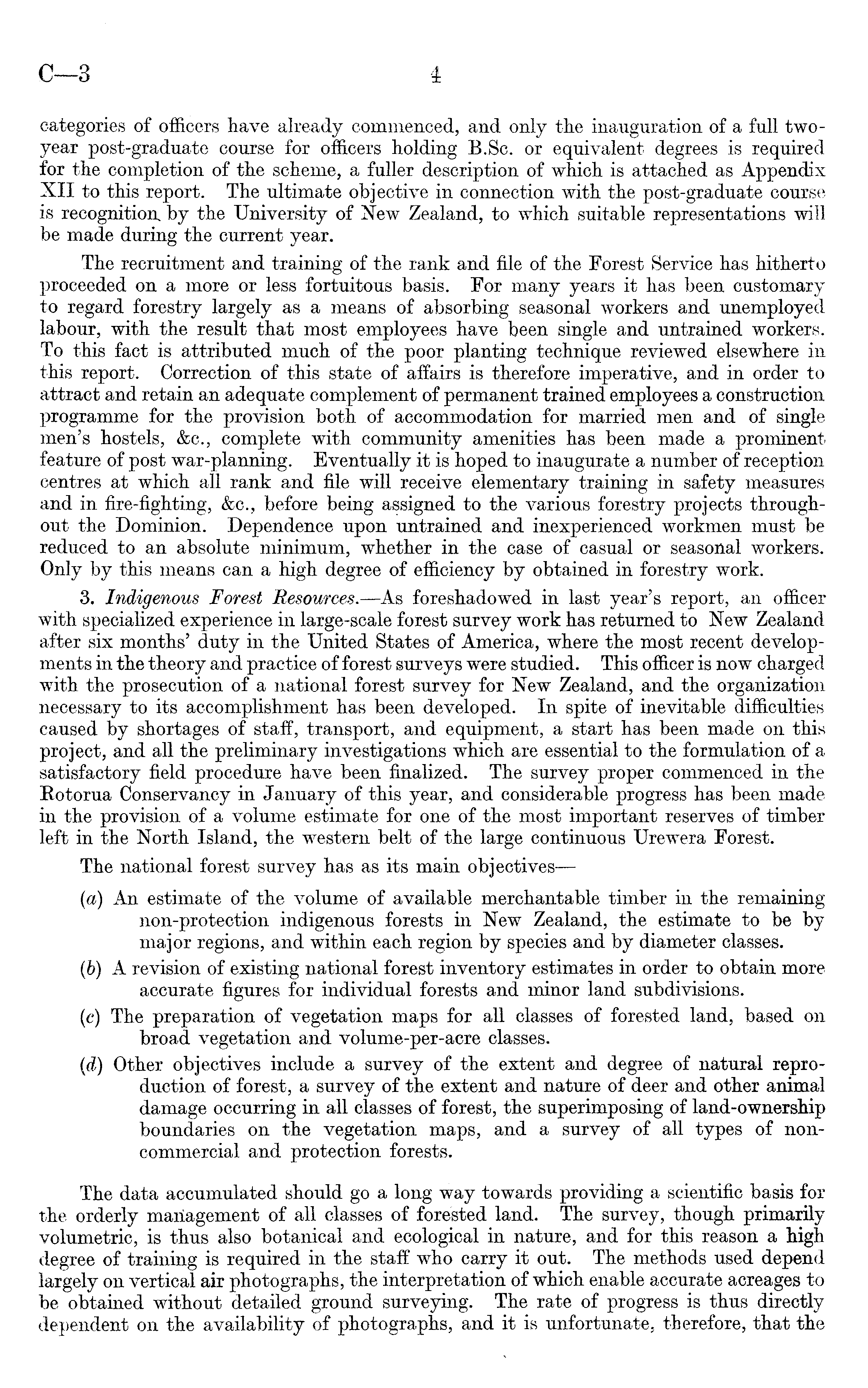 categories of officers have already commenced, and only the inauguration of a full twoyear post-graduate course for officers holding B.Sc. or equivalent degrees is required for the completion of the scheme, a fuller description of which is attached as Appendix XII to this report. The ultimate objective in connection with the post-graduate course is recognition by the University of New Zealand, to which suitable representations will be made during the current year. The recruitment and training of the rank and file of the Forest Service has hitherto proceeded on a more or less fortuitous basis. For many years it has been customary to regard forestry largely as a means of absorbing seasonal workers and unemployed labour, with the result that most employees have been single and untrained workers. To this fact is attributed much of the poor planting technique reviewed elsewhere in this report. Correction of this state of affairs is therefore imperative, and in order to attract and retain an adequate complement of permanent trained employees a construction programme for the provision both of accommodation for married men and of single men's hostels, &c., complete with community amenities has been made a prominent feature of post war-planning. Eventually it is hoped to inaugurate a number of reception centres at which all rank and file will receive elementary training in safety measures and in fire-fighting, &c., before being assigned to the various forestry projects throughout the Dominion. Dependence upon untrained and inexperienced workmen must be reduced to an absolute minimum, whether in the case of casual or seasonal workers. Only by this means can a high degree of efficiency by obtained in forestry work. 3, Indigenous Forest Resources. —As foreshadowed in last year's report, an officer with specialized experience in large-scale forest survey work has returned to New Zealand after six months' duty in the United States of America, where the most recent developments in the theory and practice of forest surveys were studied. This officer is now charged with the prosecution of a national forest survey for New Zealand, and the organization necessary to its accomplishment has been developed. In spite of inevitable difficulties caused by shortages of staff, transport, and equipment, a start has been made on this project, and all the preliminary investigations which are essential to the formulation of a satisfactory field procedure have been finalized. The survey proper commenced in the Rotorua Conservancy in January of this year, and considerable progress has been made in the provision of a volume estimate for one of the most important reserves of timber left in the North Island, the western belt of the large continuous Urewera Forest. The national forest survey has as its main objectives — (a) An estimate of the volume of available merchantable timber in the remaining non-protection indigenous forests in New Zealand, the estimate to be by major regions, and within each region by species and by diameter classes. (b) A revision of existing national forest inventory estimates in order to obtain more accurate figures for individual forests and minor land subdivisions. (c) The preparation of vegetation maps for all classes of forested land, based on broad vegetation and volume-per-acre classes. (d) Other objectives include a survey of the extent and degree of natural reproduction of forest, a survey of the extent and nature of deer and other animal damage occurring in all classes of forest, the superimposing of land-ownership boundaries on the vegetation maps, and a survey of all types of noncommercial and protection forests. The data accumulated should go a long way towards providing a scientific basis for the orderly management of all classes of forested land. The survey, though primarily volumetric, is thus also botanical and ecological in nature, and for this reason a high degree of training is required in the staff who carry it out. The methods used depend largely on vertical air photographs, the interpretation of which enable accurate acreages to be obtained without detailed ground surveying. The rate of progress is thus directly dependent on the availability of photographs, and it is unfortunate, therefore, that the