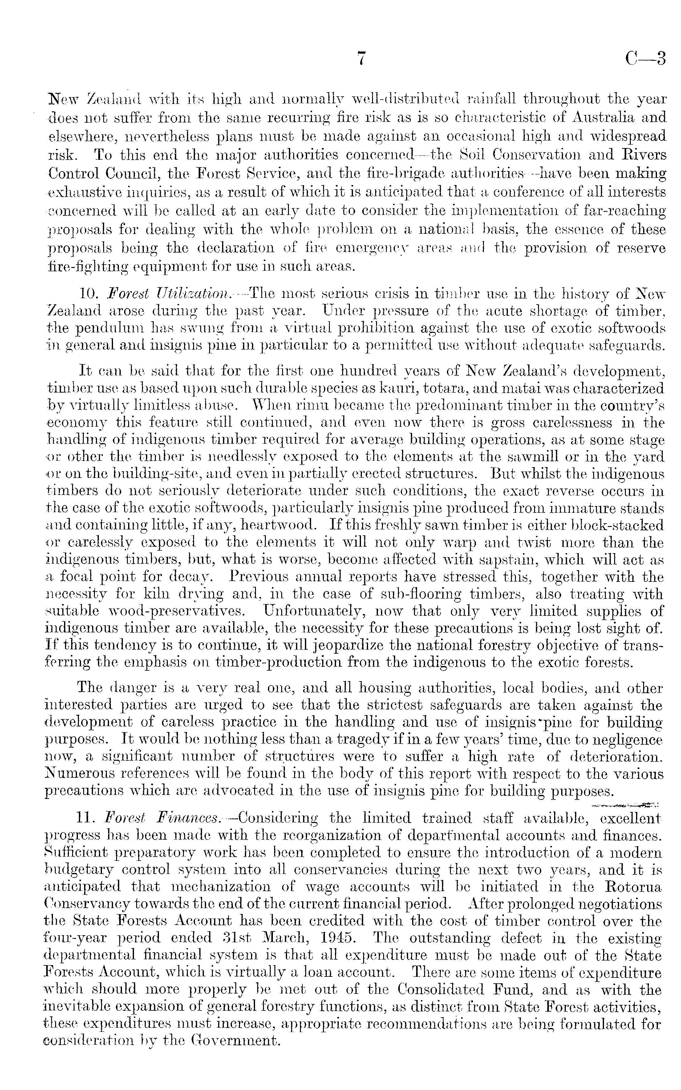 New Zealand with, its high, and normally well-distributed rainfall throughout the year •does not suffer from the same recurring fire risk, as is .so characteristic of Australia and •elsewhere, nevertheless plans must be made against an occasional high and widespread risk. To this end the major authorities concerned—the Soil Conservation and Eivers 'Control Council, the Forest Service, and the fire-brigade authorities—have been making exhaustive inquiries, as a result of which it is anticipated that a conference of all interests concerned will be called at an early date to consider the implementation of far-reaching proposals for dealing with the whole problem on a national basis, the essence of these proposals being the declaration of fire emergency areas and the provision of reserve fire-fighting equipment for use in such areas. 10. Forest Utilization. —The most serious crisis in timber use in the history of New Zealand arose during the past year. Under pressure of the acute shortage of timber, the pendulum has swung from a virtual prohibition against the use of exotic softwoods in general and insignis pine in particular to a permitted use without adequate safeguards. It can be said that for the first one hundred years of New Zealand's development, timber use as based upon such durable species as kauri, totara, and matai was characterized by virtually limitless abuse. When rimu became the predominant timber in the country's ■economy this feature still continued, and even now there is gross carelessness in the handling of indigenous timber required for average building operations, as at some stage or other the timber is needlessly exposed to the elements at the sawmill or in the yard or on the building-site, and even in partially erected structures. But whilst the indigenous timbers do not seriously deteriorate under such conditions, the exact reverse occurs in the case of the exotic softwoods, particularly insignis pine produced from immature stands and containing little, if any, heartwood. If this freshly sawn timber is either block-stacked or carelessly exposed to the elements it will not only warp and twist more than the indigenous timbers, but, what is worse, become affected with sapstain, which will act as a focal point for decay. Previous annual reports have stressed this, together with the necessity for kiln drying and, in the case of sub-flooring timbers, also treating with suitable wood-preservatives. Unfortunately, now that only very limited supplies of indigenous timber are available, the necessity for these precautions is being lost sight of. If this tendency is to continue, it will jeopardize the national forestry objective of transferring the emphasis on timber-production from the indigenous to the exotic forests. The danger is a very real one, and all housing authorities, local bodies, and other interested parties are urged to see that the strictest safeguards are taken against the development of careless practice in the handling and use of insignis *pine for buildingpurposes. It would be nothing less than a tragedy if in a few years' time, due to negligence now, a significant number of structures were to suffer a high rate of deterioration. Numerous references will be found in the body of this report with respect to the various precautions which are advocated in the use of insignis pine for building purposes. 11. Forest Finances. —Considering the limited trained staff available, excellent progress has been made with the reorganization of departmental accounts and finances. Sufficient preparatory work has been completed to ensure the introduction of a modern budgetary control system into all conservancies during the next two years, and it is anticipated that mechanization of wage accounts will be initiated in the Eotorua Conservancy towards the end of the current financial period. After prolonged negotiations the State Forests Account has been credited with the cost of timber control over the four-year period ended 31st March, 1945. The outstanding defect in the existing departmental financial system is that all expenditure must be made out of the State Forests Account, which is virtually a loan account. There are some items of expenditure which should more properly be met out of the Consolidated Fund, and as with the inevitable expansion of general forestry functions, as distinct from State Forest activities, these expenditures must increase, appropriate recommendations are being formulated for consideration by the Government.