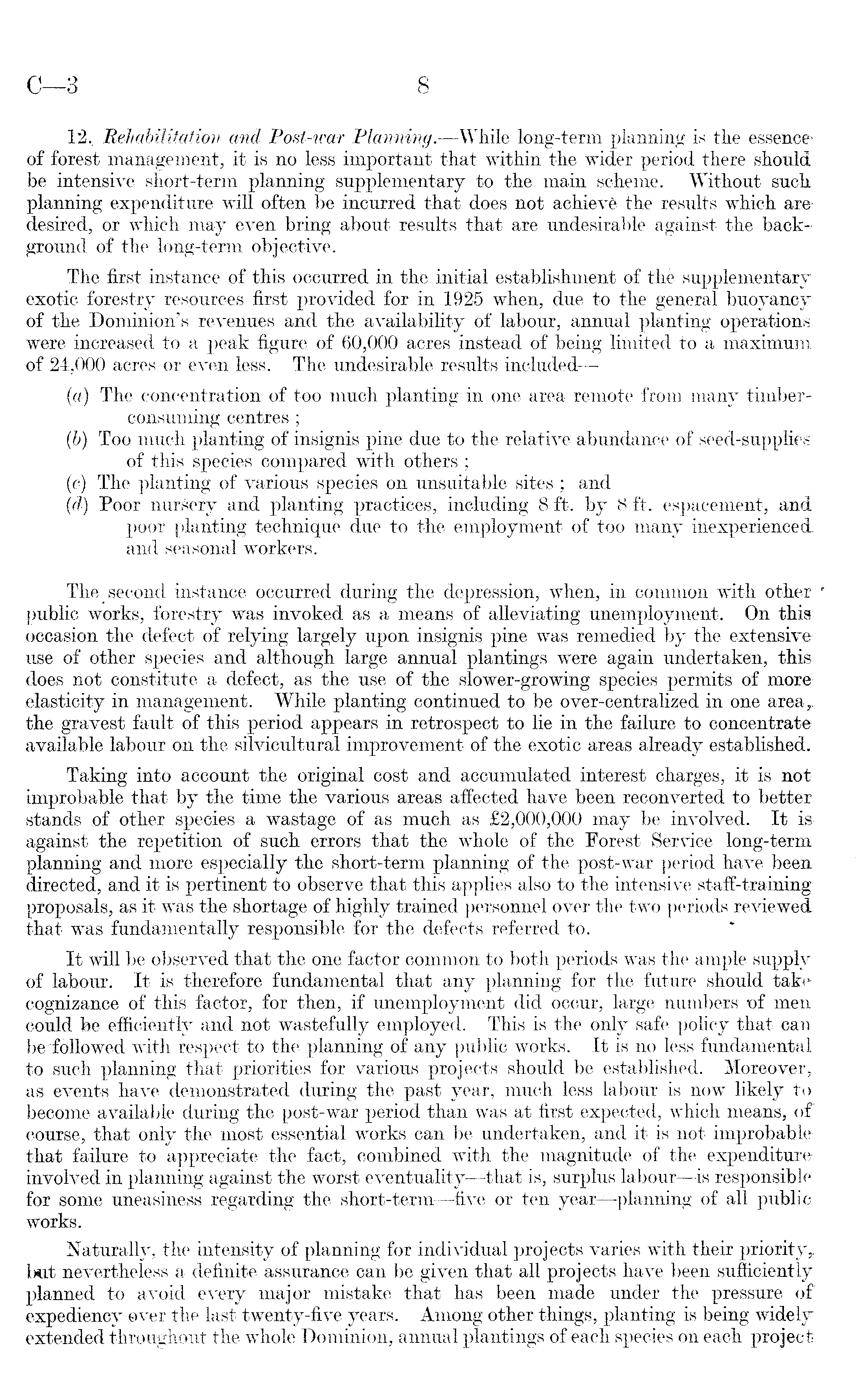 12. Rehabilitation and Post-war Planning.—While long-term planning is the essenceof forest management, it is no less important that within the wider period there should be intensive short-term planning supplementary to the main scheme. Without such planning expenditure will often be incurred that does not achieve the results which are desired, or which may even bring about results that are undesirable against the background of the long-term objective. The first instance of this occurred in the initial establishment of the supplementary exotic forestry resources first provided for in 1925 when, due to the general buoyancy of the Dominion's revenues and the availability of labour, annual planting operations were increased to a peak figure of 60,000 acres instead of being limited to a maximum of 24,000 acres or even less. The undesirable results included —- (a) The concentration of too much planting in one area remote from many timberconsuming centres ; (b) Too much planting of insignis pine due to the relative abundance of seed-supplies of this species compared with others ; (c) The planting of various species on unsuitable sites ; and (d) Poor nursery and planting practices, including 8 ft. by 8 ft. espacement, and poor planting technique due to the employment of too many inexperienced and seasonal workers. The second instance occurred during the depression, when, in common with other public works, forestry was invoked as a means of alleviating unemployment. On thia occasion the defect of relying largely upon insignis pine was remedied by the extensive use of other species and although large annual plantings were again undertaken, this does not constitute a defect, as the use of the slower-growing species permits of more elasticity in management. While planting continued to be over-centralized in one area,, the gravest fault of this period appears in retrospect to lie in the failure to concentrate available labour on the silvicultural improvement of the exotic areas already established. Taking into account the original cost and accumulated interest charges, it is not improbable that by the time the various areas affected have been reconverted to better stands of other species a wastage of as much as £2,000,000 may be involved. It isagainst the repetition of such errors that the whole of the Forest Service long-term planning and more especially the short-term planning of the post-war period have been directed, and it is pertinent to observe that this applies also to the intensive staff-training proposals, as it was the shortage of highly trained personnel over the two periods reviewed that was fundamentally responsible for the defects referred to. It will be observed that the one factor common to both periods was the ample supply of labour. It is therefore fundamental that: any planning for the future should take cognizance of this factor, for then, if unemployment did occur, large numbers of men could be efficiently and not wastefully employed. This is the only safe policy that can be'followed with respect to the planning of any public works. It is no less fundamental to such planning that priorities for various projects should be established.MMoreoverr r as events have demonstrated during the past year, much less labour is now likely to become available during the post-war period than was at first expected, which means, of course, that only the most essential works can be undertaken, and it is not improbable that failure to appreciate the fact, combined with the magnitude of the expenditure involved in planning against the worst eventuality —that is, surplus labour —is responsible for some uneasiness regarding the short-term —five or ten year—planning of all publie works. Naturally, the intensity of planning for individual projects varies with their priority y but nevertheless a definite assurance can be given that all projects have been sufficiently planned to avoid every major mistake that has been made under the pressure of expediency over the last twenty-five years. Among other things, planting is being widely extended throughout the whole Dominion, annual plantings of each species on each project