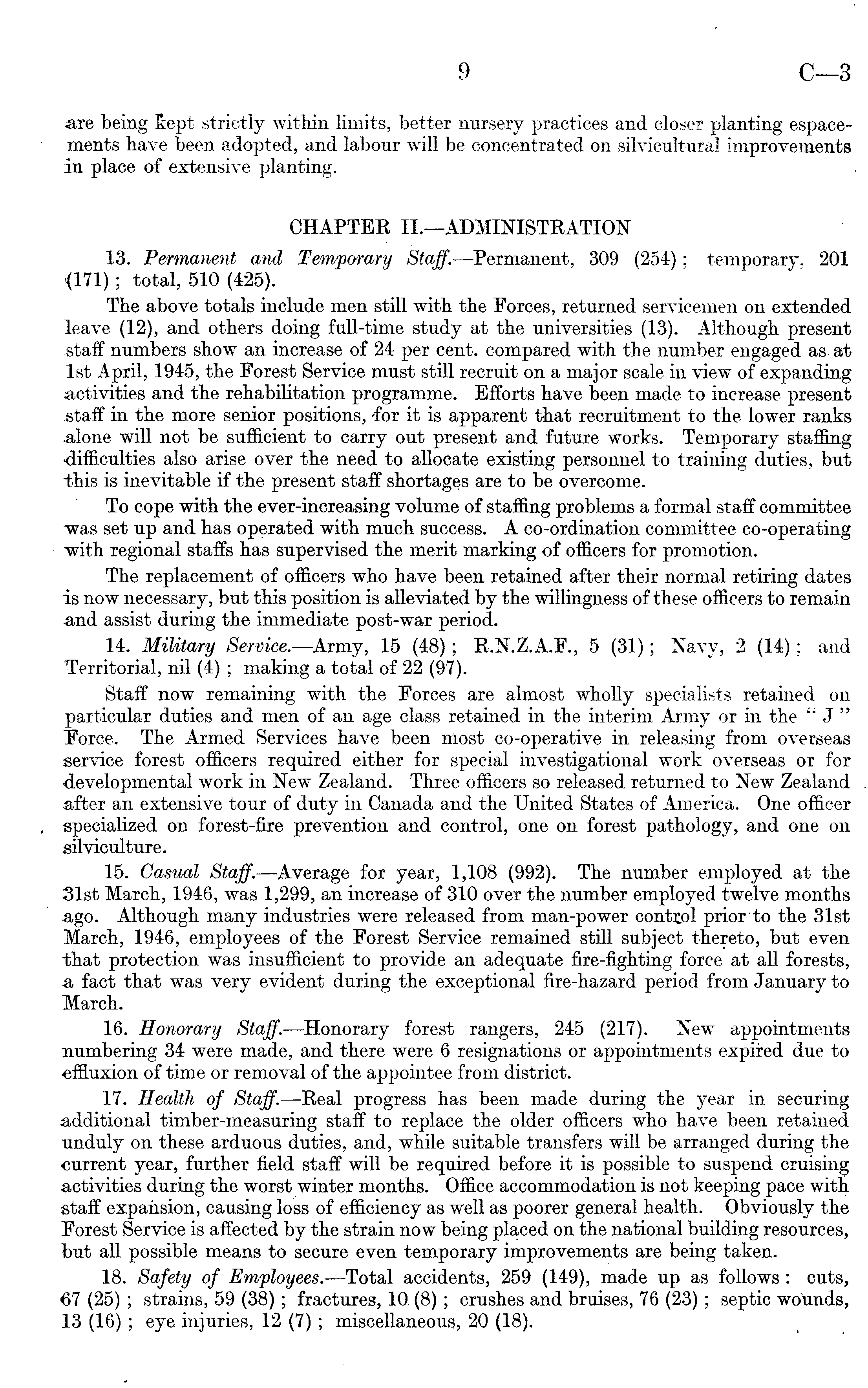 are being Sept strictly within limits, better nursery practices and closer planting espacements have been adopted, and labour will be concentrated on silvicultural improvements in place of extensive planting. CHAPTER lI.—ADMINISTRATION 13. Permanent and Temporary Staff. —Permanent, 309 (254); temporarv- 201 <171); total, 510 (425). The above totals include men still with the Forces, returned servicemen on extended leave (12), and others doing full-time study at the universities (13). Although present staff numbers show an increase of 24 per cent, compared with the number engaged as at Ist April, 1945, the Forest Service must still recruit on a major scale in view of expanding activities and the rehabilitation programme. Efforts have been made to increase present staff in the more senior positions, <for it is apparent that recruitment to the lower ranks •alone will not be sufficient to carry out present and future works. Temporary staffing •difficulties also arise over the need to allocate existing personnel to training duties, but this is inevitable if the present staff shortages are to be overcome. To cope with the ever-increasing volume of staffing problems a formal staff committee was set up and has operated with much success. A co-ordination committee co-operating with regional staffs has supervised the merit marking of officers for promotion. The replacement of officers who have been retained after their normal retiring dates is now necessary, but this position is alleviated by the willingness of these officers to remain ■and assist during the immediate post-war period. 14. Military Service.—Army, 15 (48); R.N.Z.A.F., 5 (31); Navy, 2 (14); and Territorial, nil (4) ; making a total of 22 (97). Staff now remaining with the Forces are almost wholly specialists retained on particular duties and men of an age class retained in the interim Army or in the " J " Force. The Armed Services have been most co-operative in releasing from overseas service forest officers required either for special investigational work overseas or for developmental work in New Zealand. Three officers so released returned to New Zealand after an extensive tour of duty in Canada and the United States of America. One officer specialized on forest-fire prevention and control, one on forest pathology, and one on silviculture. 15. Casual Staff. —Average for year, 1,108 (992). The number employed at the 31st March, 1946, was 1,299, an increase of 310 over the number employed twelve months ago. Although many industries were released from man-power control priorto the 31st March, 1946, employees of the Forest Service remained still subject thereto, but even that protection was insufficient to provide an adequate fire-fighting force at all forests, a, fact that was very evident during the exceptional fire-hazard period from January to March. 16. Honorary Staff. —Honorary forest rangers, 245 (217). New appointments numbering 34 were made, and there were 6 resignations or appointments expired due to ■effluxion of time or removal of the appointee from district. 17. Health of Staff. —Real progress has been made during the year in securing additional timber-measuring staff to replace the older officers who have been retained unduly on these arduous duties, and, while suitable transfers will be arranged during the current year, further field staff will be required before it is possible to suspend cruising activities during the worst winter months. Office accommodation is not keeping pace with staff expansion, causing loss of efficiency as well as poorer general health. Obviously the Forest Service is affected by the strain now being placed on the national building resources, but all possible means to secure even temporary improvements are being taken. 18. Safety of Employees. —Total accidents, 259 (149), made up as follows : cuts, 67 (25) ; strains, 59 (38); fractures, 10 (8); crushes and bruises, 76 (23); septic wounds, 13 (16) ; eye injuries, 12 (7) ; miscellaneous, 20 (18).