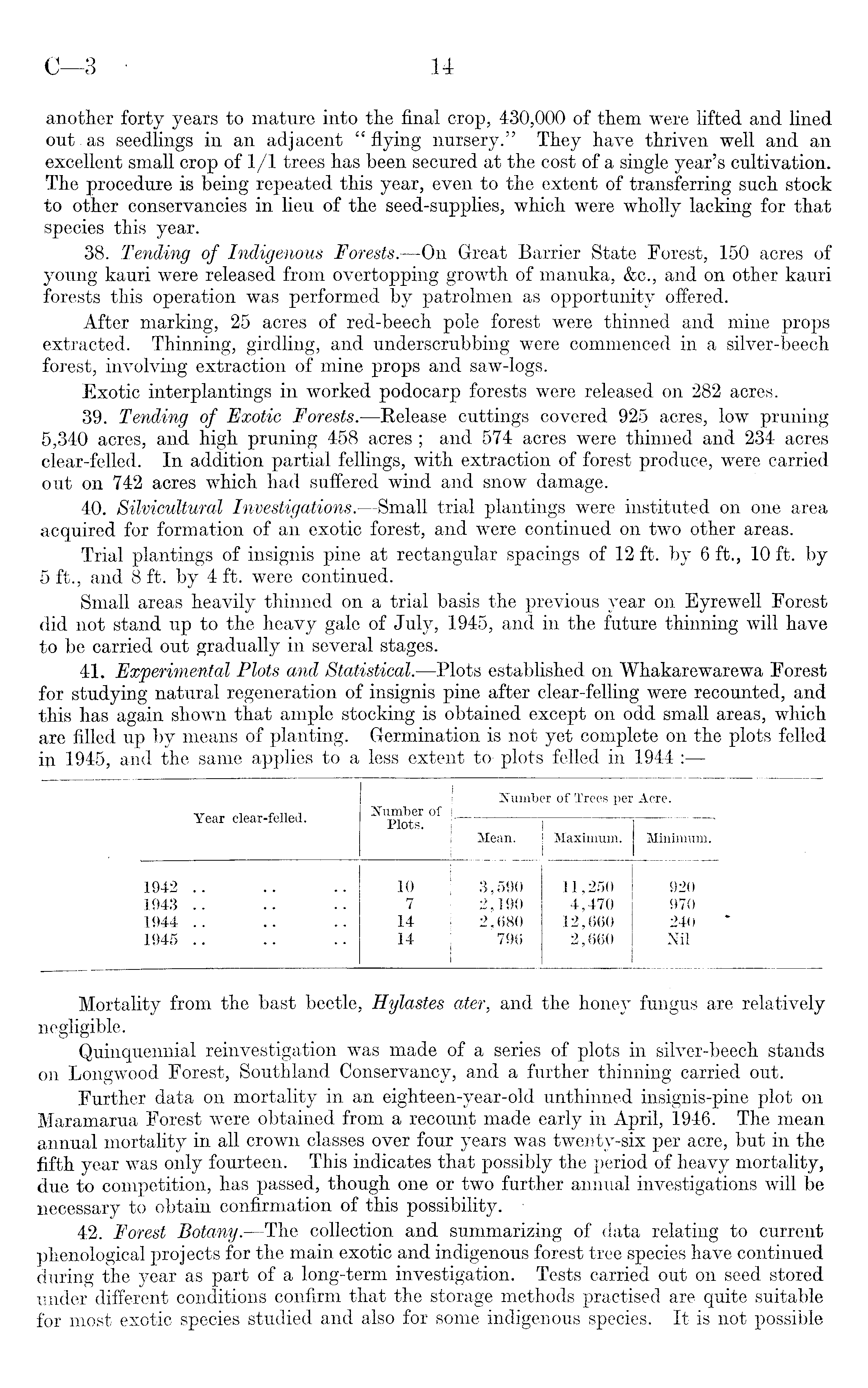 Year clear-felled. Number of Number of Trees per Acre. Plots. Mean. Maximum. Minimum. 1942 .. 1943 .. 1944 1945 .. 10 7 14 14 3,590 2,190 2,680 796 11,250 4,470 12,660 2,660 920 970 240 Nil