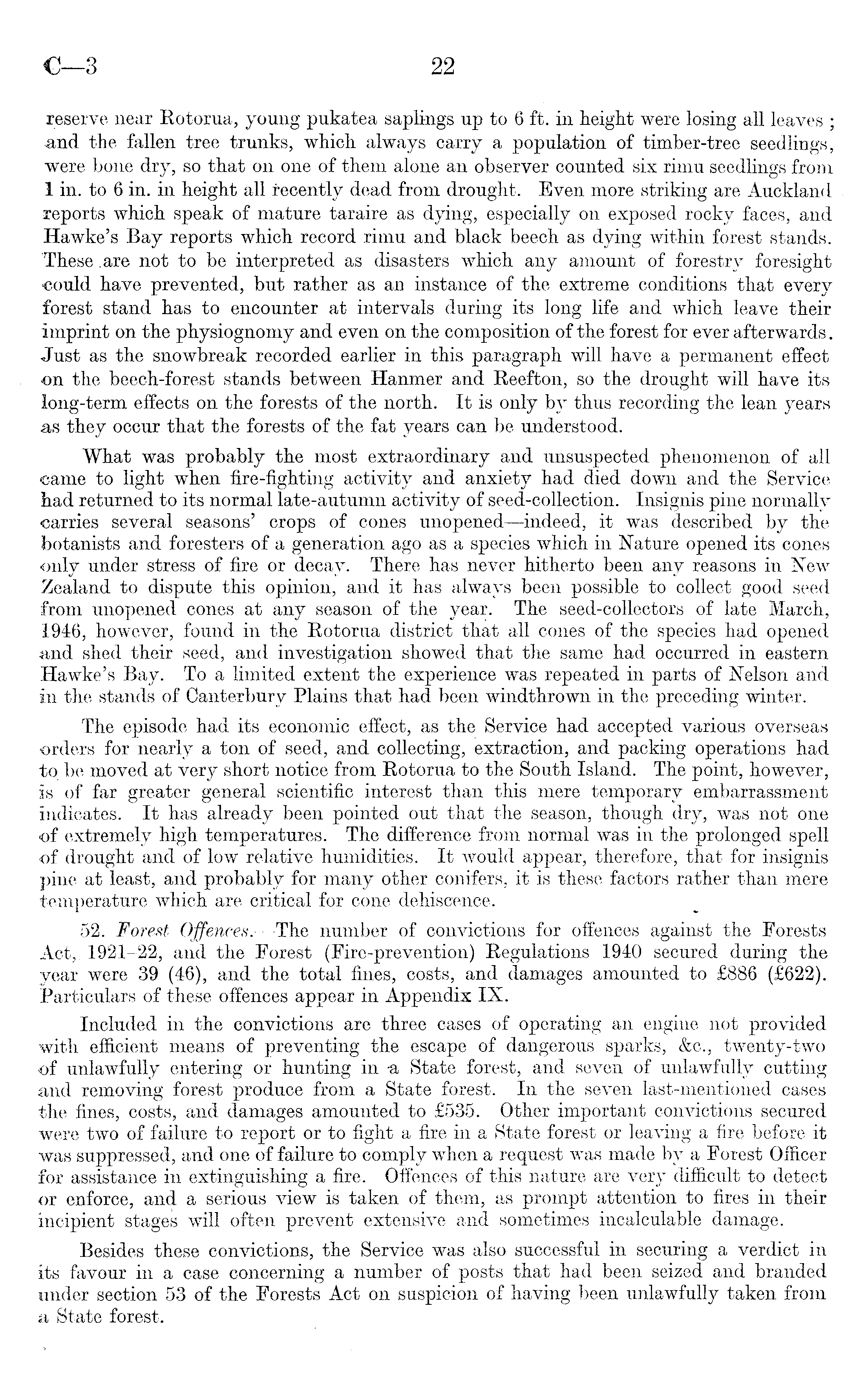 reserve near Rotorua, young pukatea saplings up to 6 ft. in height were losing all leaves ; and the fallen tree trunks, which always carry a population of timber-tree seedlings, were bone dry, so that on one of them alone an observer counted six rimu seedlings from 1 in. to 6 in. in height all recently dead from drought. Even more striking are Auckland reports which speak of mature taraire as dying, especially on exposed rocky faces, and Hawke's Bay reports which record rimu and black beech as dying within forest stands. These .are not to be interpreted as disasters which any amount of forestry foresight •could have prevented, but rather as an instance of the extreme conditions that every forest stand has to encounter at intervals during its long life and which leave their imprint on the physiognomy and even on the composition of the forest for ever afterwards. Just as the snowbreak recorded earlier in this paragraph will have a permanent effect on the beech-forest stands between Hanmer and Reefton, so the drought will have its long-term effects on the forests of the north. It is only by thus recording the lean years as they occur that the forests of the fat years can be understood. What was probably the most extraordinary and unsuspected phenomenon of all came to light when fire-fighting activity and anxiety had died down and the Service had returned to its normal late-autumn activity of seed-collection. Insignis pine normally carries several seasons' crops of cones unopened—indeed, it was described by the botanists and foresters of a generation ago as a species which in Nature opened its cones only under stress of fire or decay. There has never hitherto been any reasons in New Zealand to dispute this opinion, and it has always been possible to collect good seed from unopened cones at any season of the year. The seed-collectors of late March, 1946, however, found in the Rotorua district that all cones of the species had opened and shed their seed, and investigation showed that the same had occurred in eastern Hawke's Bay. To a limited extent the experience was repeated in parts of Nelson and in the stands of Canterbury Plains that had been windthrown in the preceding winter. The episode had its economic effect, as the Service had accepted various overseas orders for nearly a ton of seed, and collecting, extraction, and packing operations had to be moved at very short notice from Rotorua to the South Island. The point, however, is of far greater general scientific interest than this mere temporary embarrassment indicates. It has already been pointed out that the season, though dry, was not one of extremely high temperatures. The difference from normal was in the prolonged spell of drought and of low relative humidities. It would appear, therefore, that for insignis pine at least, and probably for many other conifers, it is these factors rather than mere temperature which are critical for cone dehiscence. 52. Forest Offences. —The number of convictions for offences against the Forests Act,. 1921-22, and the Forest (Fire-prevention) Regulations 1940 secured during the year were 39 (46), and the total fines, costs, and damages amounted to £BB6 (£622). Particulars of these offences appear in Appendix IX. Included in the convictions are three cases of operating an engine not provided with efficient means of preventing the escape of dangerous sparks, &c., twenty-two of unlawfully entering or hunting in -a State forest, and seven of unlawfully cutting and removing forest produce from a State forest. In the seven last-mentioned cases the fines, costs, and damages amounted to £535. Other important convictions secured were two of failure to report or to fight a fire in a State forest or leaving a fire before it was suppressed, and one of failure to comply when a request was made by a Forest Officer for assistance in extinguishing a fire. Offences of this nature are very difficult to detect or enforce, and a serious view is taken of them, as prompt attention to fires in their incipient stages will often prevent extensive and sometimes incalculable damage. Besides these convictions, the Service was also successful in securing a verdict in its favour in a case concerning a number of posts that had been seized and branded under section 53 of the Forests Act on suspicion of having been unlawfully taken from a State forest.