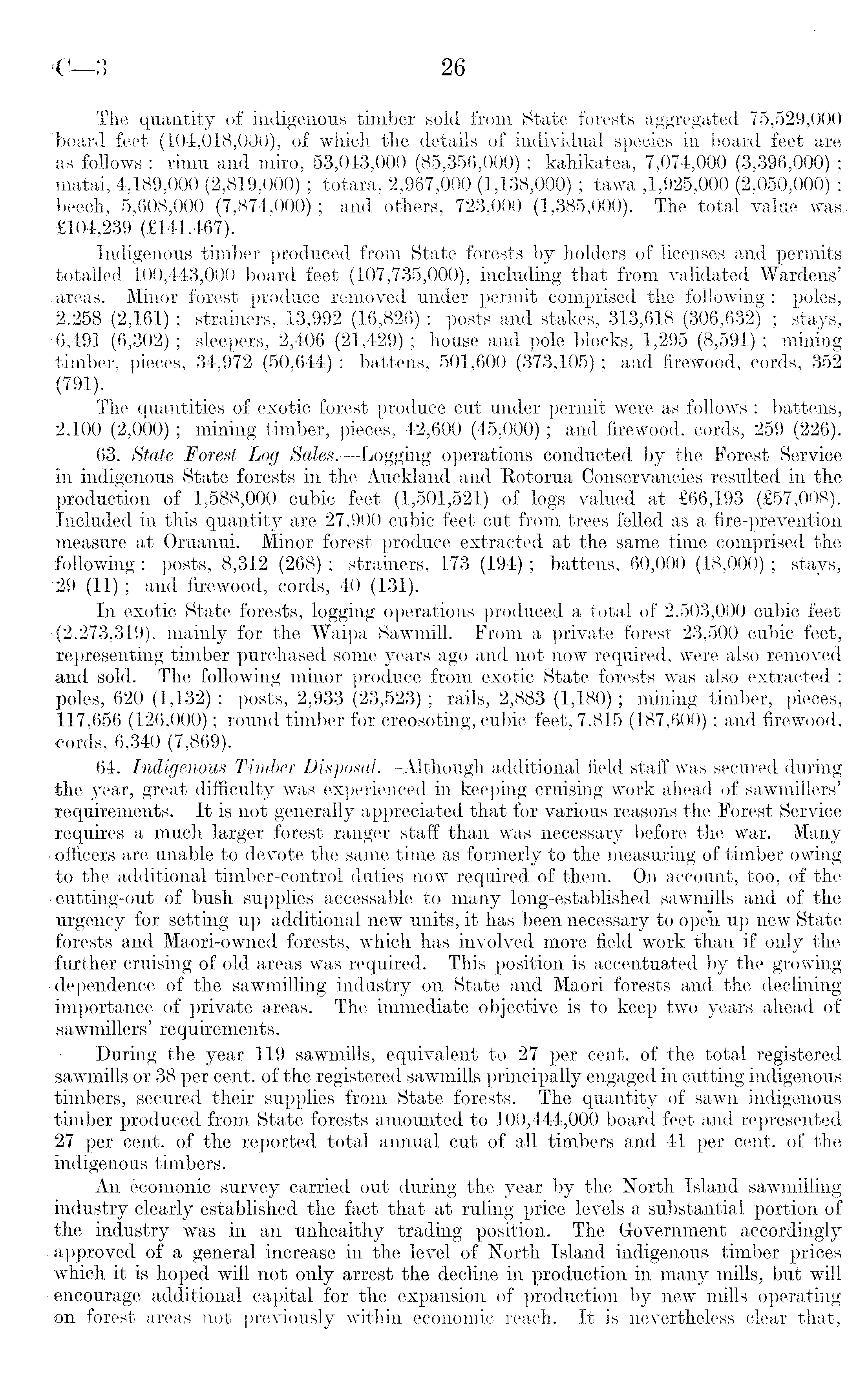 The quantity of indigenous timber sold from State forests aggregated 75,529,000 board feet (104,018,000), of which the details of individual species in board feet are as follows : rimu and miro, 53,043,000 (85,356,000); kahikatea, 7,074,000 (3,396,000) ; matai, 4,189,000 (2,819,000); totara, 2,967,000 (1,138,000); tawa ,1,925,000 (2,050,000) ; beech, 5,608,000 (7,874,000); and others, 723,000 (1,385,000). The total value was. .£104,239 (£141,467). Indigenous timber produced from State forests by holders of licenses and permits totalled 100,443,000 board feet (107,735,000), including that from validated Wardens' .areas. Minor forest produce removed under permit comprised the following : poles, 2,258 (2,161) ; strainers, 13,992 (16,826); posts and stakes, 313,618 (306,632) ; stays, ■6,491 (6,302) ; sleepers, 2,406 (21,429); house and pole blocks, 1,295 (8,591); mining timber, pieces, 34,972 (50,644) ; battens, 501,600 (373,105); and firewood, cords, 352 ■(791). The quantities of exotic forest produce cut under permit were as follows : battens, '2,100 (2,000); mining timber, pieces, 42,600 (45,000); and firewood, cords, 259 (226). 63. State Forest Log Sales.—Logging operations conducted by the Forest Service in indigenous State forests in the Auckland and Rotorua Conservancies resulted in the production of 1,588,000 cubic feet (1,501,521) of logs valued at £66,193 (£57,008). Included in this quantity are 27,900 cubic feet cut from trees felled as a fire-prevention measure at Oruanui. Minor forest produce extracted at the same time comprised the following : posts, 8,312 (268) ; strainers, 173 (194); battens, 60,000 (18,000) ; stays, 29 (11) ; and firewood, cords, 40 (131). In exotic State forests, logging operations produced a total of 2,503,000 cubic feet '(2,273,319), mainly for the Waipa Sawmill. From a private forest 23,500 cubic feet, representing timber purchased some years ago and not now required, were also removed and sold. The following minor produce from exotic State forests was also extracted : poles, 620 (1,132) ; posts, 2,933 (23,523) ; rails, 2,883 (1,180); mining timber, pieces, 117,656 (126,000); round timber for creosoting, cubic feet, 7,815 (187,600); and firewood, cords, 6,340 (7,869). 64. Indigenous Timber Disposal.—Although additional field staff was secured during the year, great difficulty was experienced in keeping cruising work ahead of sawmillers' requirements. It is not generally appreciated that for various reasons the Forest Service requires a much larger forest ranger staff than was necessary before the war. Many -officers are unable to devote the same time as formerly to the measuring of timber owing to the additional timber-control duties now required of them. On account, too, of the -cutting-out of bush supplies accessable to many long-established sawmills and of the urgency for setting up additional new units, it has been necessary to open up new State forests and Maori-owned forests, which has involved more field work than if only the further cruising of old areas was required. This position is accentuated by the growing dependence of the sawmilling industry on State and Maori forests and the declining importance of private areas. The immediate objective is to keep two years ahead of sawmillers' requirements. During the year 119 sawmills, equivalent to 27 per cent, of the total registered sawmills or 38 per cent, of the registered sawmills principally engaged in cutting indigenous timbers, secured their supplies from State forests. The quantity of sawn indigenous timber produced from State forests amounted to 100,444,000 board feet and represented 27 per cent, of the reported total annual cut of all timbers and 41 per cent, of the indigenous timbers. An ecomonic survey carried out during the year by the North Island sawmilling industry clearly established the fact that at ruling price levels a substantial portion of the industry was in an unhealthy trading position. The Government accordingly approved of a general increase in the level of North Island indigenous timber prices which it is hoped will not only arrest the decline in production in many mills, but will encourage additional capital for the expansion of production by new mills operating on forest areas not previously within economic reach. It is nevertheless clear that,