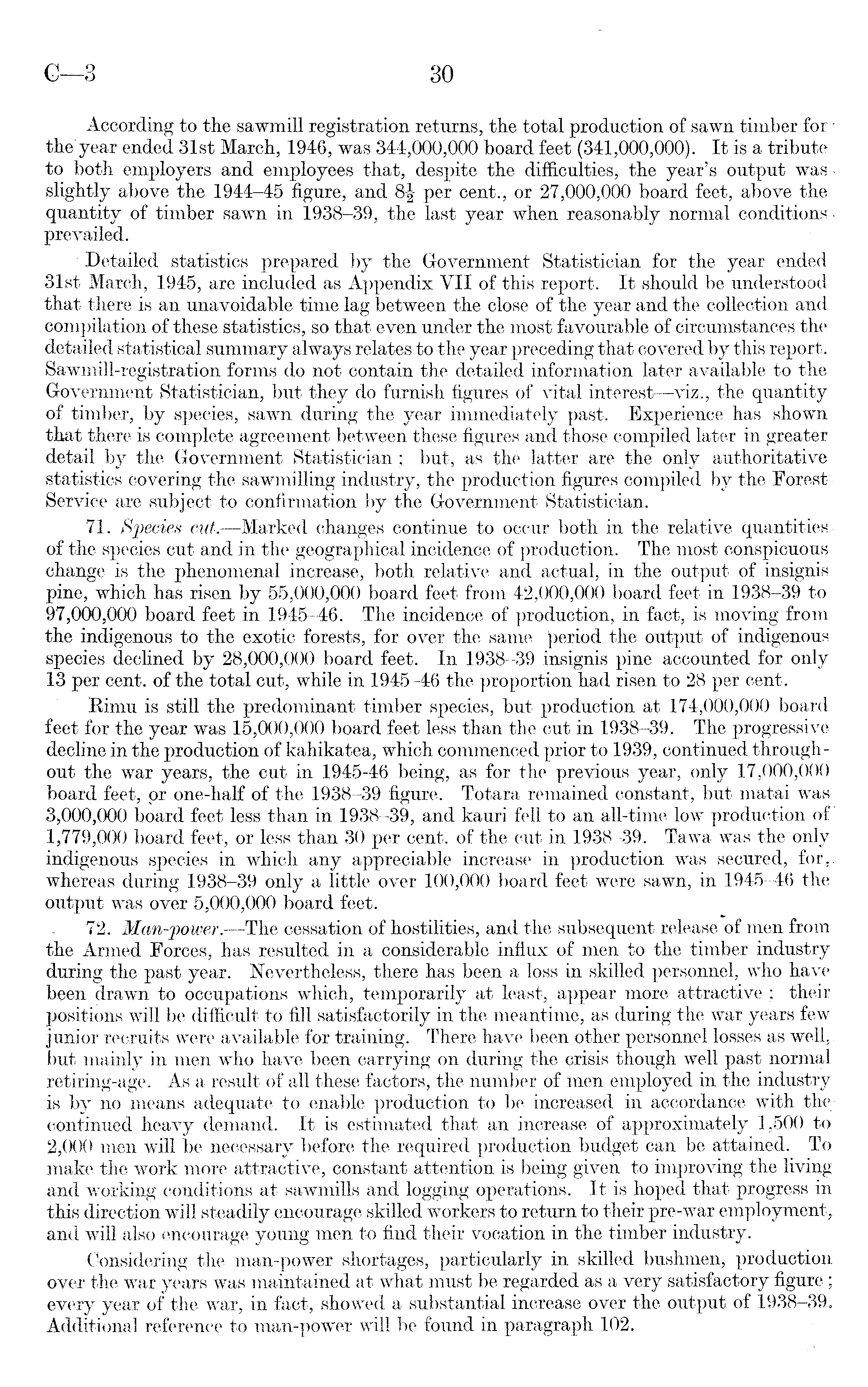According to the sawmill registration returns, the total production of sawn timber for ■ the year ended 31st March, 1946, was 344,000,000 board feet (341,000,000). It is a tribute to both employers and employees that, despite the difficulties, the year's output was slightly above the 1944-45 figure, and 8| per cent., or 27,000,000 board feet, above the quantity of timber sawn in 1938-39, the last year when reasonably normal conditionsprevailed. Detailed statistics prepared by the Government Statistician for the year ended 31st March, 1945, are included as Appendix VII of this report. It should be understood that there is an unavoidable time lag between the close of the year and the collection and compilation of these statistics, so that even under the most favourable of circumstances the detailed statistical summary always relates to the year preceding that covered by this report. Sawmill-registration forms do not contain the detailed information later available to the Government Statistician, but they do furnish figures of vital interest—viz., the quantity of timber, by species, sawn during the year immediately past. Experience has shown that there is complete agreement between these figures and those compiled later in greater detail by the Government Statistician ; but, as the latter are the only authoritative statistics covering the sawmilling industry, the production figures compiled by the Forest Service are subject to confirmation by the Government Statistician. 71. Species cut.- —Marked changes continue to occur both in the relative quantities of the species cut and in the geographical incidence of production. The most conspicuous change is the phenomenal increase, both relative and actual, in the output of insignis pine, which ha£ risen by 55,000,000 board feet from 42,000,000 board feet in 1938-39 to 97,000,000 board feet in 1945-46. The incidence of production, in fact, is moving from the indigenous to the exotic forests, for over the same period the output of indigenous species declined by 28,000,000 board feet. In 1938-39 insignis pine accounted for only 13 per cent, of the total cut, while in 1945-46 the proportion had risen to 28 per cent. Rimu is still the predominant timber species, but production at 174,000,000 board feet for the year was 15,000,000 board feet less than the cut in 1938-39. The progressive decline in the production of kahikatea, which commenced prior to 1939, continued throughout the war years, the cut in 1945-46 being, as for the previous year, only 17,000,000 board feet, or one-half of the 1938-39 figure. Totara remained constant, but matai was 3,000,000 board feet less than in 1938-39, and kauri fell to an all-time low production of 1,779,000 board feet, or less than 30 per cent, of the cut in 1938-39. Tawa was the only indigenous species in which any appreciable increase in production was secured, for,, whereas during 1938-39 only a little over 100,000 board feet were sawn, in 1945-46 the output was over 5,000,000 board feet. 72. Man-power.—The cessation of hostilities, and the subsequent release of men from the Armed Forces, has resulted in a considerable influx of men to the timber industry during the past year. Nevertheless, there has been a loss in skilled personnel, who have been drawn to occupations which, temporarily at least, appear more attractive ; their positions will be difficult to fill satisfactorily in the meantime, as during the war years few junior recruits were available for training. There have been other personnel losses as well,, but mainly in men who have been carrying on during the crisis though well past normal retiring-age. As a result of all these factors, the number of men employed in the industry is by no means adequate to enable production to be increased in accordance with the; continued heavy demand. It is estimated that an increase of approximately 1,500 to 2,000 men will be necessary before the required production budget can be attained. To make the work more attractive, constant attention is being given to improving the living and working conditions at sawmills and logging operations. It is hoped that progress in this direction will steadily encourage skilled workers to return to their pre-war employment, and will also encourage young men to find their vocation in the timber industry. Considering the man-power shortages, particularly in skilled bushmen, production over the war years was maintained at what must be regarded as a very satisfactory figure ; every year of the war, in fact, showed a substantial increase over the output of 1938-39. Additional reference to man-power will be found in paragraph 102.