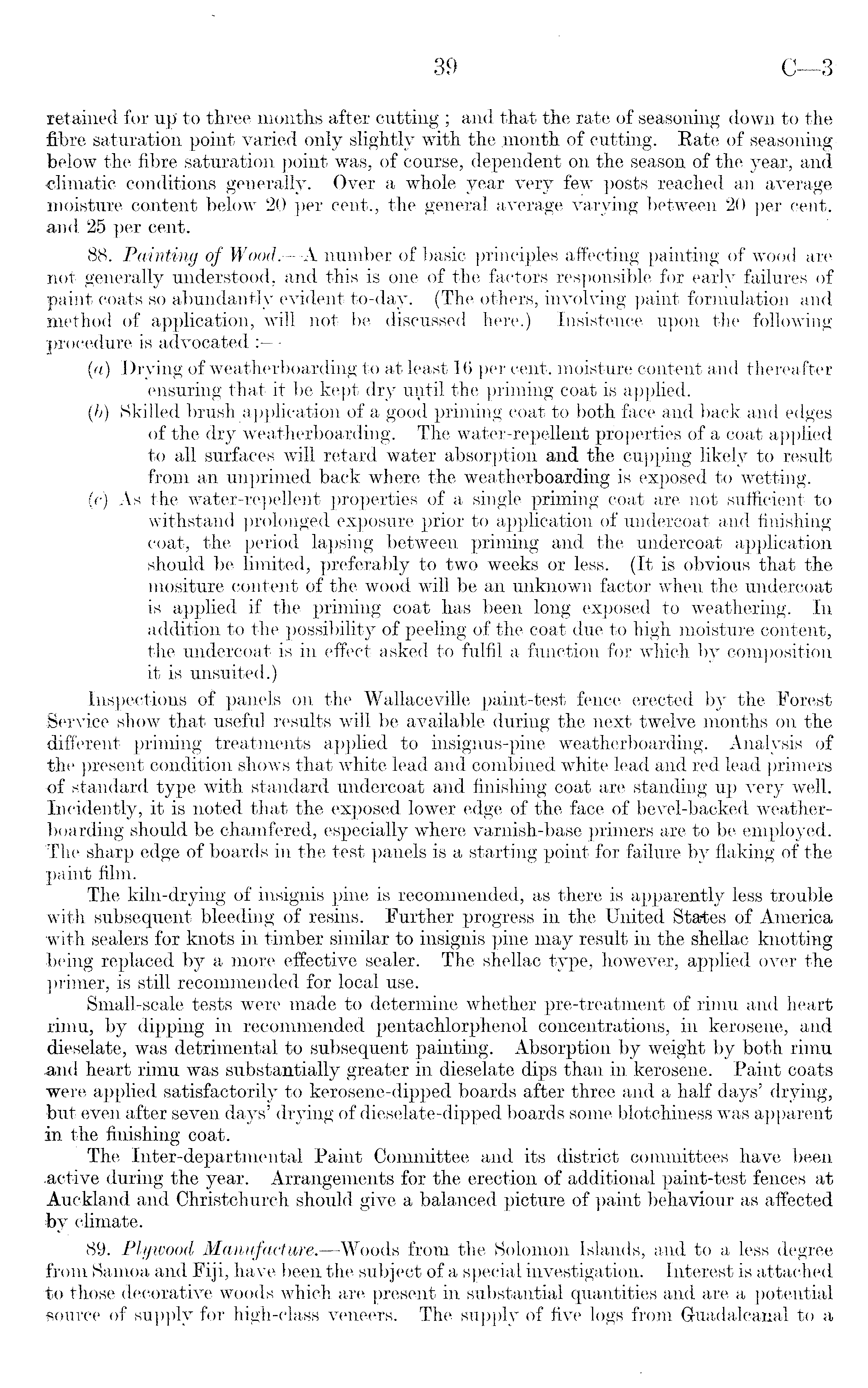 retained for up to three months after cutting ; and that the rate of seasoning down to the fibre saturation point varied only slightly with the month of cutting. Rate of seasoning below the fibre saturation point was, of course, dependent on the season of the year, and climatic conditions generally. Over a whole year very few posts reached an average moisture content below 20 per cent., the general average varying between 20 per cent, and 25 per cent. 88. Painting of Wood. —A number of basic principles affecting painting of wood are not generally understood, and this is one of the factors responsible for early failures of paint coats so abundantly evident to-day. (The others, involving paint formulation and method of application, will not be discussed here.) Insistence upon the following procedure is advocated : (a) Drying of weatherboarding to at least 16 per cent, moisture content and thereafter ensuring that it be kept dry up.til the priming coat is applied. (b) Skilled brush application of a good priming coat to both face and back and edges of the dry weatherboarding. The water-repellent properties of a coat applied to all surfaces will retard water absorption and the cupping likely to result from an unprimed back where the weatherboarding is exposed to wetting. (c) As the water-repellent properties of a single priming coat are not sufficient to withstand prolonged exposure prior to application of undercoat and finishing coat, the period lapsing between priming and the undercoat application should be limited, preferably to two weeks or less. (It is obvious that the mositure content of the wood will be an unknown factor when the undercoat is applied if the priming coat has been long exposed to weathering. In addition to the possibility of peeling of the coat due to high moisture content, the undercoat is in effect asked to fulfil a function for which by composition it is unsuited.) Inspections of panels on the Wallaceville paint-test fence erected by the Forest Service show that useful results will be available during the next twelve months on the different priming treatments applied to insignus-pine weatherboarding. Analysis of the present condition shows that white lead and combined white lead and red lead primers of standard type with standard undercoat and finishing coat are standing up very well. Incidently, it is noted that the exposed lower edge of the face of bevel-backed weatherboarding should be chamfered, especially where varnish-base primers are to be employed. The sharp edge of boards in the test panels is a starting point for failure by flaking of the paint film. The kiln-drying of insignis pine is recommended, as there is apparently less trouble with subsequent bleeding of resins. Further progress in the United States of America with sealers for knots in timber similar to insignis pine may result in the shellac knotting being replaced by a more effective sealer. The shellac type, however, applied over the primer, is still recommended for local use. Small-scale tests were made to determine whether pre-treatment of rimu and heart rimu, by dipping in recommended pentachlorphenol concentrations, in kerosene, and dieselate, was detrimental to subsequent painting. Absorption by weight by both rimu and heart rimu was substantially greater in dieselate dips than in kerosene. Paint coats were applied satisfactorily to kerosene-dipped boards after three and a half days' drying, but even after seven days' drying of dieselate-dipped boards some blotchiness was apparent in the finishing coat. The Inter-departmental Paint Committee and its district committees have been active during the year. Arrangements for the erection of additional paint-test fences at Auckland and Christchurch should give a balanced picture of paint behaviour as affected foy climate. 89. Plywood Manufacture. —Woods from the Solomon Islands, and to a less degree from Samoa and Fiji, have been the subject of a special investigation. Interest is attached to those decorative woods which are present in substantial quantities and are a potential source of supply for high-class veneers. The supply of five logs from Guadalcanal to a