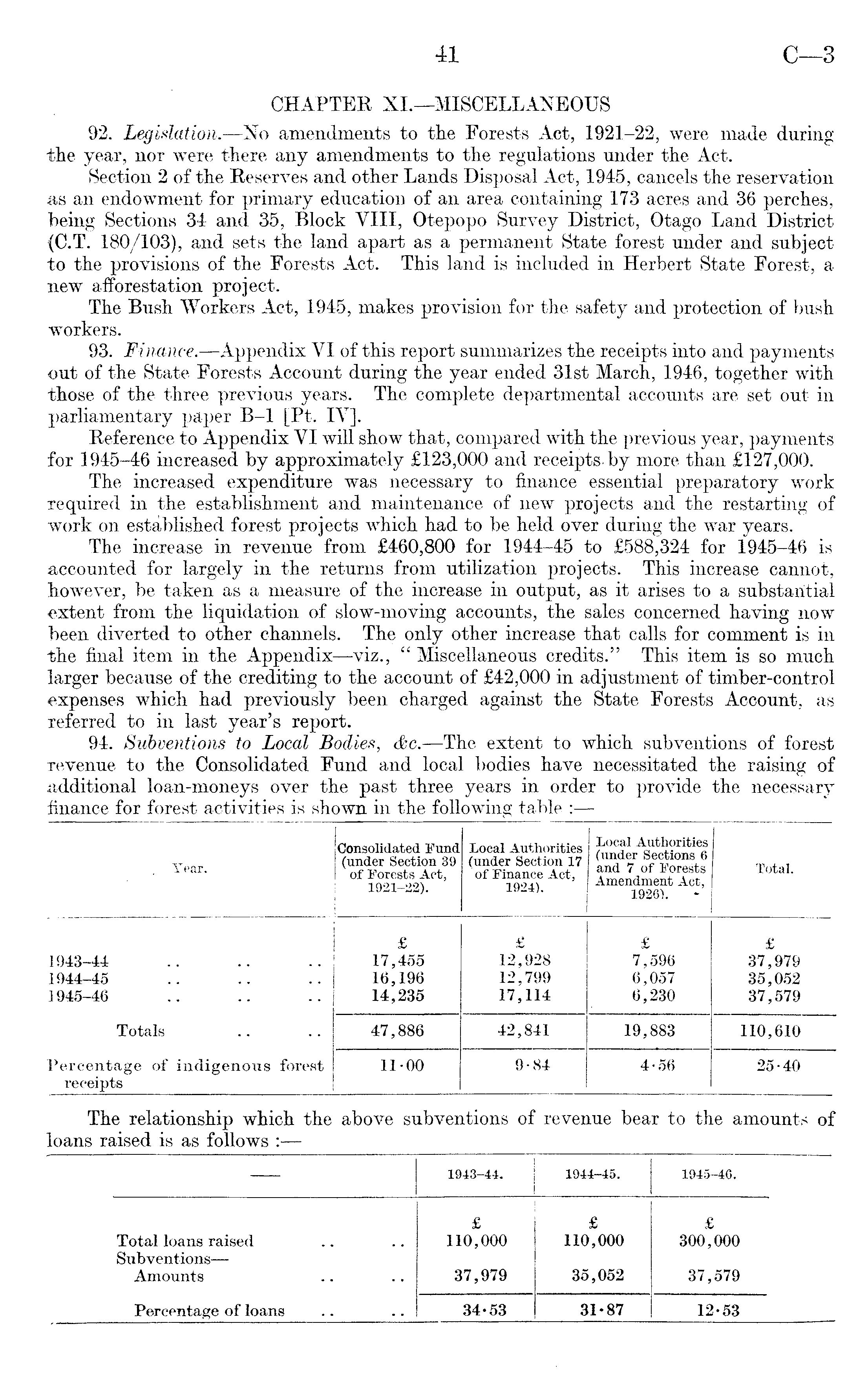 . Year. Consolidated Fund (under Section 39 of Forests Act, 1921-22). Local Authorities (under Section 17 of Finance Act, 1924). Local Authorities (under Sections 6 and 7 of Forests Amendment Act, 1926). Total. 1943-44 1944-45 1945-46 £ 17,455 16,196 14,235 £ 12,928 12,799 17,114 £ 7,596 6,057 6,230 £ 37,979 35,052 37,579 Totals 47,886 42,841 19,883 110,610 Percentage of indigenous forest receipts 11-00 9-84 4-56 25-40