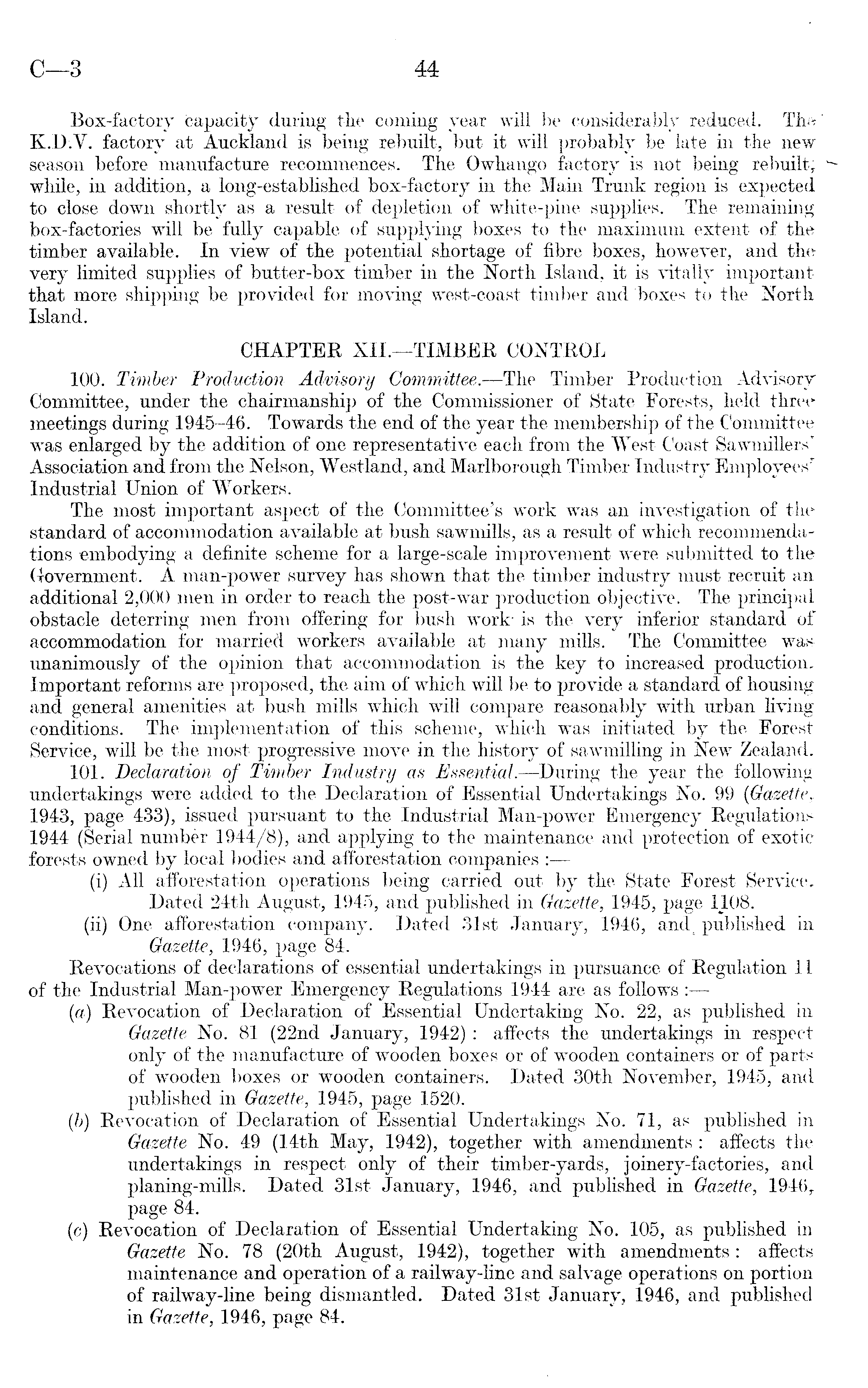 Box-factory Capacity during the coming year will be considerably reduced. The K.D.V. factory at Auckland is being rebuilt, but it will probably be late in the new season before manufacture recommences. The Owhango factory is not being rebuilt, while, in addition, a long-established box-factory in the Main Trunk region is expected to close down shortly as a result of depletion of white-pine supplies. The remaining box-factories will be fully capable of supplying boxes to the maximum extent of the timber available. In view of the potential shortage of fibre boxes, however, and the very limited supplies of butter-box timber in the North Island, it is vitally important that more shipping be provided for moving west-coast timber and boxes to the North Island. CHAPTER XII.—TIMBER CONTROL 100. Timber Production Advisory Committee. —The Timber Production Advisory Committee, under the chairmanship of the Commissioner of State Forests, held three meetings during 1945-46. Towards the end of the year the membership of the Committee was enlarged by the addition of one representative each from the West Coast Sawmillers" Association and from the Nelson, Westland, and Marlborough Timber Industry Employees* Industrial Union of Workers. The most important aspect of the Committee's work was an investigation of the standard of accommodation available at bush sawmills, as a result of which recommendations embodying a definite scheme for a large-scale improvement were submitted to the Government. A man-power survey has shown that the timber industry must recruit an additional 2,000 men in order to reach the post-war production objective. The principal obstacle deterring men from offering for bush work- is the very inferior standard of accommodation for married workers available at many mills. The Committee was unanimously of the opinion that accommodation is the key to increased production. Important reforms are proposed, the aim of which will be to provide a standard of housing and general amenities at bush mills which will compare reasonably with urban living conditions. The implementation of this scheme, which was initiated by the Forest Service, will be the most progressive move in the history of sawmilling in New Zealand. 101. Declaration of Timber Industry as Essential. —During the year the following undertakings were added to the Declaration of Essential Undertakings No. 99 (Gazette r 1943, page 433), issued pursuant to the Industrial Man-power Emergency Regulations 1944 (Serial'number 1944/8), and applying to the maintenance and protection of exotic forests owned by local bodies and afforestation companies : (i) All afforestation operations being carried out by the State Forest Service. Dated 24th August, 1945, and published in Gazette, 1945, page 1108. (ii) One afforestation company. Dated 31st January, 1946, and, published in Gazette, 1946, page 84. Revocations of declarations of essential undertakings in pursuance of Regulation 11 of the Industrial Man-power Emergency Regulations 1944 are as follows : (a) Revocation of Declaration of Essential Undertaking No. 22, as published in Gazette No. 81 (22nd January, 1942) : affects the undertakings in respect only of the manufacture of wooden boxes or of wooden containers or of parts of wooden boxes or wooden containers. Dated 30th November, 1945, and published in Gazette, 1945, page 1520. (b) Revocation of Declaration of Essential Undertakings No. 71, as published in Gazette No. 49 (14th May, 1942), together with amendments : affects the undertakings in respect only of their timber-yards, joinery-factories, and planing-mills. Dated 31st January, 1946, and published in Gazette, 1946, page 84. (c) Revocation of Declaration of Essential Undertaking No. 105, as published in Gazette No. 78 (20th August, 1942), together with amendments: affects maintenance and operation of a railway-line and salvage operations on portion of railway-line being dismantled. Dated 31st January, 1946, and published in Gazette, 1946, page 84.