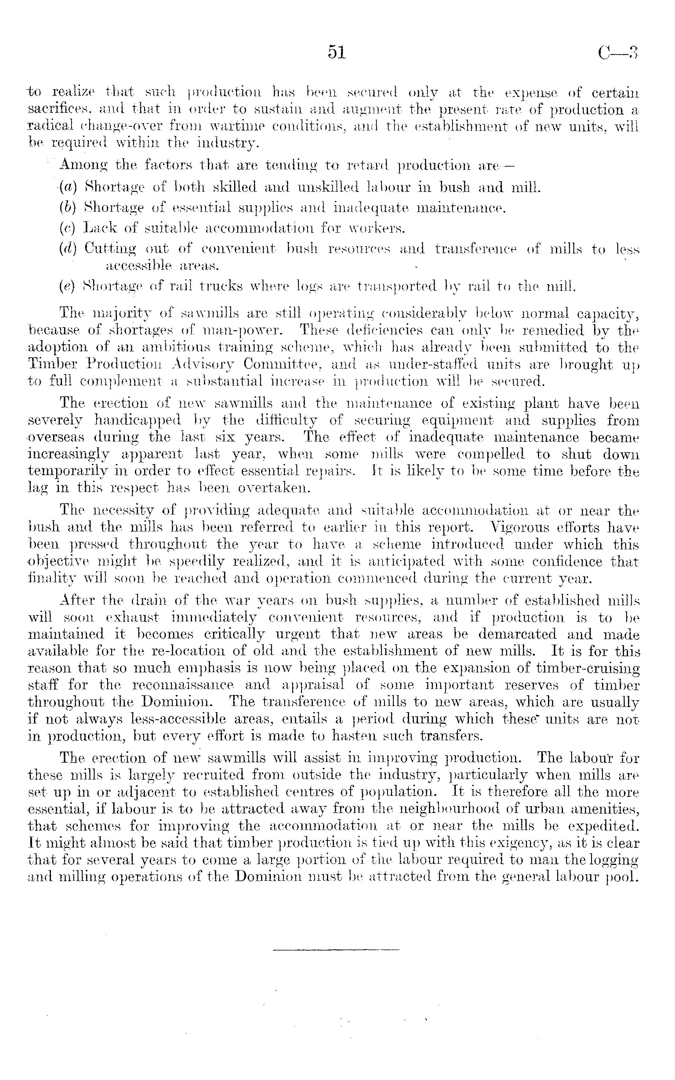 to realize that such production has been secured only at the expense of certain sacrifices, and that in order to sustain and augment the present rate of production a radical change-over from wartime conditions, and the establishment of new units, will be required within the industry. Among the factors that are tending to retard production are — (a) Shortage of both skilled and unskilled labour in bush and mill. (b) Shortage of essential supplies and inadequate maintenance. (c) Lack of suitable accommodation for workers. (d) Cutting out of convenient bush resources and transference of mills to less accessible areas. (e) Shortage of rail trucks where logs are transported by rail to the mill. The majority of sawmills are still operating considerably below normal capacity, because of shortages of man-power. These deficiencies can only be remedied by the adoption of an ambitious training scheme, which has already, been submitted to the Timber Production Advisory Committee, and as under-staffed units are brought up to full complement a substantial increase in production will be secured. The erection of new sawmills and the maintenance of existing plant have been severely handicapped by the difficulty of securing equipment and supplies from •overseas during the last six years. The effect of inadequate maintenance became increasingly apparent last year, when some mills were compelled to shut down temporarily in order to effect essential repairs. It is likely to be some time before the lag in this respect has been overtaken. The necessity of providing adequate and suitable accommodation at or near the bush and the mills has been referred to earlier in this report. Vigorous efforts have been pressed throughout the year to have a scheme introduced under which this objective might be speedily realized, and it is anticipated with some confidence that finality will soon be reached and operation commenced during the current year. After the drain of the war years on bush supplies, a number of established mills will soon exhaust immediately convenient resources, and if production is to be maintained it becomes critically urgent that new areas be demarcated and made available for the re-location of old and the establishment of new mills. It is for this reason that so much emphasis is now being placed on the expansion of timber-cruising staff for the reconnaissance and appraisal of some important reserves of timber throughout the Dominion. The transference of mills to new areas, which are usually if not always less-accessible areas, entails a period during which these* units are not in production, but every effort is made to hasten such transfers. The erection of new sawmills will assist in improving production. The laboui* for these mills is largely recruited from outside the industry, particularly when mills are set up in or adjacent to established centres of population. It is therefore all the more essential, if labour is to be attracted away from the neighbourhood of urban amenities, that schemes for improving the accommodation at or near the mills be expedited. It might almost be said that timber production is tied up with this exigency, as it is clear that for several years to come a large portion of the labour required to man the logging and milling operations of the Dominion must be attracted from the general labour pool.