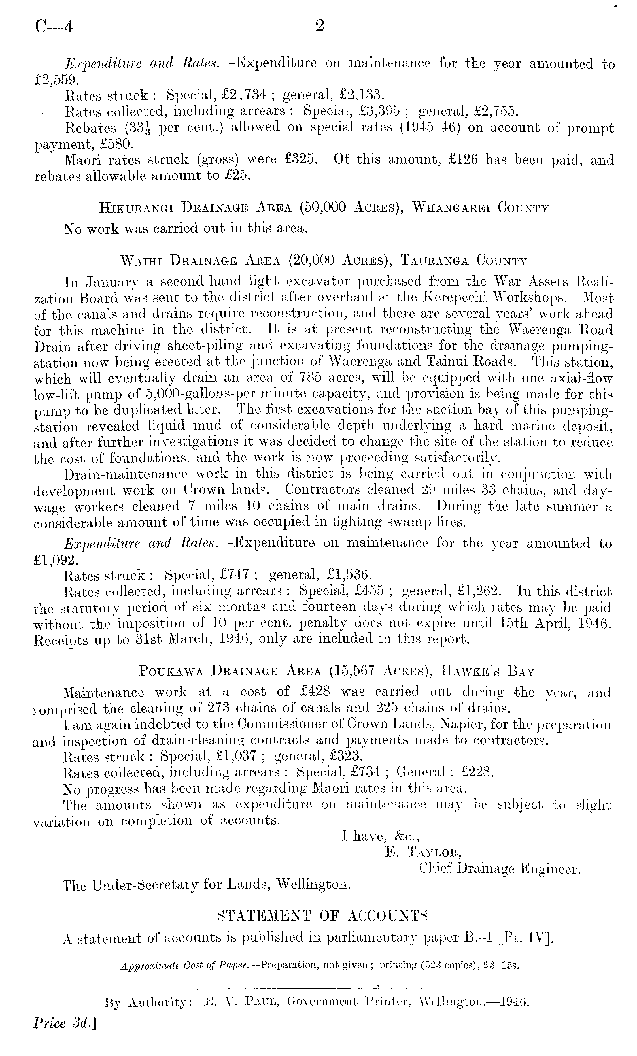 Expenditure and Rates. —Expenditure on maintenance for the year amounted to £2,559. Kates struck : Special, £2,734 ; general, £2,133. Rates collected, including arrears : Special, £3,395 ; general, £2,755. Rebates per cent.) allowed on special rates (1945-46) on account of prompt payment, £5BO. v Maori rates struck (gross) were £325. Of this amount, £126 has been paid, and rebates allowable amount to £25. Hikurangi Drainage Area (50,000 Acres), Whangarei County No work was carried out in this area. Waihi Drainage Area (20,000 Acres), Tauranga County In January a second-hand light excavator purchased from the War Assets Realization Board was sent to the district after overhaul at the Kerepeehi Workshops. Most of the canals and drains require reconstruction, and there are several years' work ahead for this machine in the district. It is at present reconstructing the Waerenga Road Draim after driving sheet-piling and excavating foundations for the drainage pumpingstation now being erected at the junction of Waerenga and Tainui Roads. This station, which will eventually drain an area of 785 acres, will be equipped with one axial-flow low-lift pump of 5,000-gallons-per-minute capacity, and provision is being made for this pump to be duplicated later. The first excavations for the suction bay of this pumpingstation revealed liquid mud of considerable depth underlying a hard marine deposit, and after further investigations it was decided to change the site of the station to reduce the cost of foundations, and the work is now proceeding satisfactorily. Drain-maintenance work in this district is being carried out in conjunction with development work on Crown lands. Contractors cleaned 29 miles 33 chains, and daywage workers cleaned 7 miles 10 chains of main drains. During the late summer a considerable amount of time was occupied in fighting swamp fires. Expenditure and Rates. —Expenditure on maintenance for the year amounted to £1,092. Rates struck : Special, £747 ; general, £1,536. Rates collected, including arrears : Special, £455 ; general, £1,262. In this district' the statutory period of six months and fourteen days during which rates may be paid without the imposition of 10 per cent, penalty does not expire until 15th April, 1946. Receipts up to 31st March, 1946, only are included in this report. Poukawa Drainage Area (15,567 Acres), Hawke's Bay Maintenance work at a cost of £428 was carried out during the year, and 5 omprised the cleaning of 273 chains of canals and 225 chains of drains. I am again indebted to the Commissioner of Crown Lands, Napier, for the preparation and inspection of drain-cleaning contracts and payments made to contractors. Rates struck : Special, £1,037 ; general, £323. Rates collected, including arrears : Special, £734 ; General: £228. No progress has been made regarding Maori rates in this area. The amounts shown as expenditure on maintenance may be subject to slight variation on completion of accounts. I have, &c, E. Taylor, Chief Drainage Engineer. The Under-Secretary for Lands, Wellington. STATEMENT OF ACCOUNTS A statement of accounts is published in parliamentary paper 8.-l [Pt. IV]. Approximate Cost of Paper. —Preparation, not given ; printing (523 copies), £3 15s.