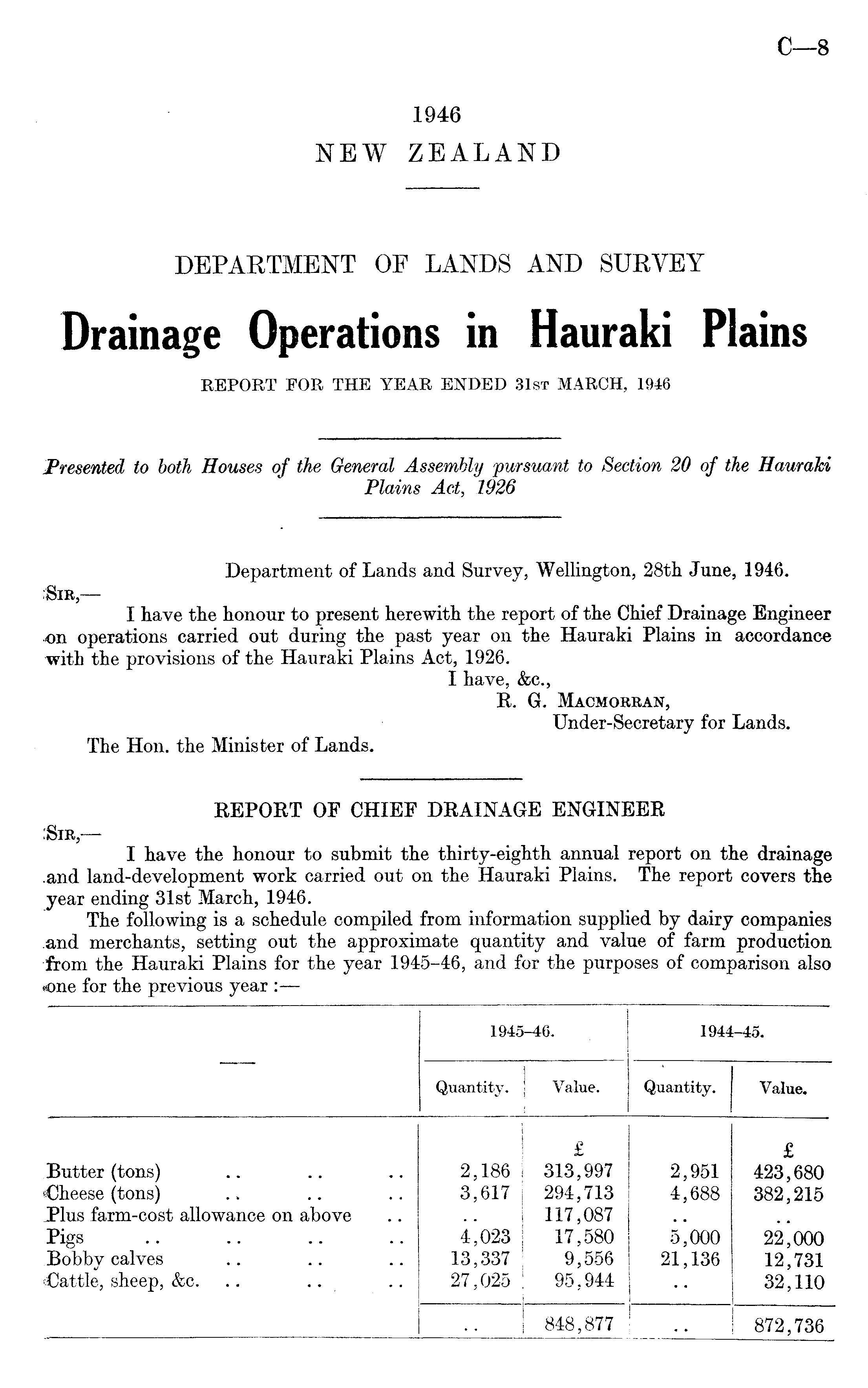 DEPARTMENT OF LANDS AND SURVEY Drainage Operations in Hauraki Plains REPORT FOR THE YEAR ENDED 31st MARCH, 1946