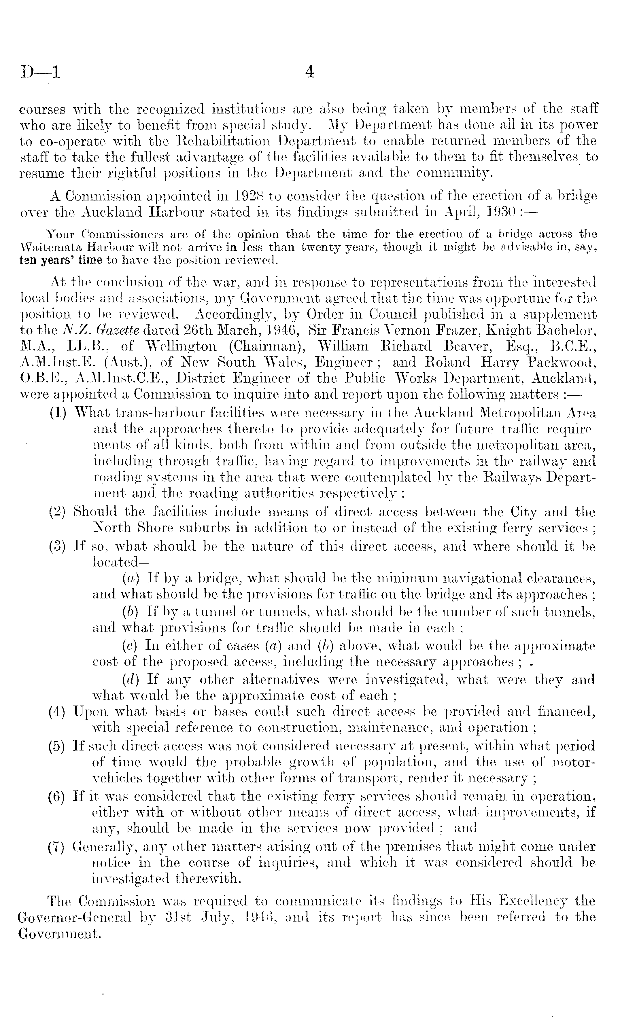 courses with the recognized institutions are also being taken by members of the staff who are likely to benefit from special study. My Department has done all in its power to co-operate with the Rehabilitation Department to enable returned members of the staff to take the fullest advantage of the facilities available to them to fit themselves to resume their rightful positions in the Department and the community. A Commission appointed in 1928 to consider the question of the erection of a bridge over the Auckland Harbour stated in its findings submitted in April, 1930 : Your Commissioners are of the opinion that the time for the erection of a bridge across the Waitemata Harbour will not arrive in less than twenty years, though it might be advisable in, say, ten years' time to have the position reviewed. At the conclusion of the war, and in response to representations from the interested local bodies and associations, my Government agreed that the time was opportune for the position to be reviewed. Accordingly, by Order in Council published in a supplement to the N.Z. Gazette dated 26th March, 1946, Sir Francis Vernon Frazer, Knight Bachelor, M.A., LL.B., of Wellington (Chairman), William Richard Beaver, Esq., 8.C.E., A.M.lnst.E. (Aust.), of New South Wales, Engineer ; and Roland Harry Packwood, 0.8. E., A.M.Inst.C.E., District Engineer of the Public Works Department, Auckland, were appointed a Commission to inquire into and report upon the following matters : (1) What trans-harbour facilities were necessary in the Auckland Metropolitan Area and the approaches thereto to provide adequately for future traffic requirements of all kinds, both from within and from outside the metropolitan area, including through traffic, having regard to improvements in the railway and roading systems in the area that were contemplated by the Railways Department and the roading authorities respectively ; (2) Should the facilities include means of direct access between the City and the North Shore suburbs in addition to or instead of the existing ferry services ; (3) If so, what should be the nature of this direct access, and where should it be located — (a) If by a bridge, what should be the minimum navigational clearances, and what should be the provisions for traffic on the bridge and its approaches ; (b) If by a'tunnel or tunnels, what should be the number of such tunnels, and what provisions for traffic should be made in each ; (c) In either of cases (a) and (b) above, what would be the approximate cost of the proposed access, including the necessary approaches ; - (d) If any other alternatives were investigated, what were they and what would be the approximate cost of each ; (4) Upon what basis or bases could such direct access be provided and financed, with special reference to construction, maintenance, and operation; (5) If such direct access was not considered necessary at present, within what period of time would the probable growth of population, and the use of motorvehicles together with other forms of transport, render it necessary ; (6) If it was considered that the existing ferry services should remain in operation, either with or without other means of direct access, what improvements, if any, should be made in the services now provided ; and (7) Generally, any other matters arising out of the premises that might come under notice in the course of inquiries, and which it was considered should be investigated therewith. The Commission was required to communicate its findings to His Excellency the Governor-General by 31st July, 1946, and its report has since been referred to the Government.