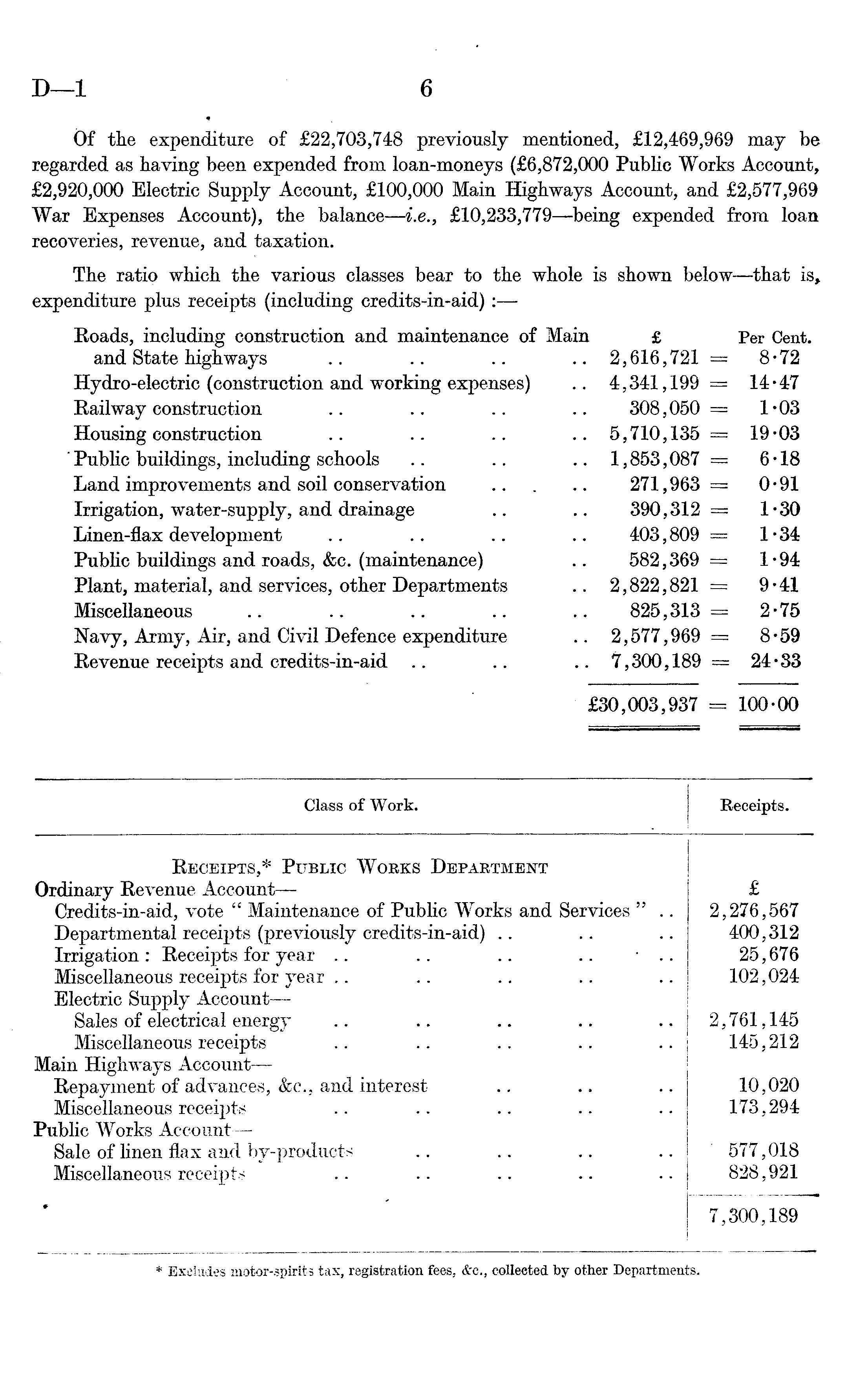 Of the expenditure of £22,703,748 previously mentioned, £12,469,969 may be regarded as having been expended from loan-moneys (£6,872,000 Public Works Account, £2,920,000 Electric Supply Account, £lOO,OOO Main Highways Account, and £2,577,969 War Expenses Account), the balance —i.e., £10,233,779 —being expended from loan recoveries, revenue, and taxation. The ratio which the various classes bear to the whole is shown below —that is, expenditure plus receipts (including credits-in-aid) : Roads, including construction and maintenance of Main £ Per Cent. and State highways .. .. .. .. 2,616,721 = 8-72 Hydro-electric (construction and working expenses) .. 4,341,199= 14-47 Railway construction .. .. .. .. 308,050 = 1 *O3 Housing construction .. .. .. .. 5,710,135 = 19-03 'Public buildings, including schools .. .. .. 1,853,087 = 6-18 Land improvements and soil conservation 271,963 = 0-91 Irrigation, water-supply, and drainage .. .. 390,312 = 1-30 Linen-flax development .. .. .. .. 403,809 = 1-34 Public buildings and roads, &c. (maintenance) .. 582,369 = 1-94 Plant, material, and services, other Departments .. 2,822,821 = 9-41 Miscellaneous .. .. .. .. .. 825,313 = 2-75 Navy, Army, Air, and Civil Defence expenditure .. 2,577,969 = 8-59 Revenue receipts and credits-in-aid .. .. .. 7,300,189 = 24-S3 £30,003,937 = 100-00