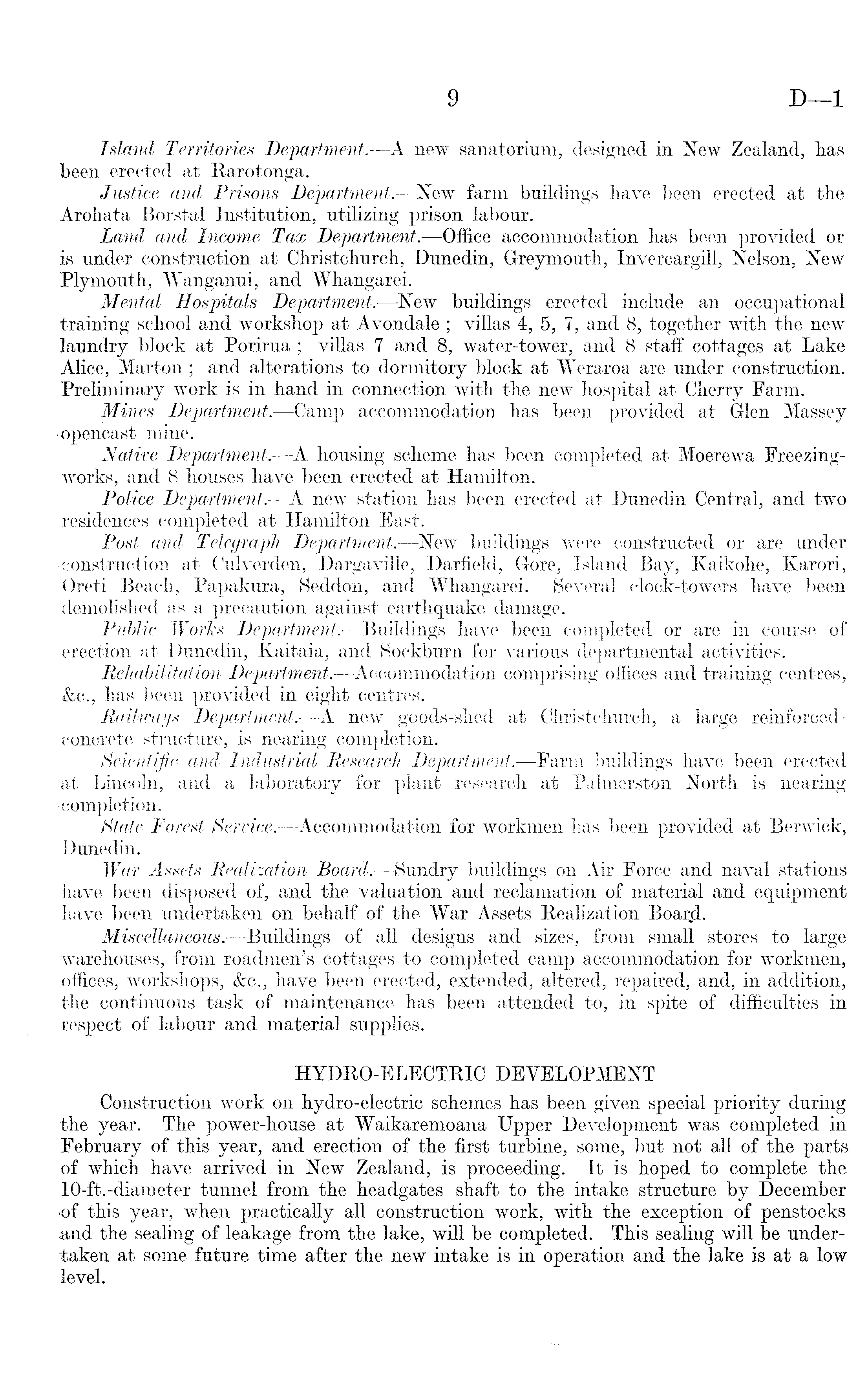 Island Territories Department. —A new sanatorium, designed in New Zealand, has l>een erected at Rarotonga. Justice and Prisons Department.—New farm buildings have been erected at the Arohata Borstal Institution, utilizing prison labour. Land and Income Tax Department.—Office accommodation has been provided or is under construction at Christchurch, Dunedin, Greymouth, Invercargill, Nelson, New Plymouth, Wanganui, and Whangarei. Mental Hospitals Department.—New buildings erected include an occupational training school and workshop at Avondale; villas 4, 5, 7, and 8, together with the new laundry block at Porirua ; villas 7 and 8, water-tower, and 8 staff cottages at Lake Alice, Marton ; and alterations to dormitory block at Weraroa are under construction. Preliminary work is in hand in connection with the new hospital at Cherry Farm. Mines Department.—Camp accommodation has been provided at Glen Massey ■opencast mine. Native Department.—A housing scheme has been completed at Moerewa Freezingworks, and 8 houses have been erected at Hamilton. Police Department.—A new station has been erected at Dunedin Central, and two residences completed at Hamilton East. Post and Telegraph Department.—New buildings were constructed or are under construction at Culverden, Dargaville, Darfield, Gore, Island Bay, Kaikohe, Karori, Oreti Beach, Papakura, Seddon, and Whangarei. Several clock-towers have been •demolished as a precaution against earthquake damage. Public Works Department.—Buildings have been completed or are in course of erection at Dunedin, Kaitaia, and Sockburn for various departmental activities. Rehabilitation Department.—Accommodation comprising offices and training centres, &c., has been provided in eight centres. Railways Department. —A new goods-shed at Christchurch, a large reinforcedconcrete structure, is nearing completion. Scientific and Industrial Research Department.^—Farm buildings have been erected at Lincoln, and a laboratory for plant research at Palmerston North is nearing •completion. State Forest Service.—Accommodation for workmen has been provided at Berwick, Dunedin. War Assets Realization Board. —Sundry buildings on Air Force and naval stations have been disposed of, and the valuation and reclamation of material and equipment have been undertaken on behalf of the War Assets Realization Board. Miscellaneous. —Buildings of all designs and sizes, from small stores to large warehouses, from roadmen's cottages to completed camp accommodation for workmen, offices, workshops, &c., have been erected, extended, altered, repaired, and, in addition, the continuous task of maintenance has been attended to, in spite of difficulties in respect of labour and material supplies. HYDRO-ELECTRIC DEVELOPMENT Construction work on hydro-electric schemes has been given special priority during -the year. The power-house at Waikaremoana Upper Development was completed in February of this year, and erection of the first turbine, some, but not all of the parts of which have arrived in New Zealand, is proceeding. It is hoped to complete the 10-ft.-diameter tunnel from the headgates shaft to the intake structure by December of this year, when practically all construction work, with the exception of penstocks and the sealing of leakage from the lake, will be completed. This sealing will be undertaken at some future time after the new intake is in operation and the lake is at a low level.