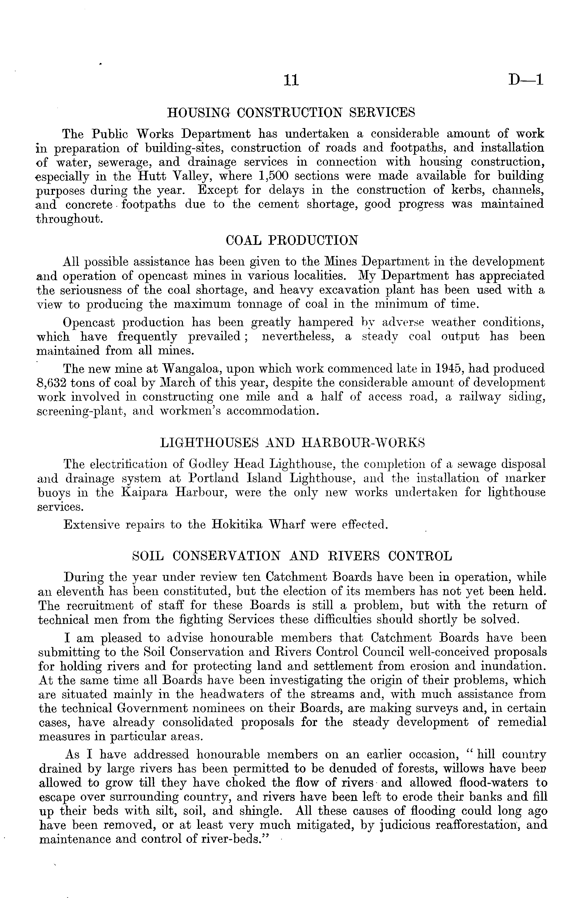 HOUSING CONSTRUCTION SERVICES The Public Works Department lias undertaken a considerable amount of work in preparation of building-sites, construction of roads and footpaths, and installation of water, sewerage, and drainage services in connection with housing construction, especially in the Hutt Valley, where 1,500 sections were made available for building purposes during the year. Except for delays in the construction of kerbs, channels, and concrete footpaths due to the cement shortage, good progress was maintained throughout. COAL PRODUCTION All possible assistance has been given to the Mines Department in the development and operation of opencast mines in various localities. My Department has appreciated the seriousness of the coal shortage, and heavy excavation plant has been used with a view to producing the maximum tonnage of coal in the minimum of time. Opencast production has been greatly hampered by adverse weather conditions, which have frequently prevailed; nevertheless, a steady coal output has been maintained from all mines. The new mine at Wangaloa, upon which work commenced late in 1945, had produced 8,632 tons of coal by March of this year, despite the considerable amount of development work involved in constructing one mile and a half of access road, a railway siding, screening-plant, and workmen's accommodation. LIGHTHOUSES AND HARBOUR-WORKS The electrification of Godley Head Lighthouse, the completion of a sewage disposal and drainage system at Portland Island Lighthouse, and the installation of marker buoys in the Kaipara Harbour, were the only new works undertaken for lighthouse services. Extensive repairs to the Hokitika Wharf were effected. SOIL CONSERVATION AND RIVERS CONTROL During the year under review ten Catchment Boards have been in operation, while an eleventh has been constituted, but the election of its members has not yet been held. The recruitment of staff for these Boards is still a problem, but with the return of technical men from the fighting Services these difficulties should shortly be solved. I am pleased to advise honourable members that Catchment Boards have been submitting to the Soil Conservation and Rivers Control Council well-conceived proposals for holding rivers and for protecting land and settlement from erosion and inundation. At the same time all Boards have been investigating the origin of their problems, which are situated mainly in the headwaters of the streams and, with much assistance from the technical Government nominees on their Boards, are making surveys and, in certain cases, have already consolidated proposals for the steady development of remedial measures in particular areas. As I have addressed honourable members on an earlier occasion, " hill country drained by large rivers has been permitted to be denuded of forests, willows have been allowed to grow till they have choked the flow of rivers and allowed flood-waters to escape over surrounding country, and rivers have been left to erode their banks and fill up their beds with silt, soil, and shingle. All these causes of flooding could long ago have been removed, or at least very much mitigated, by judicious reafforestation, and maintenance and control of river-beds."