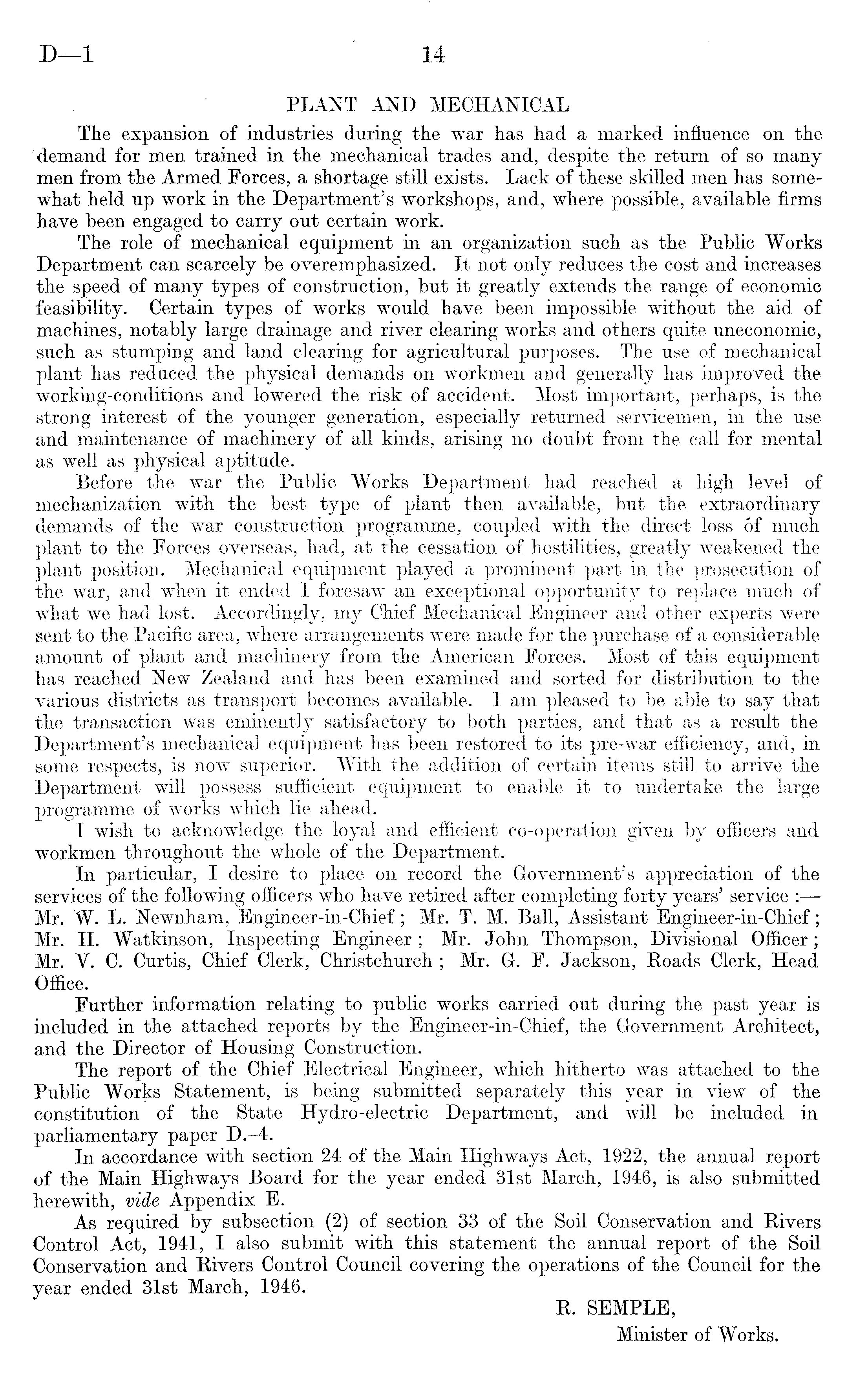 PLANT AND MECHANICAL The expansion of industries during the war has had a marked influence on the demand for men trained in the mechanical trades and, despite the return of so many men from the Armed Forces, a shortage still exists. Lack of these skilled men has somewhat held up work in the Department's workshops, and, where possible, available firms have been engaged to carry out certain work. The role of mechanical equipment in an organization such as the Public Works Department can scarcely be overemphasized. It not only reduces the cost and increases the speed of many types of construction, but it greatly extends the range of economic feasibility. Certain types of works would have been impossible without the aid of machines, notably large drainage and river clearing works and others quite uneconomic, such as stumping and land clearing for agricultural purposes. The use of mechanical plant has reduced the physical demands on workmen and generally has improved the working-conditions and lowered the risk of accident. Most important, perhaps, is the strong interest of the younger generation, especially returned servicemen, in the use and maintenance of machinery of all kinds, arising no doubt from the call for mental as well as physical aptitude. Before the war the Public Works Department had reached a high level of mechanization with the best type of plant then available, but the extraordinary demands of the war construction programme, coupled with the direct loss of much plant to the Forces overseas, had, at the cessation of hostilities, greatly weakened the plant position. Mechanical equipment played a prominent part in the prosecution of the war, and when it ended I foresaw an exceptional opportunity to replace much of what we had lost. Accordingly, my Chief Mechanical Engineer and other experts were sent to the Pacific area, where arrangements were made for the purchase of a considerable amount of plant and machinery from the American Forces. Most of this equipment has reached New Zealand and has been examined and sorted for distribution to the various districts as transport becomes available. I am pleased to be able to say that .the transaction was eminently satisfactory to both parties, and that as a result the Department's mechanical equipment has been restored to its pre-war efficiency, and, in some respects, is now superior. With the addition of certain-items still to arrive the Department will possess sufficient equipment to enable it to undertake the large programme of works which lie ahead. I wish to acknowledge the loyal and efficient co-operation given by officers and workmen throughout the whole of the Department. In particular, I desire to place on record the Government's appreciation of the services of the following officers who have retired after completing forty years' service : Mr. W. L. Newnham, Engineer-in-Chief; Mr. T. M. Ball, Assistant Engineer-in-Chief; Mr. H. Watkinson, Inspecting Engineer; Mr. John Thompson, Divisional Officer; Mr. Y. C. Curtis, Chief Clerk, Christchurch ; Mr. G. F. Jackson, Roads Clerk, Head Office. Further information relating to public works carried out during the past year is included in the attached reports by the Engineer-in-Chief, the Government Architect, and the Director of Housing Construction. The report of the Chief Electrical Engineer, which hitherto was attached to the Public Works Statement, is being submitted separately this year in view of the constitution of the State Hydro-electric Department, and will be included in parliamentary paper D.-4. In accordance with section 24 of the Main Highways Act, 1922, the annual report of the Main Highways Board for the year ended 31st March, 1946, is also submitted herewith, vide Appendix E. As required by subsection (2) of section 33 of the Soil Conservation and Rivers Control Act, 1941, I also submit with this statement the annual report of the Soil Conservation and Rivers Control Council covering the operations of the Council for the year ended 31st March, 1946. R. SEMPLE, Minister of Works.