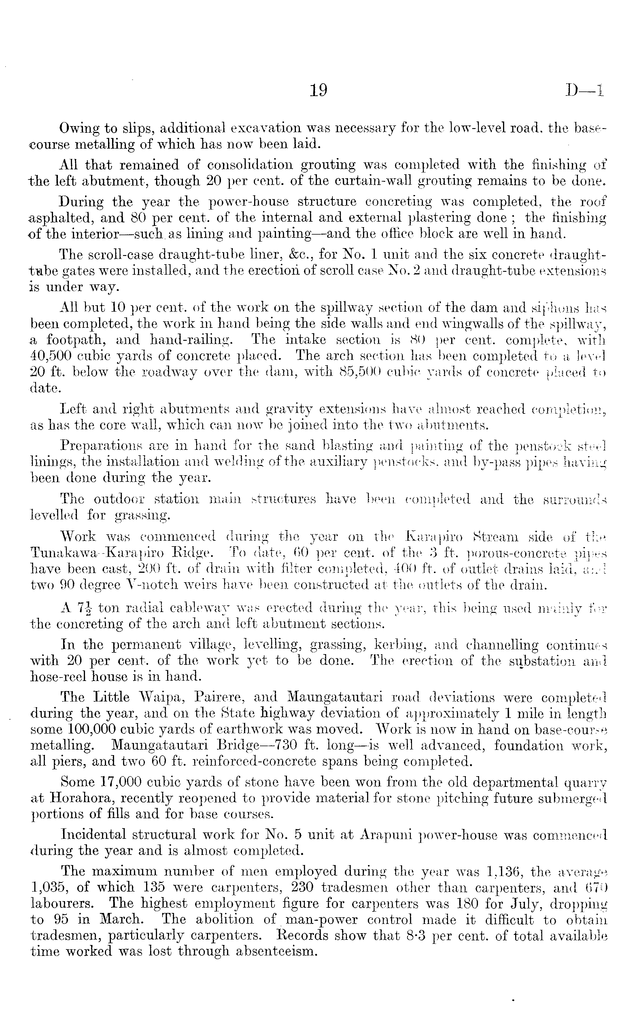 Owing to slips, additional excavation was necessary for the low-level road, the basecourse metalling of which has now been laid. All that remained of consolidation grouting was completed with the finishing of the left abutment, though 20 per cent, of the curtain-wall grouting remains to be done. During the year the power-house structure concreting was completed, the roof asphalted, and 80 per cent, of the internal and external plastering done ; the finishing of the interior—such,as lining and painting —and the office block are well in hand. The scroll-case draught-tube liner, &c., for No. 1 unit and the six concrete draughttube gates were installed, and the erection of scroll case No. 2 and draught-tube extensions is under way. All but 10 per cent, of the work on the spillway section of the dam and siphons has been completed, the work in hand being the side walls and end wingwalls of the spillway, a footpath, and hand-railing. The intake section is 80 per cent, complete, with 40,500 cubic yards of concrete placed. The arch section has been completed to a level 20 ft. below the roadway over the dam, with 85,500 cubic yards of concrete placed to date. Left and right abutments and gravity extensions have almost reached completion, as has the core wall, which can now be joined into the two abutments. Preparations are in hand for the sand blasting and painting of the penstock steel linings, the installation and welding of the auxiliary penstocks, and by-pass pipes having been done during the year. The outdoor station main structures have been completed and the surrounds levelled for grassing. Work was commenced during the year on the Karapiro Stream side of the Tunakawa-Karapiro Ridge. To date, 60 per cent, of the 3 ft. porous-concrete pipes have been cast, 200 ft. of drain with filter completed, 400 ft. of outlet drains laid, and two 90 degree Y-notch weirs have been constructed at the outlets of the drain. A ton radial cable way was erected during the year, this being used mainly for the concreting of the arch and left abutment sections. In the permanent village, levelling, grassing, kerbing, and channelling continues with 20 per cent, of the work yet to be done. The erection of the substation and hose-reel house is in hand. The Little Waipa, Pairere, and Maungatautari road deviations were completed during the year, and on the State highway deviation of approximately 1 mile in length some 100,000 cubic yards of earthwork was moved. Work is now in hand on base-course metalling. Maungatautari Bridge—73o ft. long —is well advanced, foundation work, all piers, and two 60 ft. reinforced-concrete spans being completed. Some 17,000 cubic yards of stone have been won from the old departmental quarry at Horahora, recently reopened to provide material for stone pitching future submerged portions of fills and for base courses. Incidental structural work for No. 5 unit at Arapuni power-house was commenced during the year and is almost completed. The maximum number of men employed during the year was 1,136, the average 1,035, of which 135 were carpenters, 230 tradesmen other than carpenters, and 670 labourers. The highest employment figure for carpenters was 180 for July, dropping to 95 in March. The abolition of man-power control made it difficult to obtain tradesmen, particularly carpenters. Records show that 8-3 per cent, of total available time worked was lost through absenteeism.