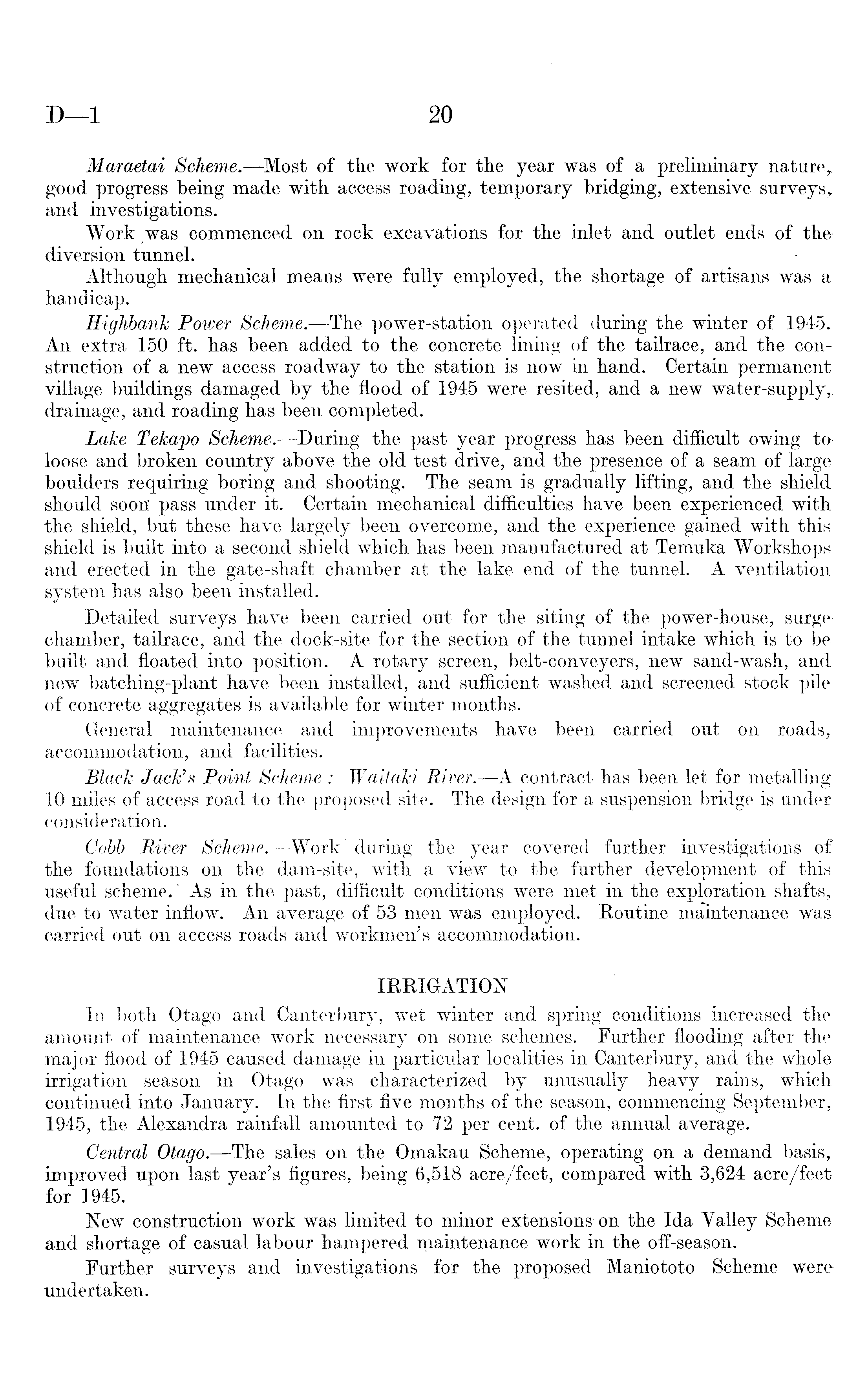 Maraetai Scheme. —Most of the work for the year was of a preliminary nature, good progress being made with access roading, temporary bridging, extensive surveys, and investigations. Work was commenced on rock excavations for the inlet and outlet ends of the diversion tunnel. Although mechanical means were fully employed, the shortage of artisans was a handicap. HighbanJc Poiver Scheme. —The power-station operated during the winter of 1945. An extra 150 ft. has been added to the concrete lining of the tailrace, and the construction of a new access roadway to the station is now in hand. Certain permanent village buildings damaged by the flood of 1945 were resited, and a new water-supply, drainage, and roading has been completed. Lake TeJcapo Scheme. —During the past year progress has been difficult owing toloose and broken country above the old test drive, and the presence of a seam of large boulders requiring boring and shooting. The seam is gradually lifting, and the shield should soon pass under it. Certain mechanical difficulties have been experienced with the shield, but these have largely been overcome, and the experience gained with this shield is built into a second shield which has been manufactured at Temuka Workshops and erected in the gate-shaft chamber at the lake end of the tunnel. A ventilation system has also been installed. Detailed surveys have been carried out for the siting of the power-house, surge chamber, tailrace, and the dock-site for the section of the tunnel intake which is to be built and floated into position. A rotary screen, belt-conveyers, new sand-wash, and new batching-plant have been installed, and sufficient washed and screened stock pile of concrete aggregates is available for winter months. General maintenance and improvements have been carried out on roads, accommodation, and facilities. Black Jack's Point Scheme : Waitaki River. —A contract has been let for metalling 10 miles of access road to the proposed site. The design for a suspension bridge is under consideration. Cobb River Scheme.—Work during the year covered further investigations of the foundations on the dam-site, with a view to the further development of this useful scheme." As in the past, difficult conditions were met in the exploration shafts, due to water inflow. An average of 53 men was employed. Routine maintenance was carried out on access roads and workmen's accommodation. IRRIGATION In both Otago and Canterbury, wet winter and spring conditions increased the amount of maintenance work necessary on some schemes. Further flooding after the major flood of 1945 caused damage in particular localities in Canterbury, and the whole irrigation season in Otago was characterized by unusually heavy rains, which continued into January. In the first five months of the season, commencing September, 1945, the Alexandra rainfall amounted to 72 per cent, of the annual average. Central Otago.—The sales on the Omakau Scheme, operating on a demand basis, improved upon last year's figures, being 6,518 acre/feet, compared with 3,624 acre/feet for 1945. New construction work was limited to minor extensions-on the Ida Yalley Scheme and shortage of casual labour hampered maintenance work in the off-season. Further surveys and investigations for the proposed Maniototo Scheme were undertaken.