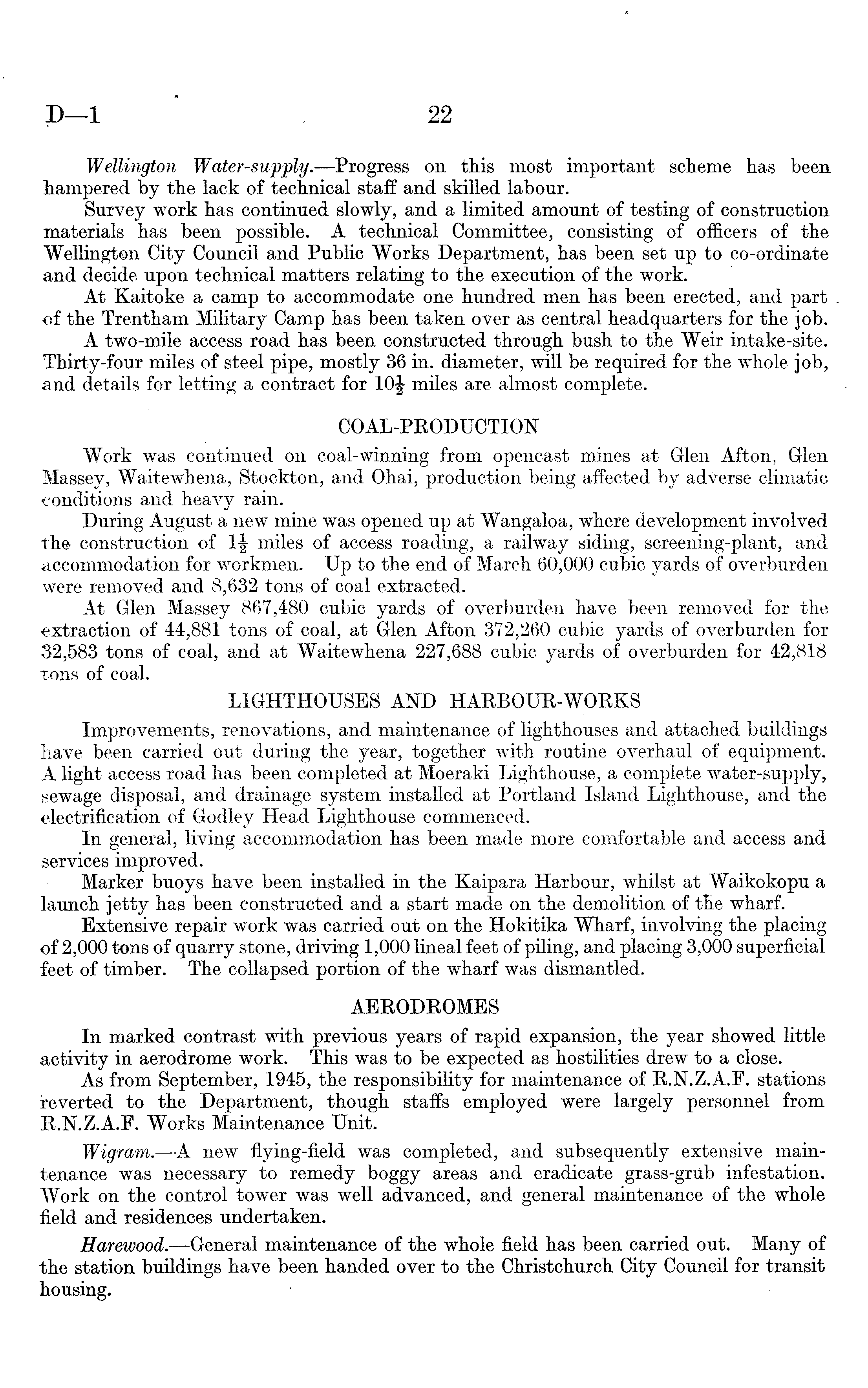 Wellington Water-supply. —Progress on this most important scheme has been hampered by the lack of technical staff and skilled labour. Survey work has continued slowly, and a limited amount of testing of construction materials has been possible. A technical Committee, consisting of officers of the Wellington City Council and Public Works Department, has been set up to co-ordinate and decide upon technical matters relating to the execution of the work. At Kaitoke a camp to accommodate one hundred men has been erected, and part of the Trentham Military Camp has been taken over as central headquarters for the job. A two-mile access road has been constructed through bush to the Weir intake-site. Thirty-four miles of steel pipe, mostly 36 in. diameter, will be required for the whole job, and details for letting a contract for 10£ miles are almost complete. COAL-PRODUCTION Work was continued on coal-winning from opencast mines at Glen Afton, Glen Massey, Waitewhena, Stockton, and Ohai, production being affected by adverse climatic conditions and heavy rain. During August a new mine was opened up at Wangaloa, where development involved construction of miles of access roading, a railway siding, screening-plant, and accommodation for workmen. Up to the end of March 60,000 cubic yards of overburden were removed and 8,632 tons of coal extracted. At Glen Massey 867,480 cubic yards of overburden have been removed for the extraction of 44,881 tons of coal, at Glen Afton 372,260 cubic yards of overburden for 32,583 tons of coal, and at Waitewhena 227,688 cubic yards of overburden for 42,818 tons of coal. LIGHTHOUSES AND HARBOUR-WORKS Improvements, renovations, and maintenance of lighthouses and attached buildings have been carried out during the year, together with routine overhaul of equipment. A light access road has been completed at Moeraki Lighthouse, a complete water-supply, sewage disposal, and drainage system installed at Portland Island Lighthouse, and the electrification of Godley Head Lighthouse commenced. In general, living accommodation has been made more comfortable and access and services improved. Marker buoys have been installed in the Kaipara Harbour, whilst at Waikokopu a launch jetty has been constructed and a start made on the demolition of the wharf. Extensive repair work was carried out on the Hokitika Wharf, involving the placing of 2,000 tons of quarry stone, driving 1,000 lineal feet of piling, and placing 3,000 superficial feet of timber. The collapsed portion of the wharf was dismantled. AERODROMES In marked contrast with previous years of rapid expansion, the year showed little activity in aerodrome work. This was to be expected as hostilities drew to a close. As from September, 1945, the responsibility for maintenance of R.N.Z.A.F. stations reverted to the Department, though staffs employed were largely personnel from R.N.Z.A.F. Works Maintenance Unit. Wigram.—A new flying-field was completed, and subsequently extensive maintenance was necessary to remedy boggy areas and eradicate grass-grub infestation. Work on the control tower was well advanced, and general maintenance of the whole field and residences undertaken. Harewood. —General maintenance of the whole field has been carried out. Many of the station buildings have been handed over to the Christchurch City Council for transit housing.