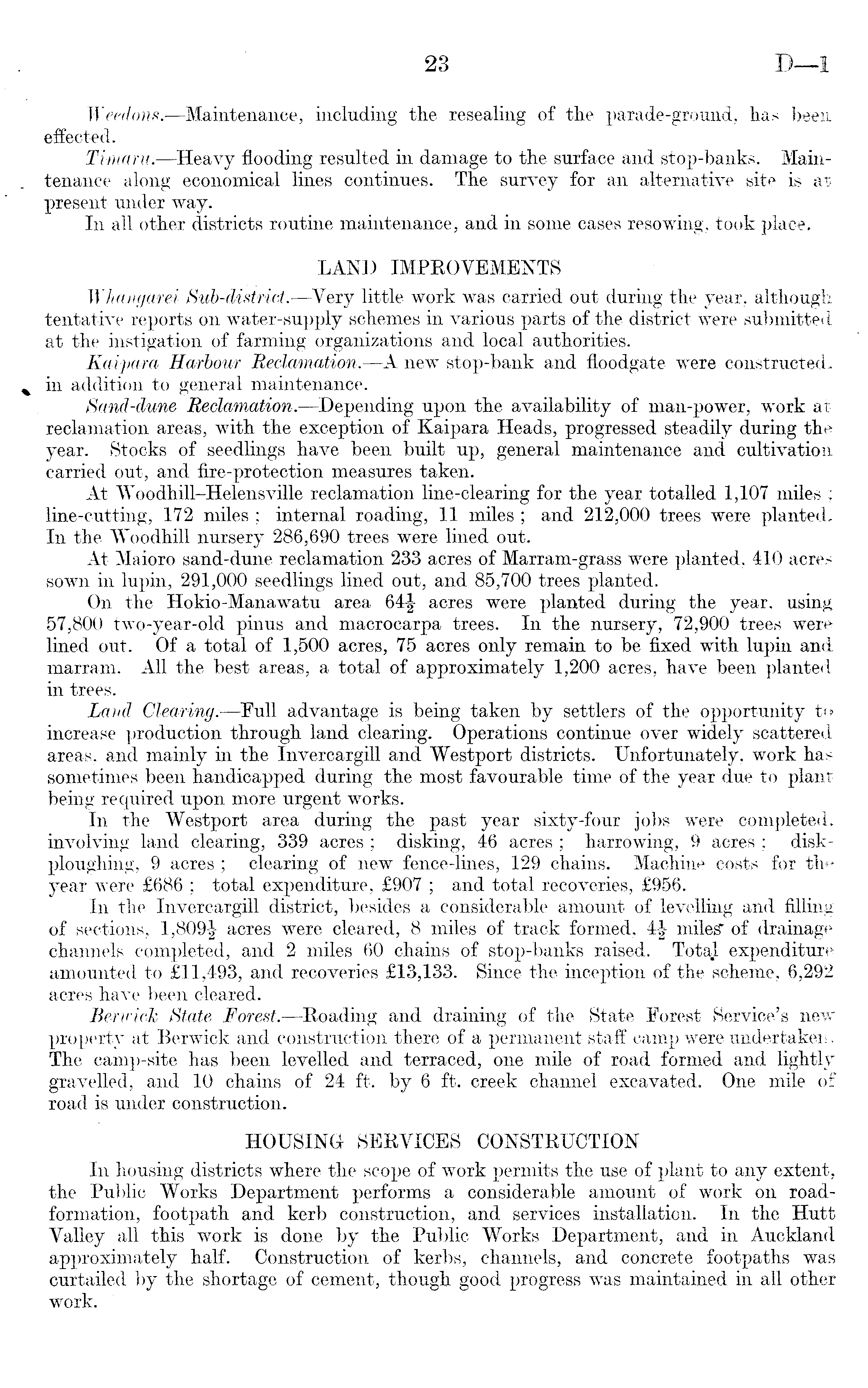 Weedons. —Maintenance, including the resealing of the parade-ground, has been effected. Timaru. —Heavy flooding resulted in damage to the surface and stop-banks. Maintenance along economical lines continues. The survey for an alternative site is at present under way. In all other districts routine maintenance, and in some cases resowing, took place. LAND IMPROVEMENTS Whangarei Sub-district.—Very little work was carried out during the year, although tentative reports on water-supply schemes in various parts of the district were submitted at the instigation of farming organizations and local authorities. Kaipara Harbour Reclamation. —A new stop-bank and floodgate were constructed, in addition to general maintenance. Sand-dune Reclamation. —Depending upon the availability of man-power, work at reclamation areas, with the exception of Kaipara Heads, progressed steadily during the year. Stocks of seedlings have been built up, general maintenance and cultivation carried out, and fire-protection measures taken. At Woodhill-Helensville reclamation line-clearing for the year totalled 1,107 miles ; line-cutting, 172 miles ; internal roading, 11 miles ; and 212,000 trees were planted. In the Woodhill nursery 286,690 trees were lined out. At Maioro sand-dune reclamation 233 acres of Marram-grass were planted, 410 acres sown in lupin, 291,000 seedlings lined out, and 85,700 trees planted. On the Hokio-Manawatu area acres were planted during the year, using 57,800 two-year-old pinus and macrocarpa trees. In the nursery, 72,900 trees were lined out. Of a total of 1,500 acres, 75 acres only remain to be fixed with lupin and marram. All the best areas, a total of approximately 1,200 acres, have been planted in trees. Land Clearing.—Full advantage is being taken by settlers of the opportunity to increase production through land clearing. Operations continue over widely scattered areas, and mainly in the Invercargill and Westport districts. Unfortunately, work has sometimes been handicapped during the most favourable time of the year due to plantbeing required upon more urgent works. In the Westport area during the past year sixty-four jobs were completed, involving land clearing, 339 acres ; disking, 46 acres ; harrowing, 9 acres ; diskploughing, 9 acres ; clearing of new fence-lines, 129 chains. Machine costs for the year were £686 ; total expenditure, £907 ; and total recoveries, £956. In the Invercargill district, besides a considerable amount of levelling and filling of sections, acres were cleared, 8 miles of track formed, 4£ mileg" of drainage channels completed, and 2 miles 60 chains of stop-banks raised. Total expenditure amounted to £11,493, and recoveries £13,133. Since the inception of the scheme, 6,292 acres have been cleared. Berwick State Forest.—Roading and draining of the State Forest Service's new property at Berwick and construction there of a permanent staff camp were undertaken. The camp-site has been levelled and terraced, one mile of road formed and lightly gravelled, and 10 chains of 24 ft. by 6 ft. creek channel excavated. One mile of road is under construction. HOUSING SERVICES CONSTRUCTION In housing districts where the scope of work permits the use of plant to any extent, the Public Works Department performs a considerable amount of work on roadformation, footpath and kerb construction, and services installation. In the Hutt Valley all this work is done by the Public Works Department, and in Auckland approximately half. Construction of kerbs, channels, and concrete footpaths was curtailed by the shortage of cement, though good progress was maintained in all other work.