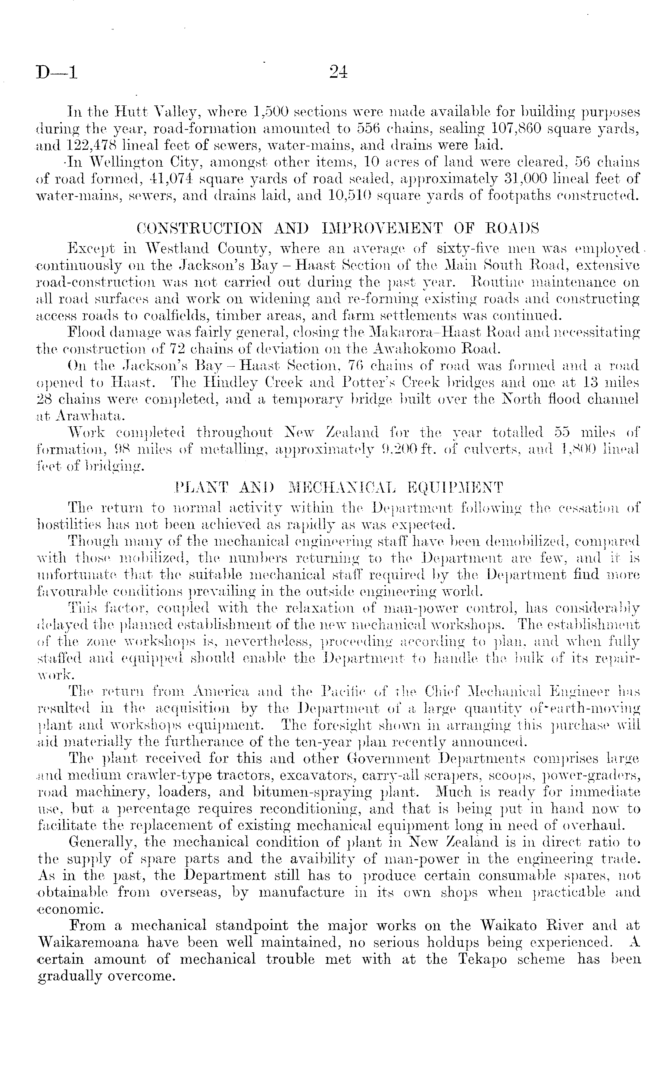 In the Hutt Valley, where 1,500 sections were made available for building purposes during the year, road-formation amounted to 556 chains, sealing 107,860 square yards, and 122,478 lineal feet of sewers, water-mains, and drains were laid. •In Wellington City, amongst other items, 10 acres of land were cleared, 56 chains of road formed, 41,074 square yards of road sealed, approximately 31,000 lineal feet of water-mains, sewers, and drains laid, and 10,510 square yards of footpaths constructed. CONSTRUCTION AND IMPROVEMENT OF ROADS Except in Westland County, where an average of sixty-five men was employed ■continuously on the Jackson's Bay - Haast Section of the Main South Road, extensive road-construction was not carried out during the past year. Routine maintenance on all road surfaces and work on widening and re-forming existing roads and constructing access roads to coalfields, timber areas, and farm settlements was continued. Flood damage was fairly general, closing the Makarora-Haast Road and necessitating the construction of 72 chains of deviation on the Awahokomo Road. On the Jackson's Bay - Haast-Section, 76 chains of road was formed and a road opened to Haast. The Hindley Creek and Potter's Creek bridges and one at 13 miles 28 chains were completed, and a temporary bridge built over the North flood channel at Arawhata. Work completed throughout New Zealand for the year totalled 55 miles of formation, 98 miles of metalling, approximately 9,200 ft. of culverts, and 1,800 lineal feet of bridging. PLANT AND MECHANICAL EQUIPMENT The return to normal activity within the Department following the cessation of hostilities has not been achieved as rapidly as was expected. Though many of the mechanical engineering staff have been demobilized, compared with those mobilized, the numbers returning to the Department are few, and it is unfortunate that the suitable mechanical staff required by the Department find more favourable conditions prevailing in the outside engineering world. This factor, coupled with the relaxation of man-power control, has considerably delayed the planned establishment of the new mechanical workshops. The establishment of the zone workshops is, nevertheless, proceeding according to plan, and when fully staffed and equipped should enable the Department to handle the bulk of its repairwork. The return from America and the Pacific of the Chief Mechanical Engineer has resulted in the acquisition by the Department of a large quantity of* earth-moving plant and workshops equipment. The foresight shown in arranging this purchase will aid materially "the furtherance of the ten-year plan recently announced. The plant received for this and other Government Departments comprises large and medium crawler-type tractors, excavators, carry-all scrapers, scoops, power-graders, road machinery, loaders, and bitumen-spraying plant. Much is ready for immediate use, but a percentage requires reconditioning, and that is being put in hand now to facilitate the replacement of existing mechanical equipment long in need of overhaul. Generally, the mechanical condition of plant in New Zealand is in direct ratio to the supply of spare parts and the avaibility of man-power in the engineering trade. As in the past, the Department still has to produce certain consumable spares, not obtainable from overseas, by manufacture in its own shops when practicable and economic. From a mechanical standpoint the major works on the Waikato River and at Waikaremoana have been well maintained, no serious holdups being experienced. A certain amount of mechanical trouble met with at the Tekapo scheme has been gradually overcome.