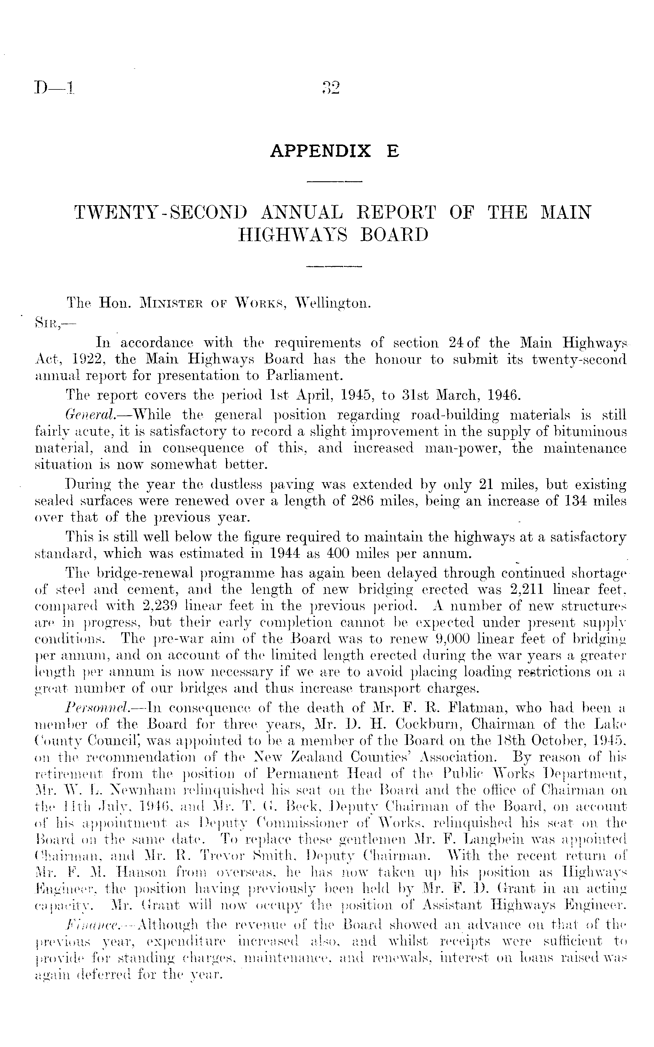 APPENDIX E TWENTY-SECOND ANNUAL REPORT OF THE MAIN HIGHWAYS BOARD The Hon. Minister of Works, Wellington. Sir, — In accordance with the requirements of section 24 of the Main HighwaysAct, 1922, the Main Highways Board has the honour to submit its twenty-second annual report for presentation to Parliament. The report covers the period Ist April, 1945, to 31st March, 1946. General. —While the general position regarding road-building materials is still fairly acute, it is satisfactory to record a slight improvement in the supply of bituminous material, and in consequence of this, and increased man-power, the maintenance situation is now somewhat better. During the year the dustless paving was extended by only 21 miles, but existing sealed surfaces were renewed over a length of 286 miles, being an increase of 134 miles over that of the previous year. This is still well below the figure required to maintain the highways at a satisfactory standard, which was estimated in 1944 as 400 miles per annum. The bridge-renewal programme has again been delayed through continued shortage of steel and cement, and the length of new bridging erected was 2,211 linear feet, compared with 2,239 linear feet in the previous period. A number of new structures are in progress, but their early completion cannot be expected under present supply conditions. The pre-war aim of the Board was to renew 9,000 linear feet of bridging per annum, and on account of the limited length erected during the war years a greater length per annum is now necessary if we are to avoid placing loading restrictions on a great number of our bridges and thus increase transport charges. Personnel. —In consequence of the death of Mr. F. R. Flatman, who had been a member of the Board for three years, Mr. D. H. Cockburn, Chairman of the Lake County Council* was appointed to be a member of the Board on the 18th October, 1945, on the recommendation of the New Zealand Counties' Association. By reason of his retirement from the position of Permanent Head of the Public Works Department, Mr. W. L. Newnham relinquished his seat on the Board and the office of Chairman on the 11th July, 1946, and Mr. T. G. Beck, Deputy Chairman of the Board, on account of his appointment as Deputy Commissioner of Works, relinquished his seat on the Board on the same date. To replace these gentlemen Mr. F. Langbein was appointed Chairman, and Mr. R. Trevor Smith, Deputy Chairman. With the recent return of Mr. F. M. Hanson from overseas, he has now taken up his position as Highways Engineer, the position having previously been held by Mr. F. D. Grant in an acting capacity. Mr. Grant will now occupy the position of Assistant Highways Engineer. Finance.—Although the revenue of the Board showed an advance on that of the previous year, expenditure increased also, and whilst receipts were sufficient to provide for standing charges, maintenance, and renewals, interest on loans raised was again deferred for the year.