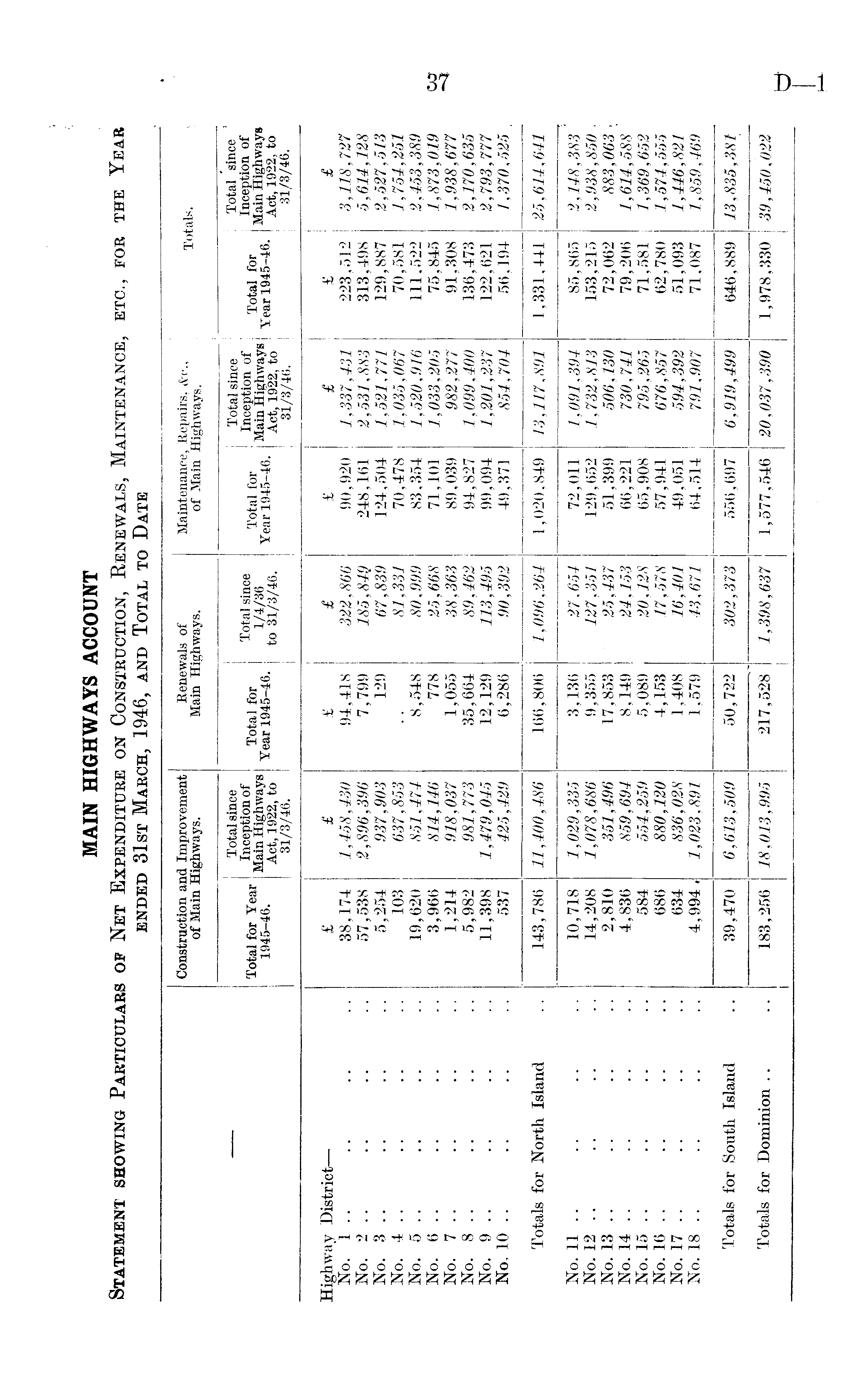 MAIN HIGHWAYS ACCOUNT Statement showing Particulars of Net Expenditure on Construction, Renewals, Maintenance, etc., for the Year ended 31st March, 1946, and Total to Date