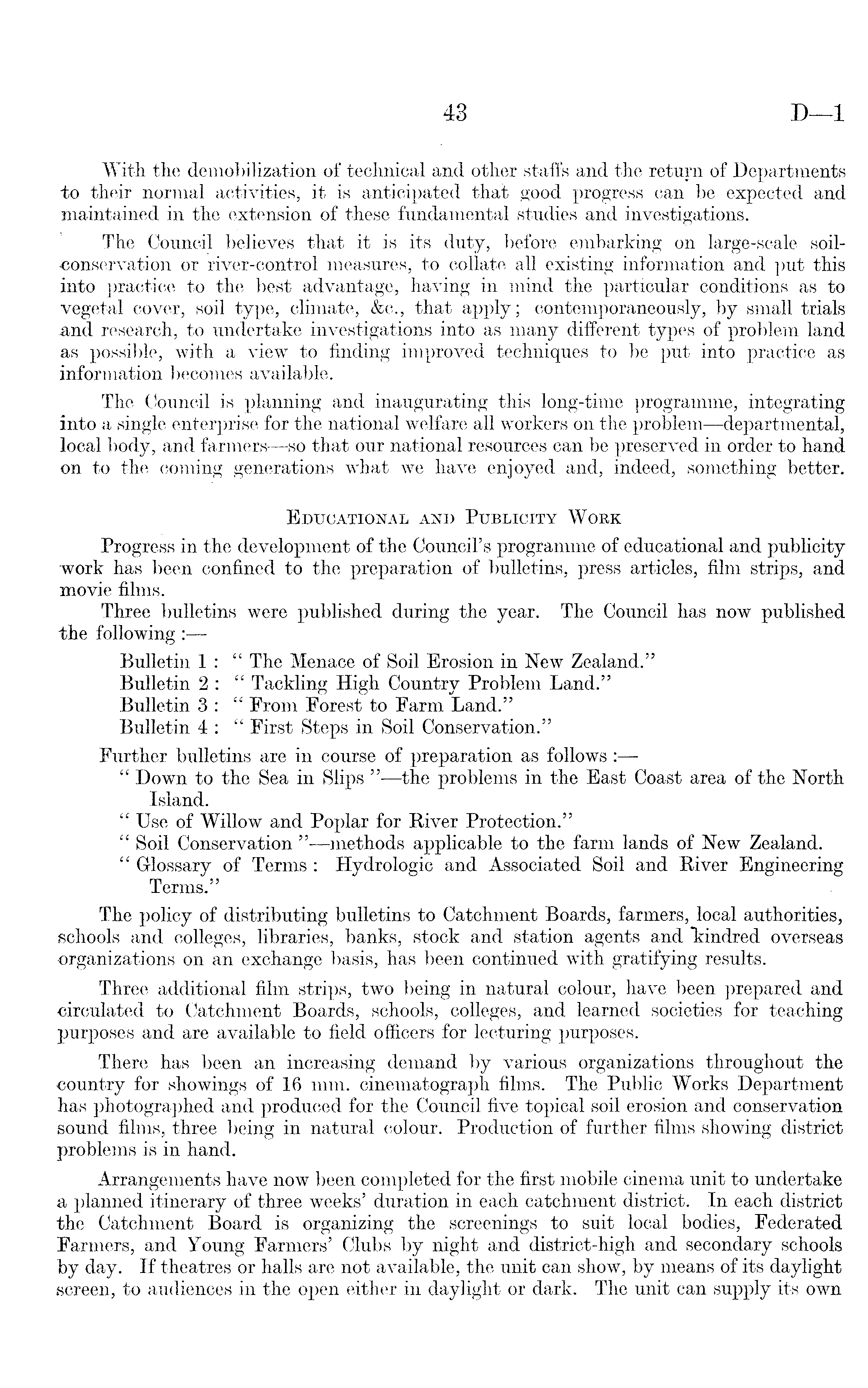 With, the demobilization of technical and other staffs and the return of Departments to their normal activities, it is anticipated that good progress can be expected and maintained in the extension of these fundamental studies and investigations. The Council believes that it is its duty, before embarking on large-scale soil•conservation or river-control measures, to collate all existing information and put this into practice to the best advantage, having in mind the particular conditions as to vegetal cover, soil type, climate, &c., that apply; contemporaneously, by small trials and research, to undertake investigations into as many different types of problem land as possible, with a view to finding improved techniques to be put into practice as information becomes available. The Council is planning and inaugurating this long-time programme, integrating into a single enterprise for the national welfare all workers on the problem—departmental, local body, and farmers —so that our national resources can be preserved in order to hand on to the coming generations what we have enjoyed and, indeed, something better. Educational and Publicity Work Progress in the development of the Council's programme of educational and publicity work has been confined to the preparation of bulletins, press articles, film strips, and movie films. Three bulletins were published during the year. The Council has now published the following : Bulletin 1 : " The Menace of Soil Erosion in New Zealand." Bulletin 2 : " Tackling High Country Problem Land." Bulletin 3 : " From Forest to Farm Land." Bulletin 4 : " First Steps in Soil Conservation." Further bulletins are in course of preparation as follows : " Down to the Sea in Slips " —the problems in the East Coast area of the North Island. " Use of Willow and Poplar for River Protection." " Soil Conservation " —methods applicable to the farm lands of New Zealand. " Glossary of Terms : Hydrologic and Associated Soil and River Engineering Terms." The policy of distributing bulletins to Catchment Boards, farmers, local authorities, schools and colleges, libraries, banks, stock and station agents and "kindred overseas organizations on an exchange basis, has been continued with gratifying results. Three' additional film strips, two being in natural colour, have been prepared and circulated to Catchment Boards, schools, colleges, and learned societies for teaching purposes and are available to field officers for lecturing purposes. There has been an increasing demand by various organizations throughout the country for showings of 16 mm. cinematograph films. The Public Works Department has photographed and produced for the Council five topical soil erosion and conservation sound films, three being in natural colour. Production of further films showing district problems is in hand. Arrangements have now been completed for the first mobile cinema unit to undertake a planned itinerary of three weeks' duration in each catchment district. In each district the Catchment Board is organizing the screenings to suit local bodies, Federated Farmers, and Young Farmers' Clubs by night and district-high and secondary schools by day. If theatres or halls are not available, the unit can show, by means of its daylight screen, to audiences in the open either in daylight or dark. The unit can supply its own