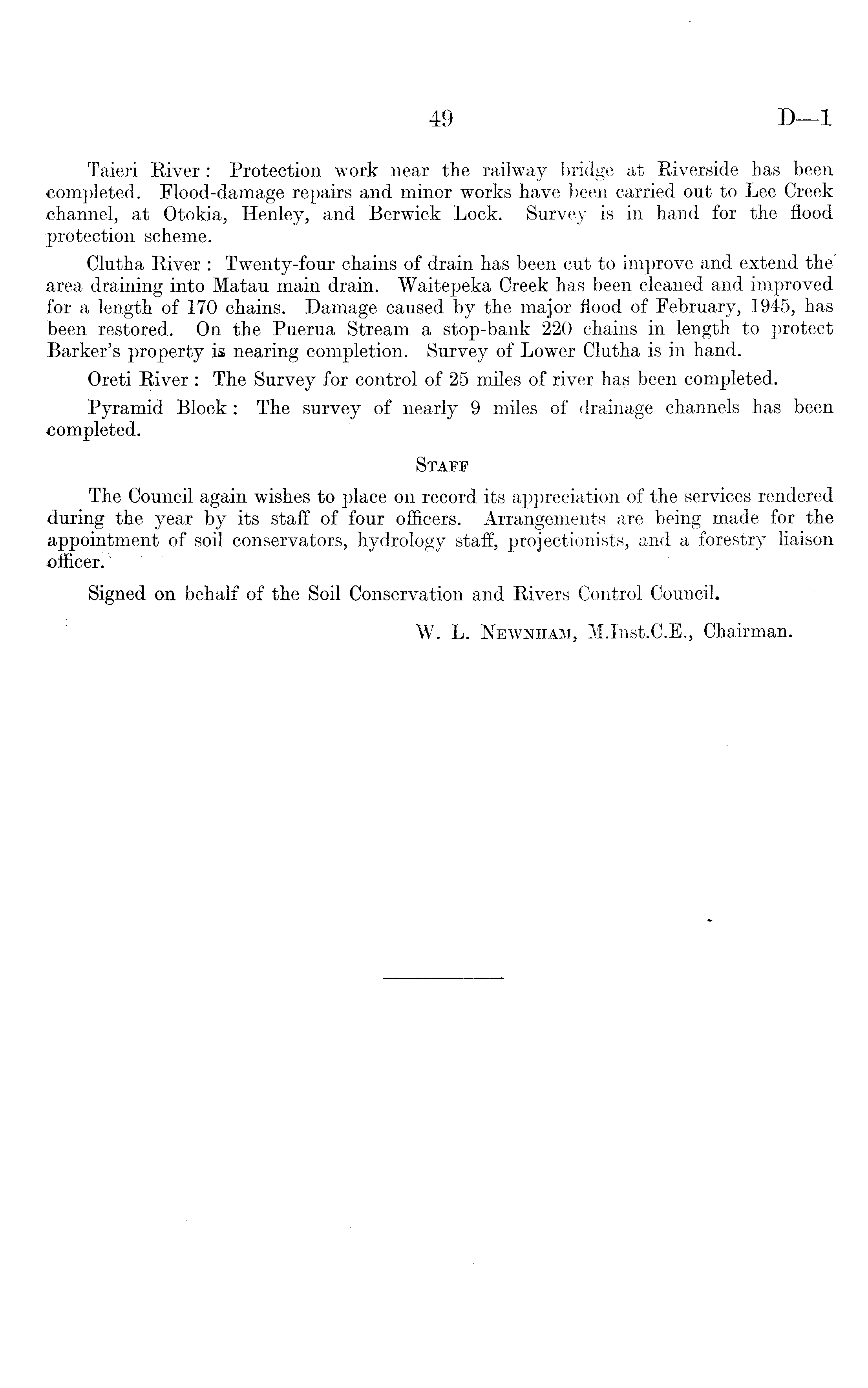 Taieri River: Protection work near the railway bridge at Riverside has been completed. Flood-damage repairs and minor works have been carried out to Lee Creek channel, at Otokia, Henley, and Berwick Lock. Survey is in hand for the flood protection scheme. Clutha River : Twenty-four chains of drain has been cut to improve and extend the' area draining into Matau main drain. Waitepeka Creek has been cleaned and improved for a length of 170 chains. Damage caused by the major flood of February, 1945, has been restored. On the Puerua Stream a stop-bank 220 chains in length to protect Barker's property is nearing completion. Survey of Lower Clutha is in hand. Oreti River : The Survey for control of 25 miles of river has been completed. Pyramid Block : The survey of nearly 9 miles of drainage channels has been completed. Staff The Council again wishes to place on record its appreciation of the services rendered during the year by its staff of four officers. Arrangements are being made for the appointment of soil conservators, hydrology staff, projectionists, and a forestry liaison officer. Signed on behalf of the Soil Conservation and Rivers Control Council. W. L. Newnham, M.lnst.C.E., Chairman.