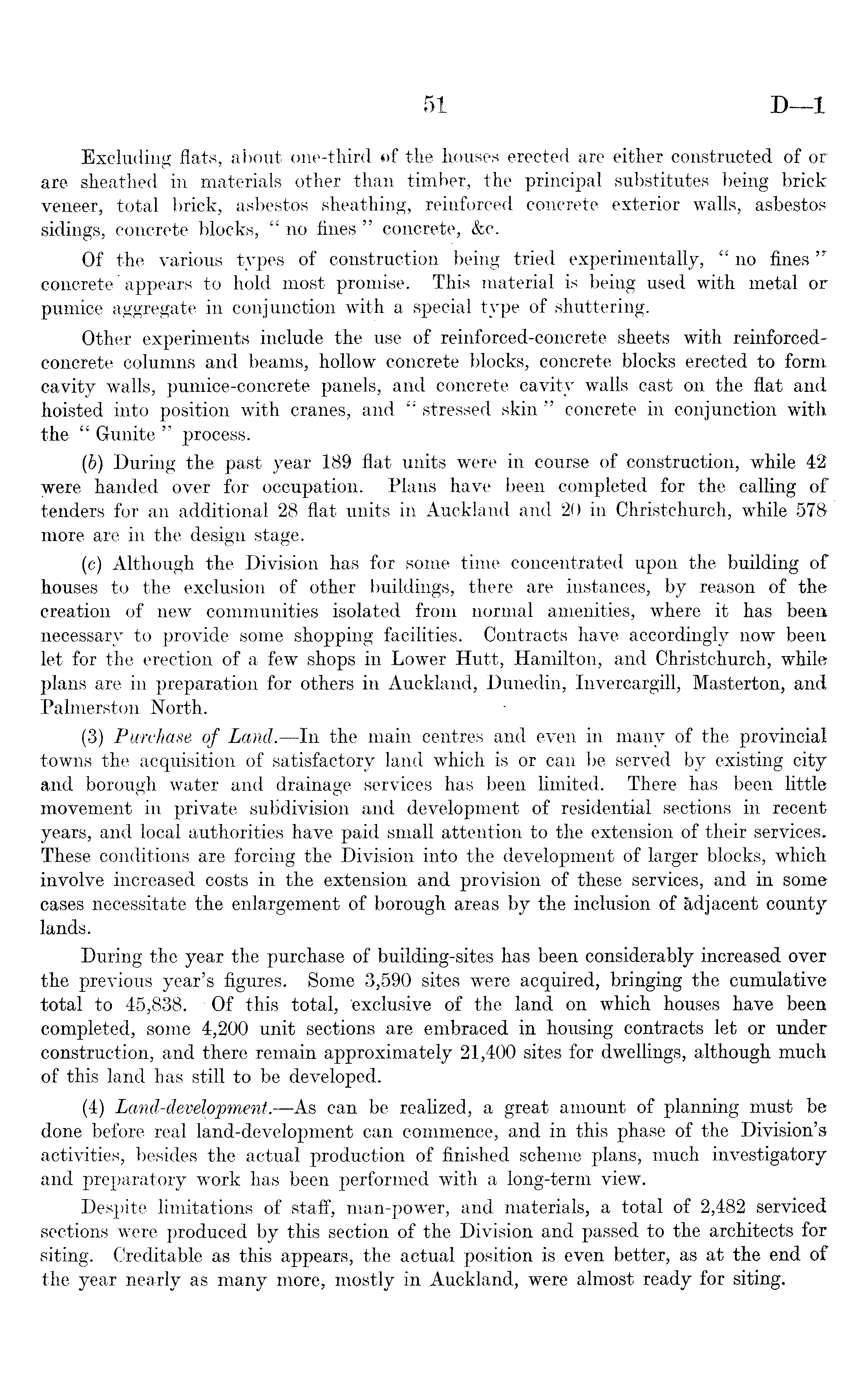 Excluding flats, about one-third of the houses erected are either constructed of or are sheathed in materials other than timber, the principal substitutes being brick veneer, total brick, asbestos sheathing, reinforced concrete exterior walls, asbestossidings, concrete blocks, " no fines " concrete, &c. Of the various types of construction being tried experimentally, "no fines " concrete appears to hold most promise. This material is being used with metal or pumice aggregate in conjunction with a special type of shuttering. Other experiments include the use of reinforced-concrete sheets with reinforcedconcrete columns and beams, hollow concrete blocks, concrete blocks erected to form cavity walls, pumice-concrete panels, and concrete cavity walls cast on the flat and hoisted into position with cranes, and " stressed skin " concrete in conjunction with the " Gunite " process. (b) During the past year 189 flat units were in course of construction, while 42 were handed over for occupation. Plans have been completed for the calling of tenders for an additional 28 flat units in Auckland and 20 in Christchurch, while 578 more are in the design stage. (c) Although the Division has for some time concentrated upon the building of houses to the exclusion of other buildings, there are instances, by reason of the creation of new communities isolated from normal amenities, where it has been necessary to provide some shopping facilities. Contracts have accordingly now been let for the erection of a few shops in Lower Hutt, Hamilton, and Christchurch, while plans are in preparation for others in Auckland, Dunedin, Invercargill, Masterton, and Palmerston North. (3) Purchase of Land. —In the main centres and even in many of the provincial towns the acquisition of satisfactory land which is or can be served by existing city and borough water and drainage services has been limited. There has been little movement in private subdivision and development of residential sections in recent years, and local authorities have paid small attention to the extension of their services. These conditions are forcing the Division into the development of larger blocks, which involve increased costs in the extension and provision of these services, and in some cases necessitate the enlargement of borough areas by the inclusion of adjacent county lands. During the year the purchase of building-sites has been considerably increased over the previous year's figures. Some 3,590 sites were acquired, bringing the cumulative total to 45,838. Of this total, exclusive of the land on which houses have been completed, some 4,200 unit sections are embraced in housing contracts let or under construction, and there remain approximately 21,400 sites for dwellings, although much of this land has still to be developed. (4) Land-development.—As can be realized, a great amount of planning must be done before real land-development can commence, and in this phase of the Division's activities, besides the actual production of finished scheme plans, much investigatory and preparatory work has been performed with a long-term view. Despite limitations of staff, man-power, and materials, a total of 2,482 serviced sections were produced by this section of the Division and passed to the architects for siting. Creditable as this appears, the actual position is even better, as at the end of the year nearly as many more, mostly in Auckland, were almost ready for siting.