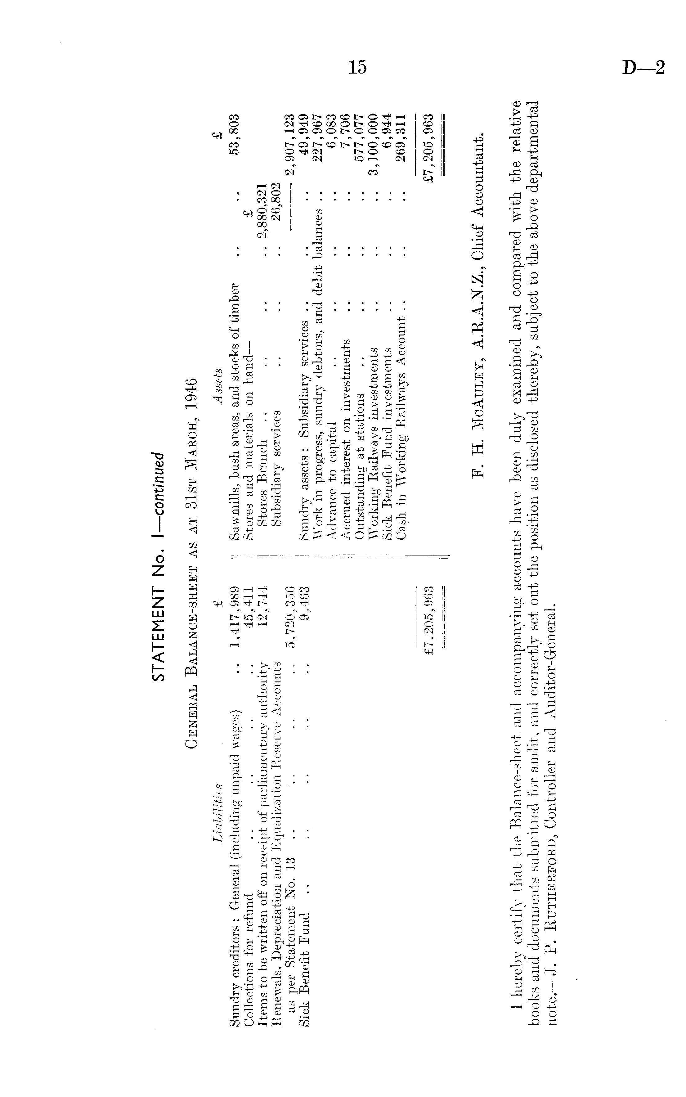 STATEMENT No. I —continued General Balance-sheet as at 31st March, 1946 Liabilities £ Assets £ Sundry creditors : General (including unpaid wages) .. 1,417,989 Sawmills, bush areas, and stocks of timber .. .. 53,803 Collections for refund .. .. .. .. 45,411 Stores and materials on hand— £ Items to be written off on receipt of parliamentary authority 12,744 Stores Branch .. .. .. .. 2,880,321 Renewals, Depreciation and Equalization Reserve Accounts Subsidiary services .. .. .. 26,802 as per Statement No. 13 . - . .. .. 5,720,356 2,907,123 Sick Benefit Fund .. .. .. .. .. 9,463 Sundry assets: Subsidiary services .. .. .. 49,949 Work in progress, sundry debtors, and debit balances .. 227,967 Advance to capital .. .. .. .. 6,083 Accrued interest on investments .. .. .. 7,706 Outstanding at stations .. .. .. .. 577,077 Working Railways investments .. .. .. 3,100,000 Sick Benefit Fund investments .. .. .. 6,944 Cash in Working Railways Account .. .. .. 269,311 £7,205,963 £7,205,963 F. H. McAuley, A.R.A.N.Z., Chief Accountant. I hereby certify that the Balance-sheet and accompanying accounts have been duly examined and compared with the relative books and documents submitted for audit, and correctly set out the position as disclosed thereby, subject to the above departmental note.—J. P. Rutherford, Controller and Auditor-General.